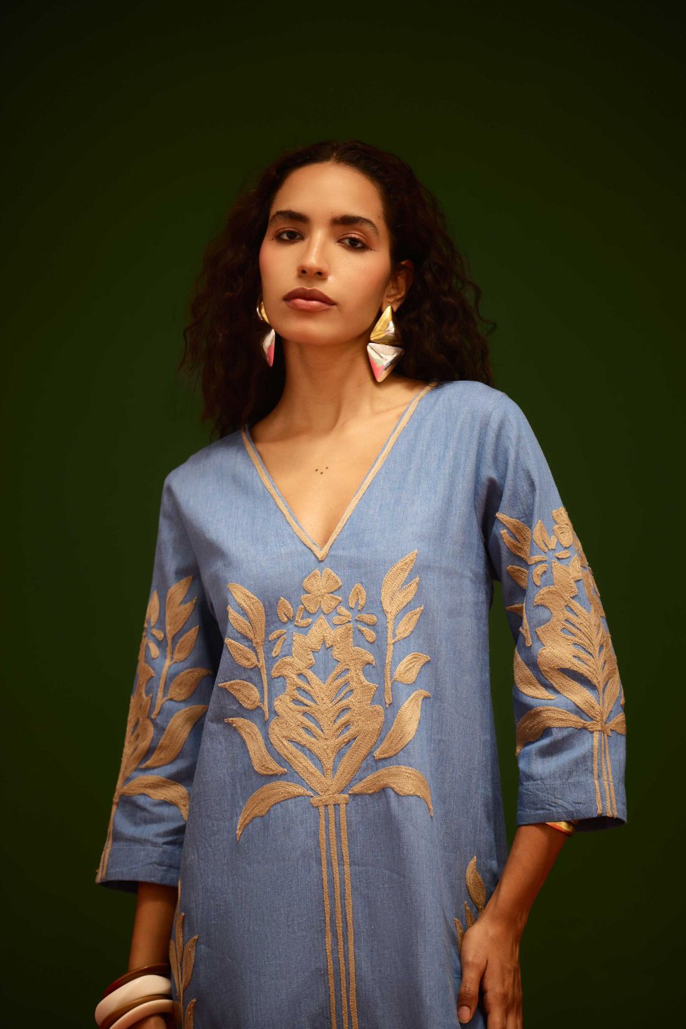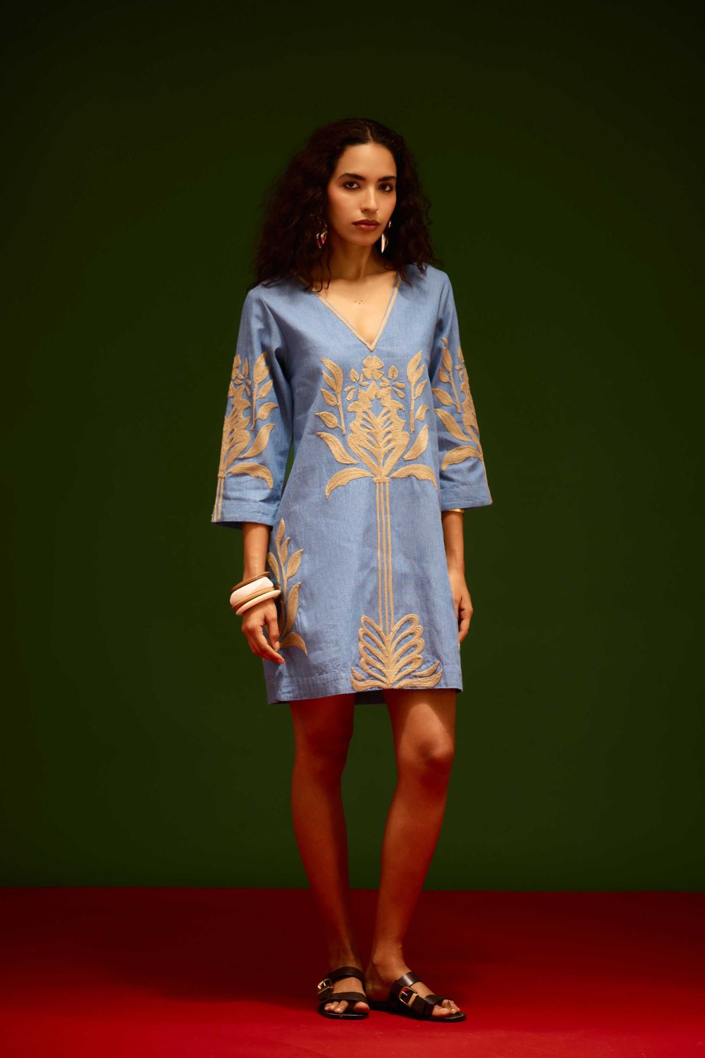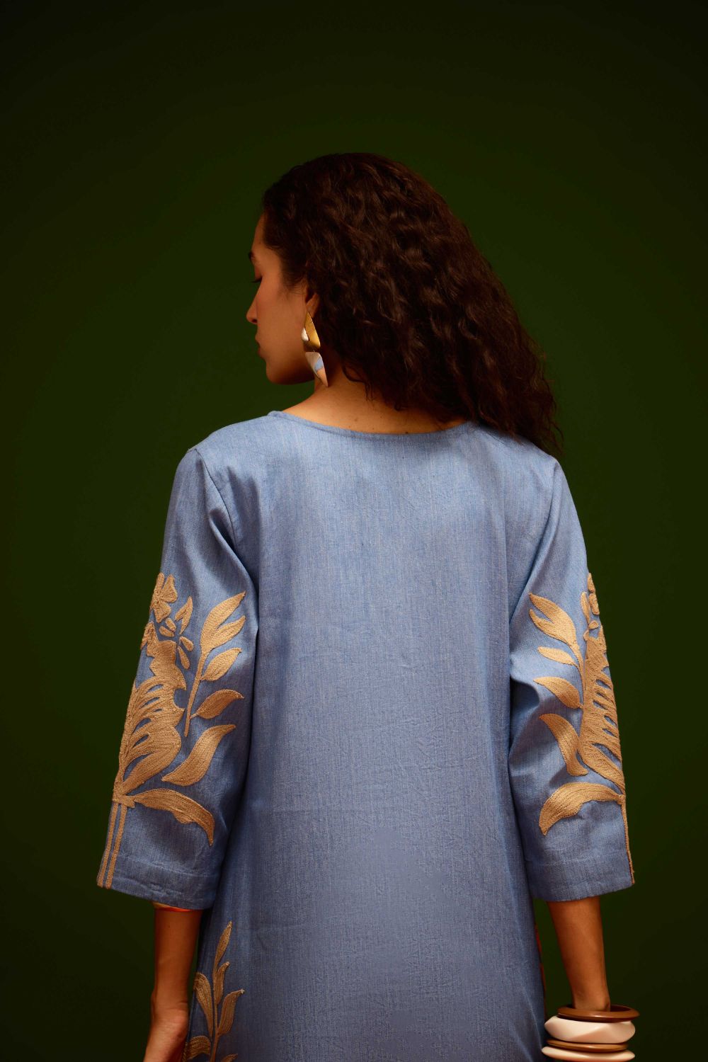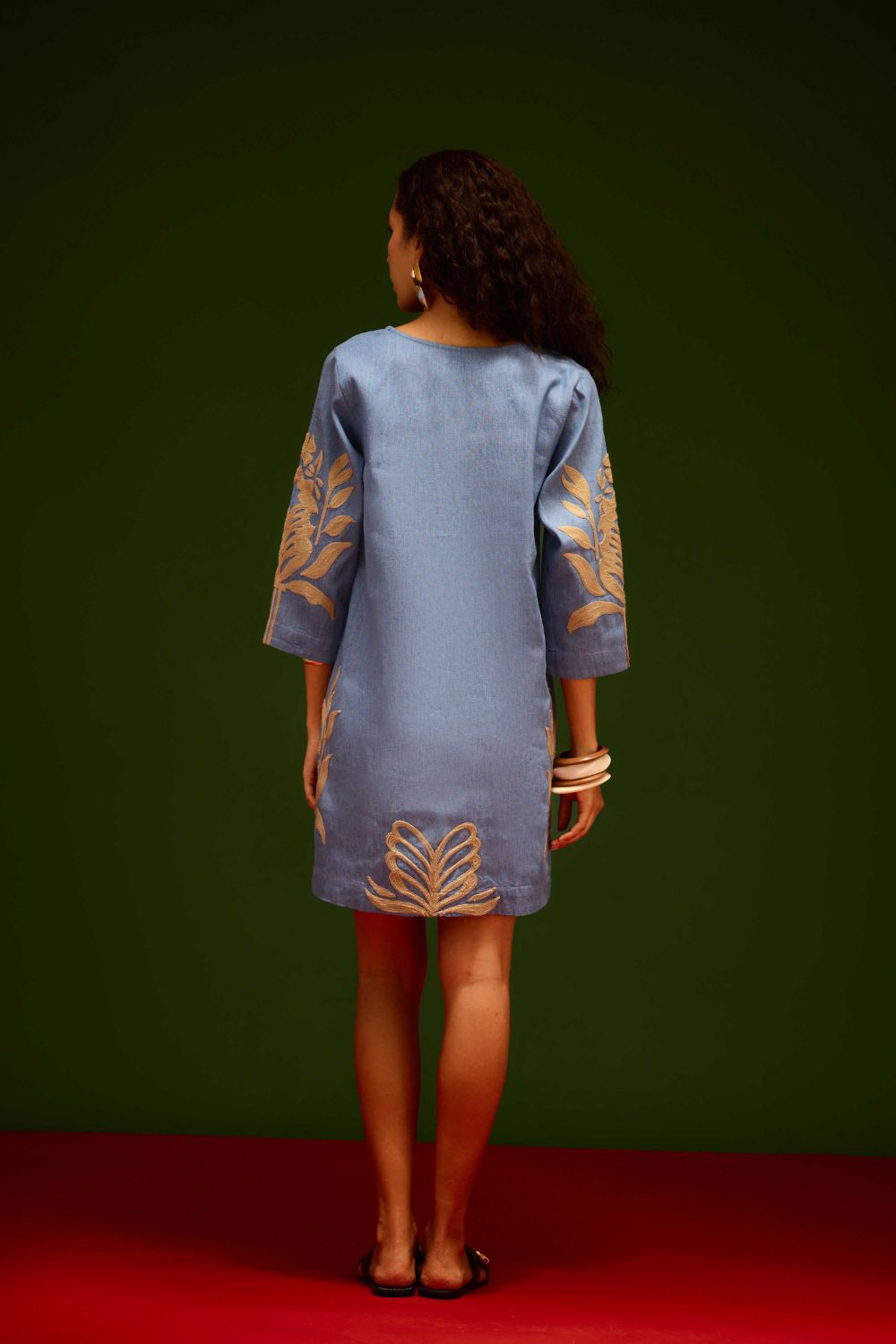 Denim Blue Cotton Shift Dress with Natural Tulip Thread Embroidery