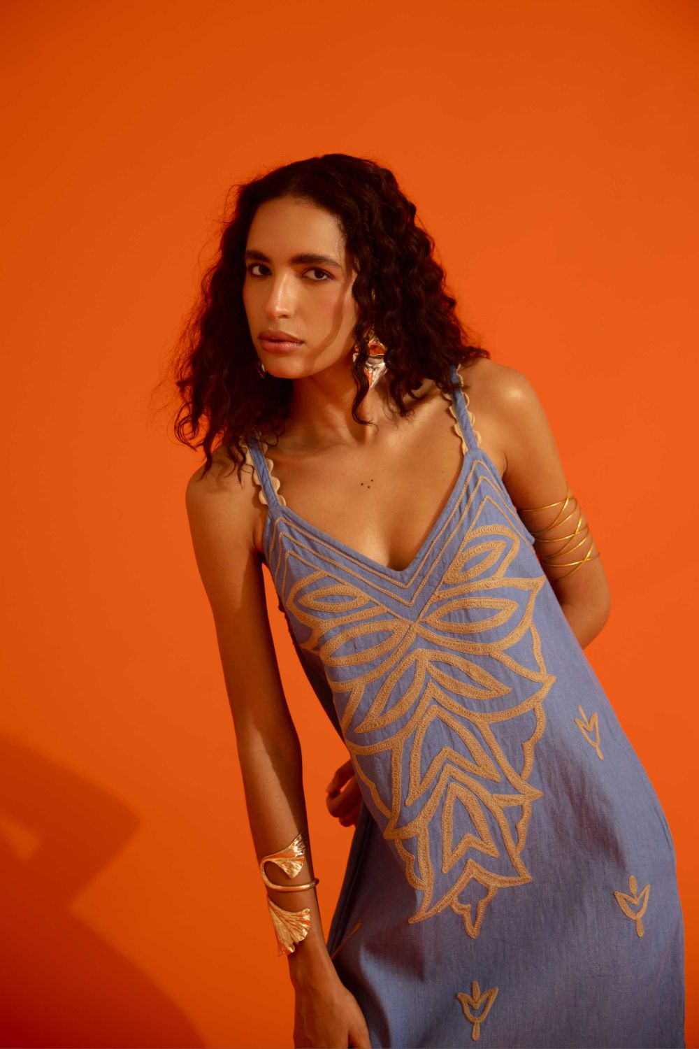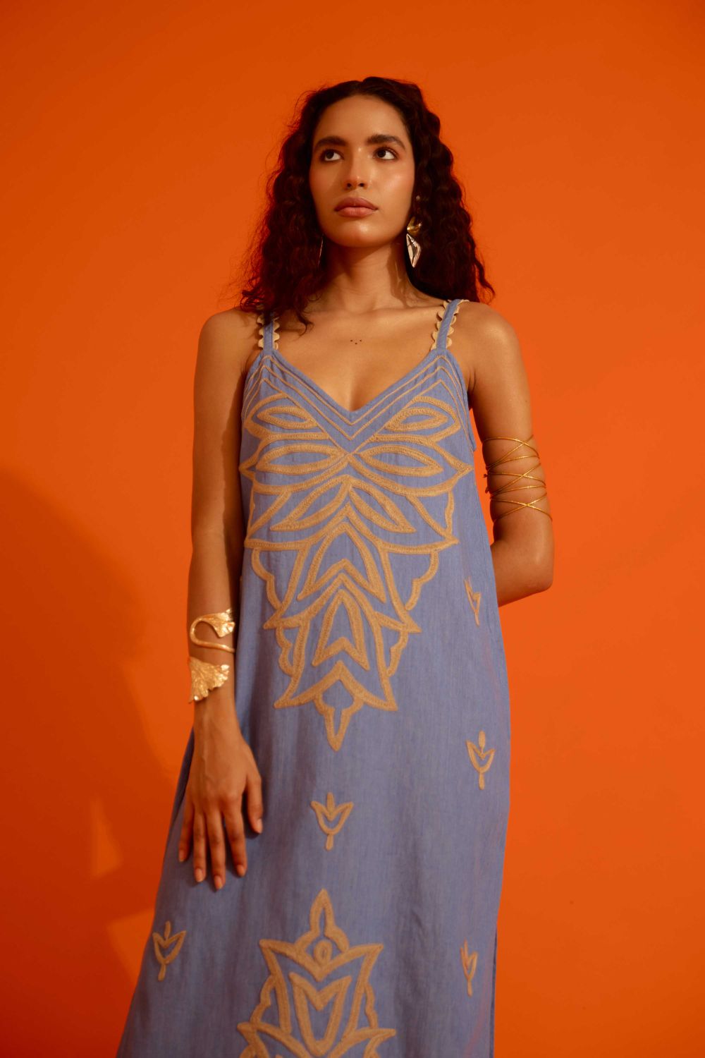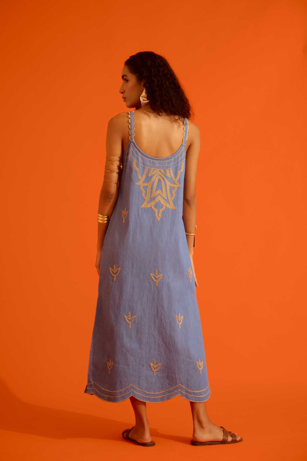 Denim Blue Strappy Dress with Natural Flame Thread Embroidery