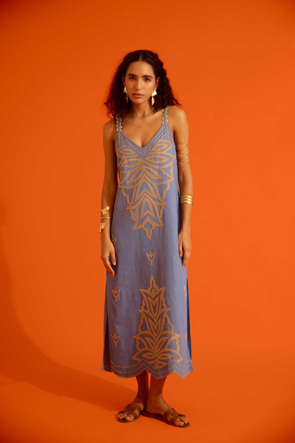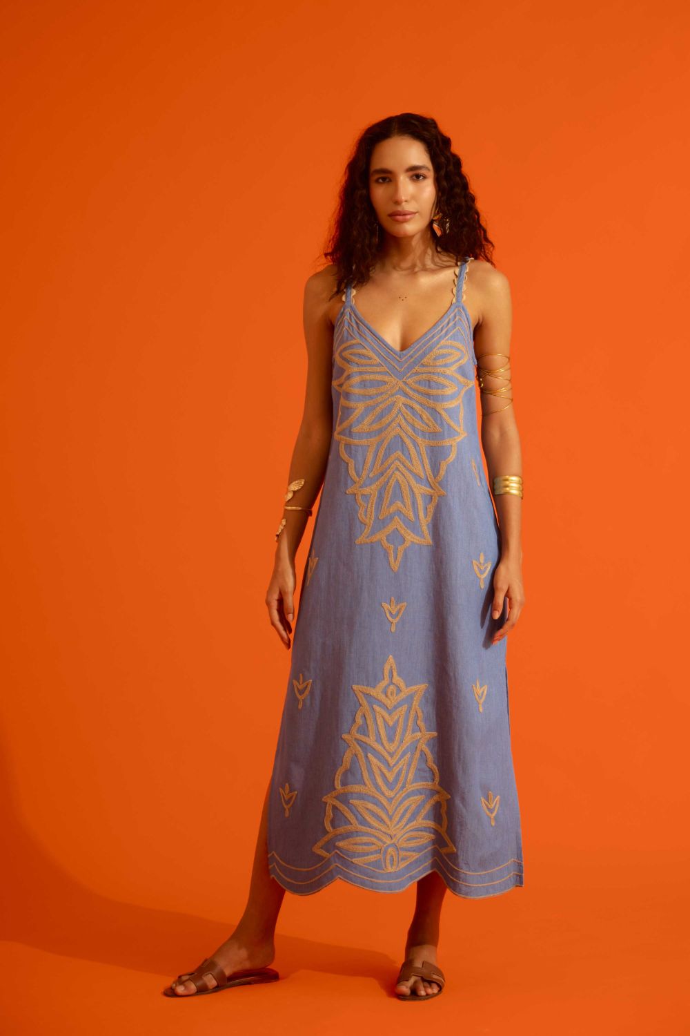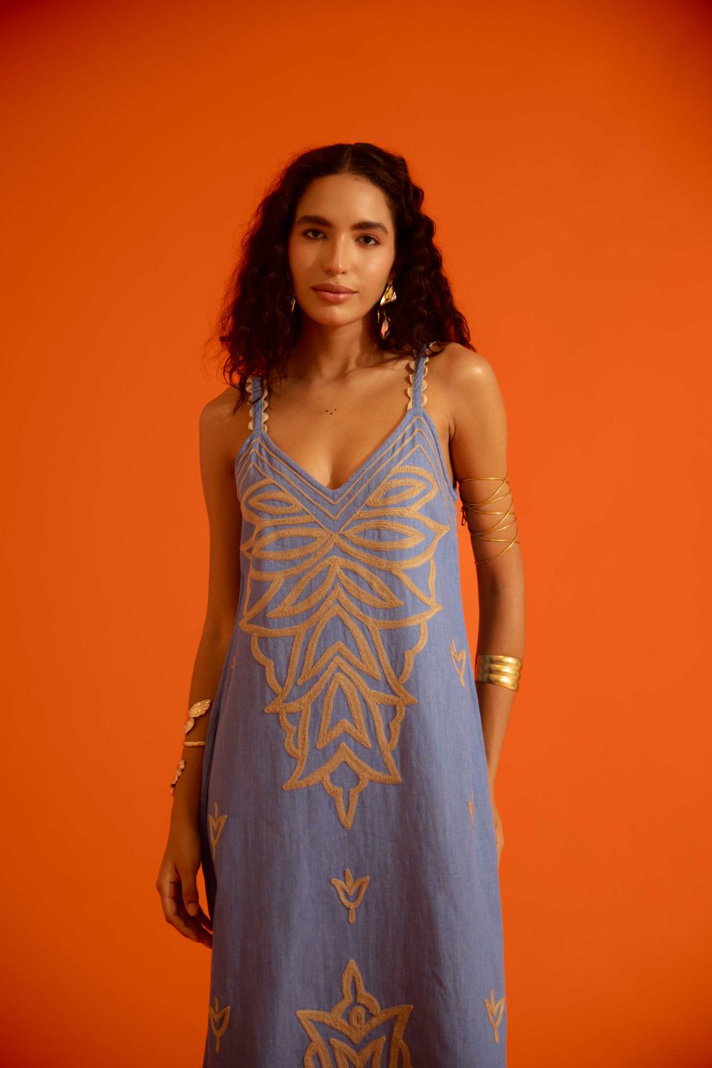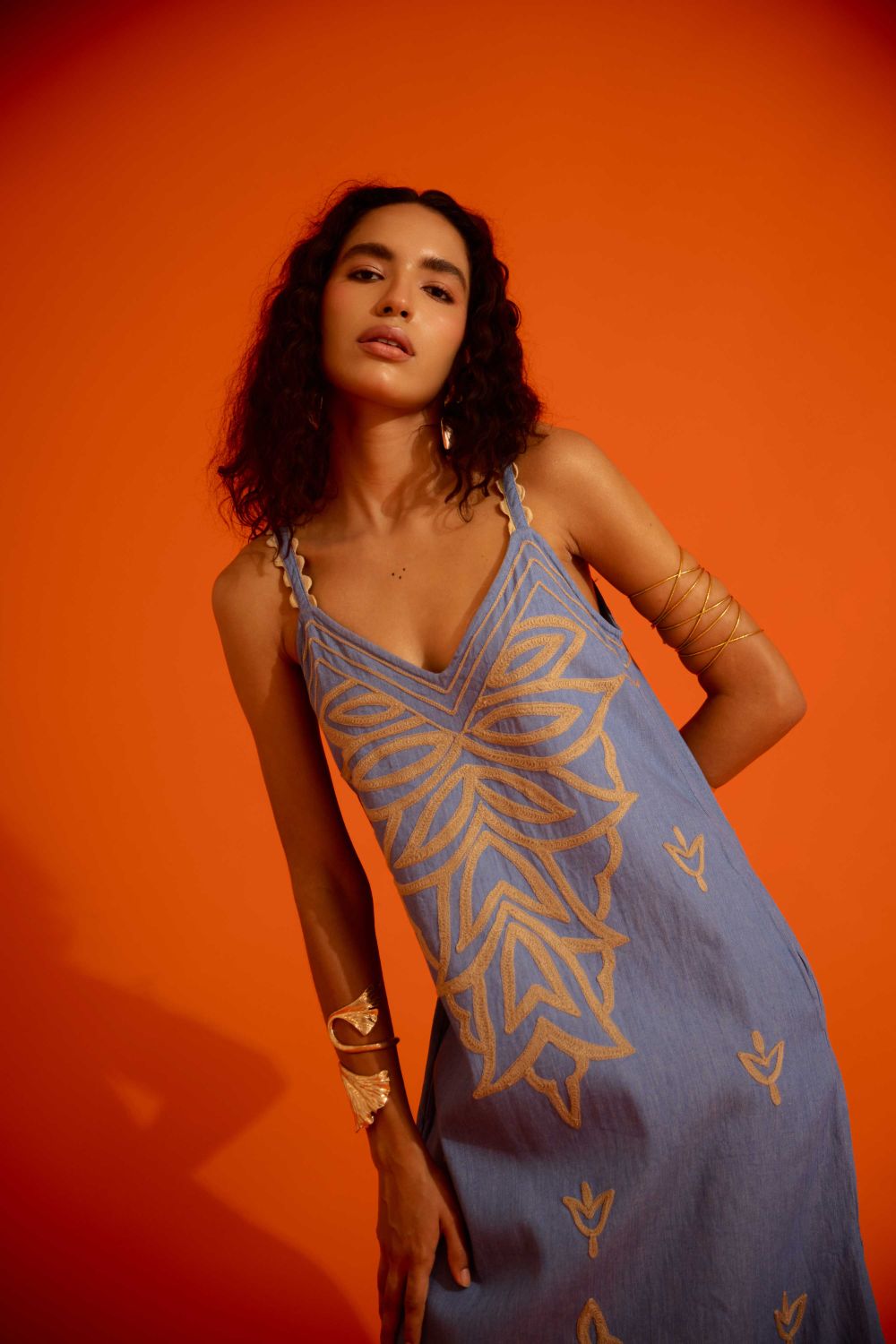 Denim Blue Strappy Dress with Natural Flame Thread Embroidery