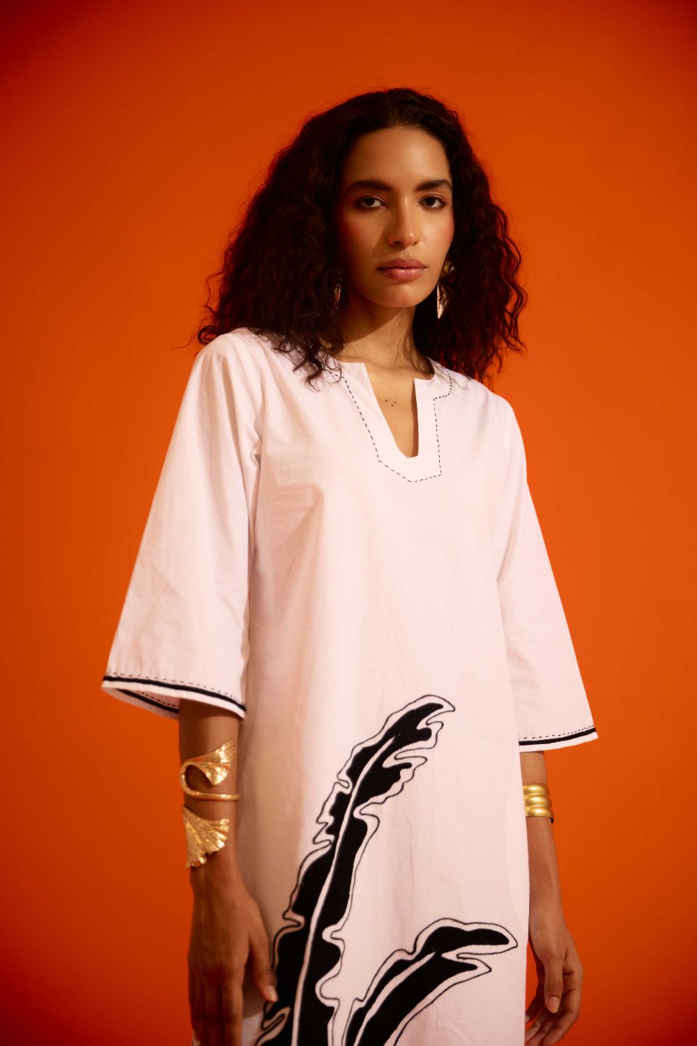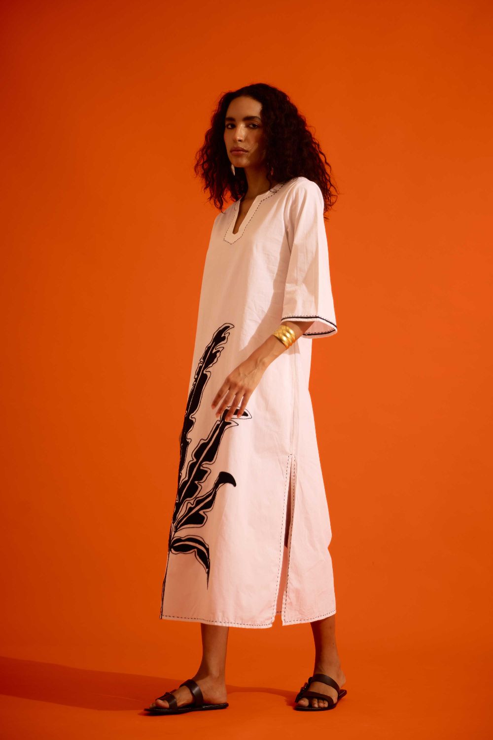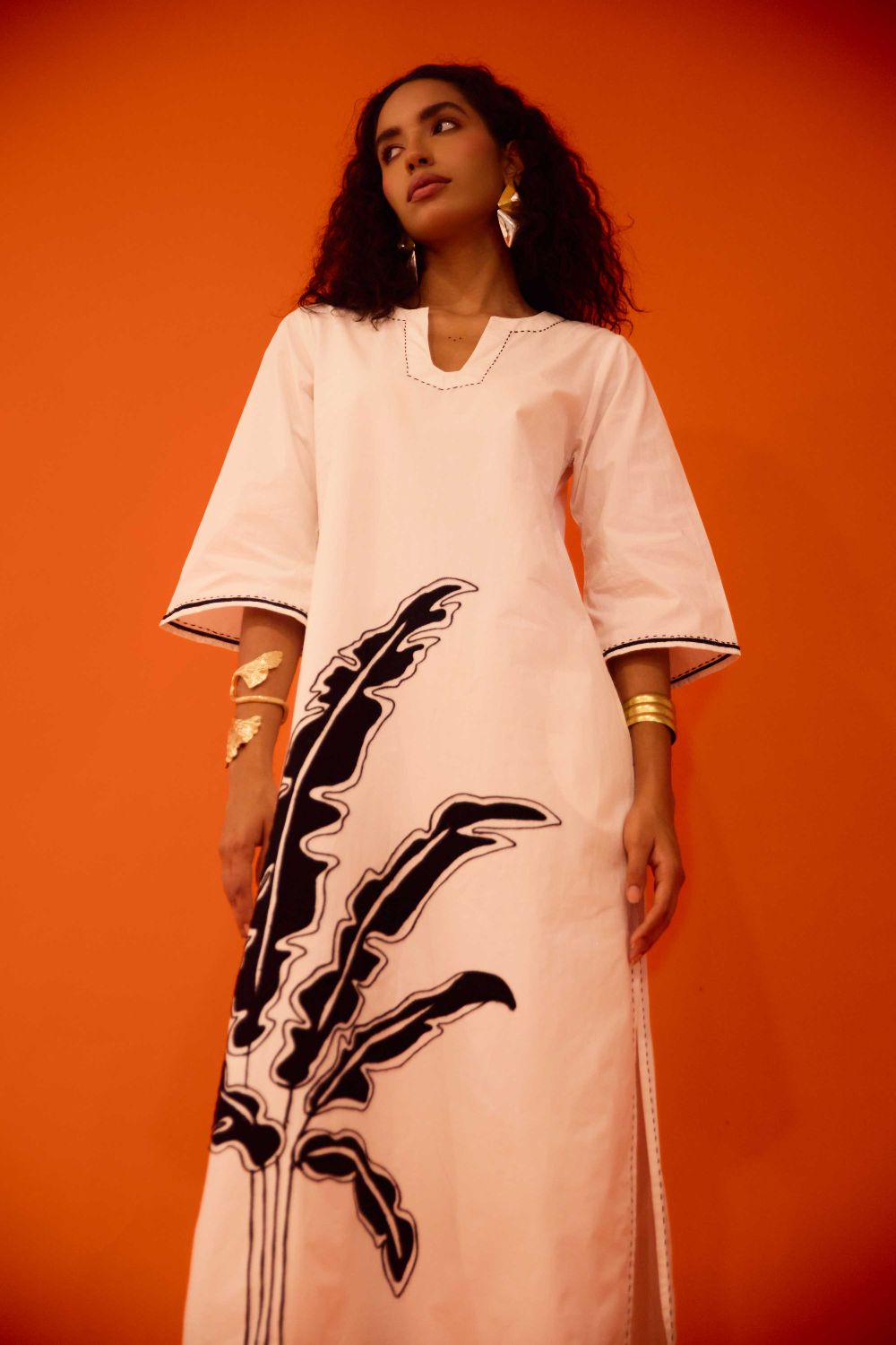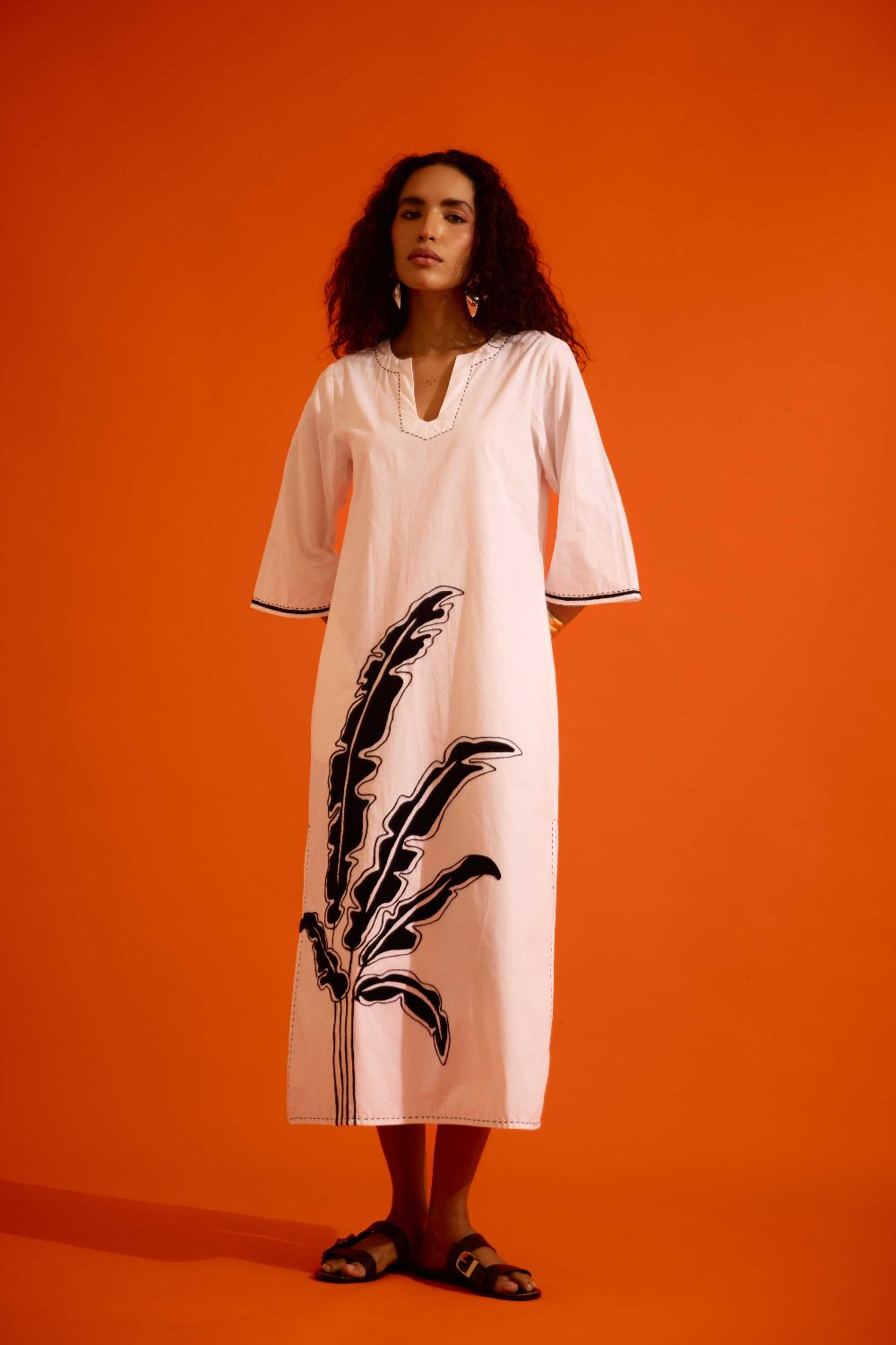 Ivory Cotton Thread Embroidered Dress with Leaf Motif