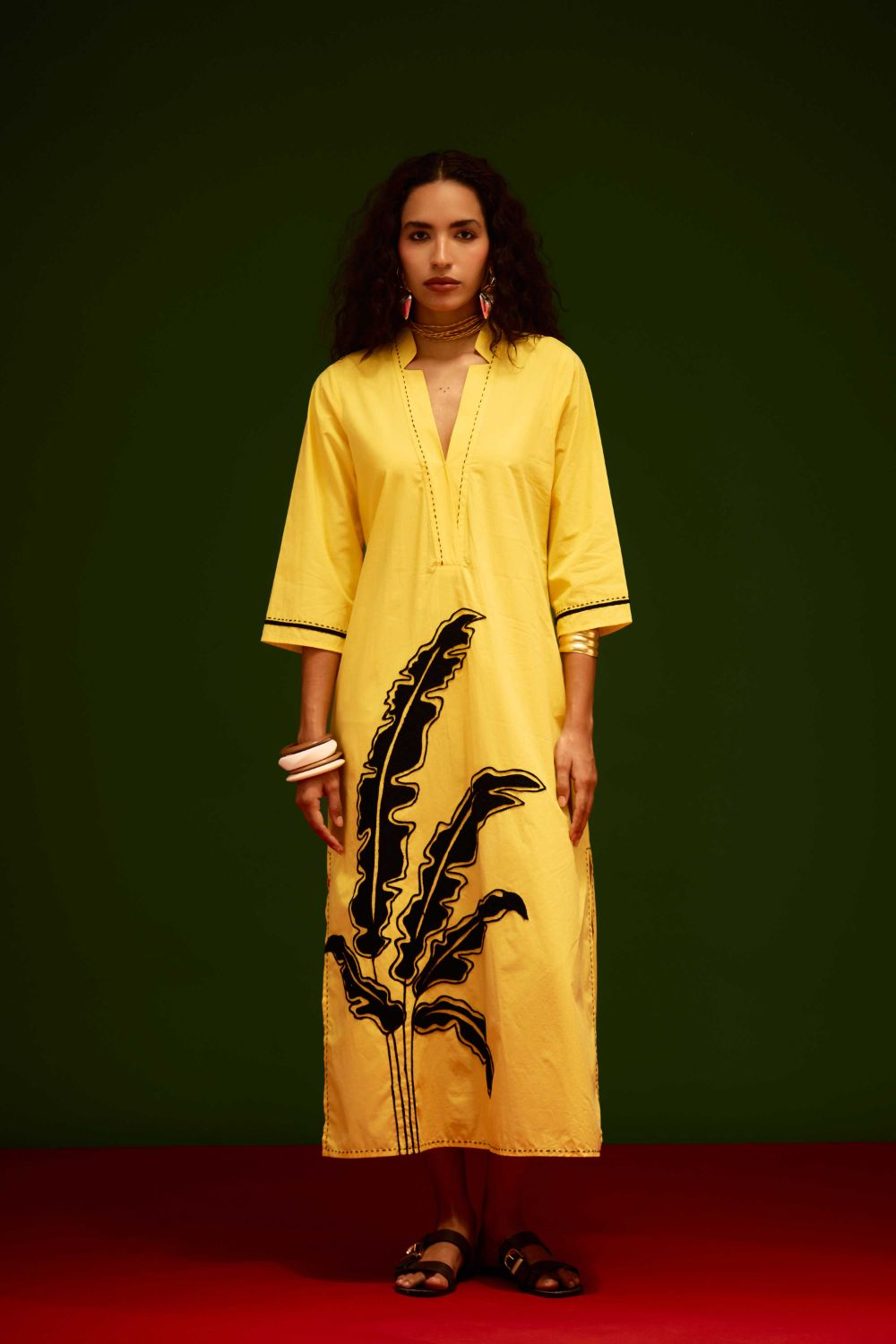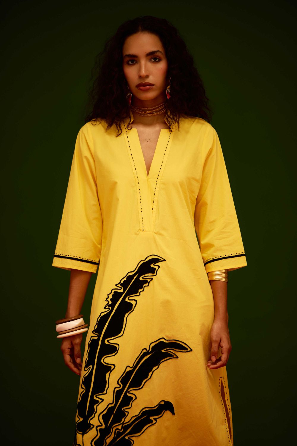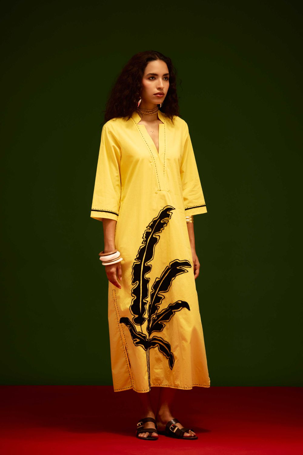 Mango Yellow Cotton Thread Embroidered Dress with Leaf Motif