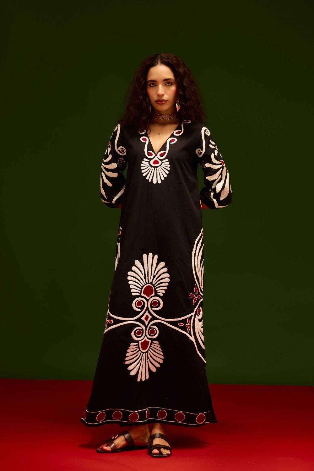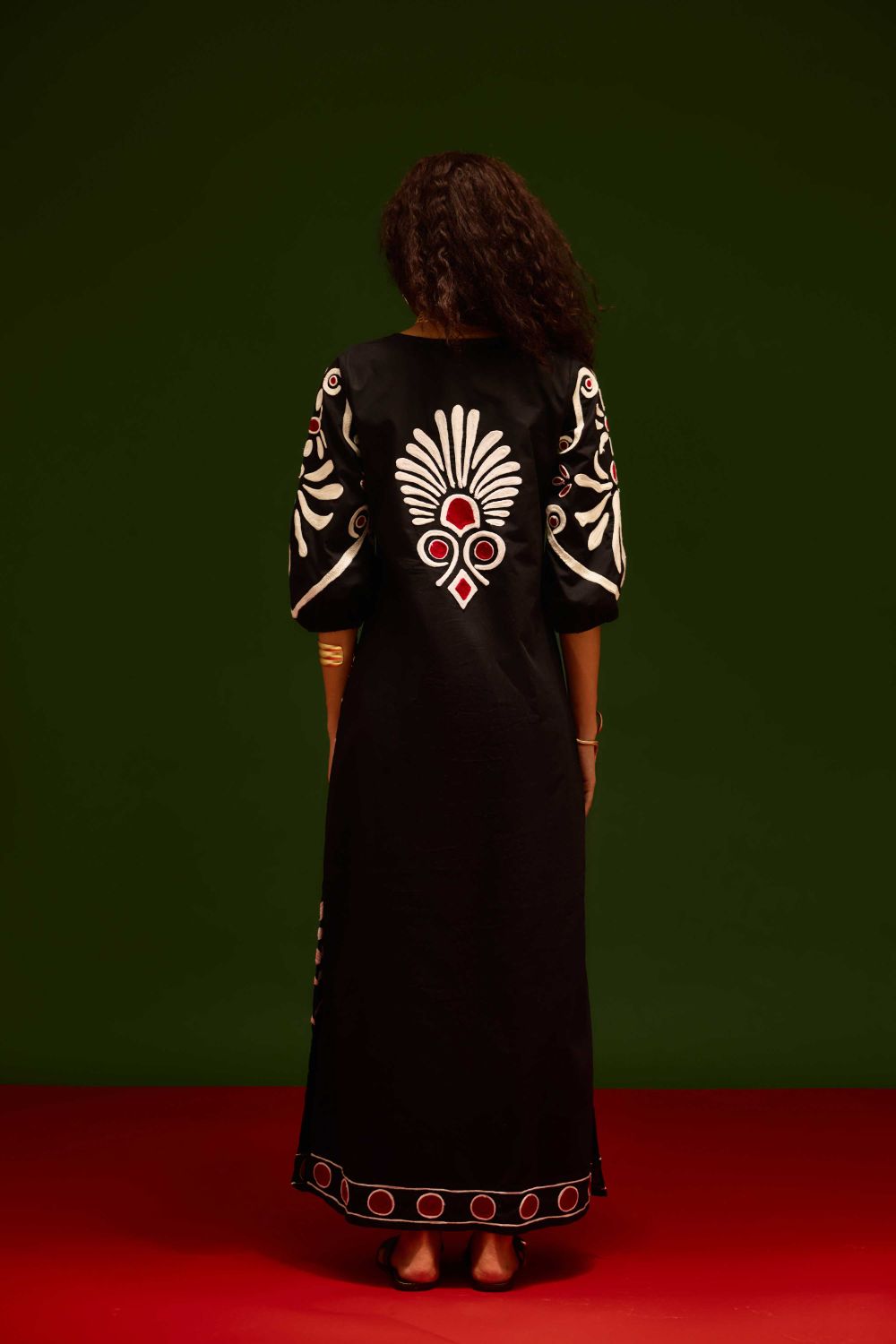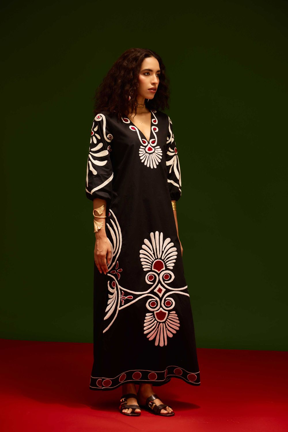 Midnight Blue Cotton Botanical Maxi Thread Embroidered Dress