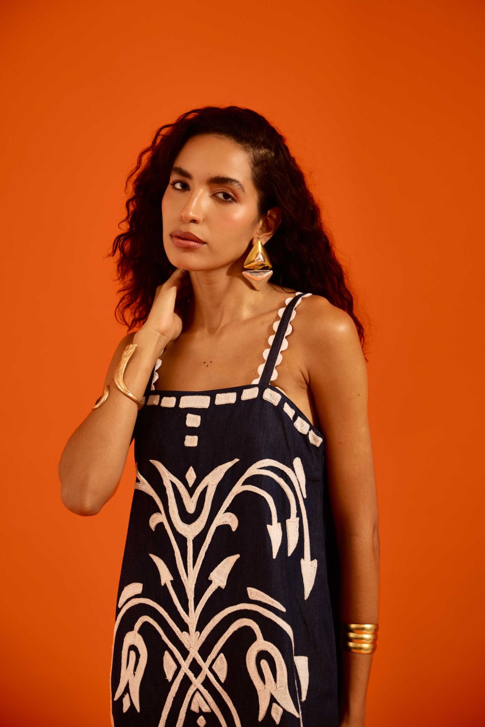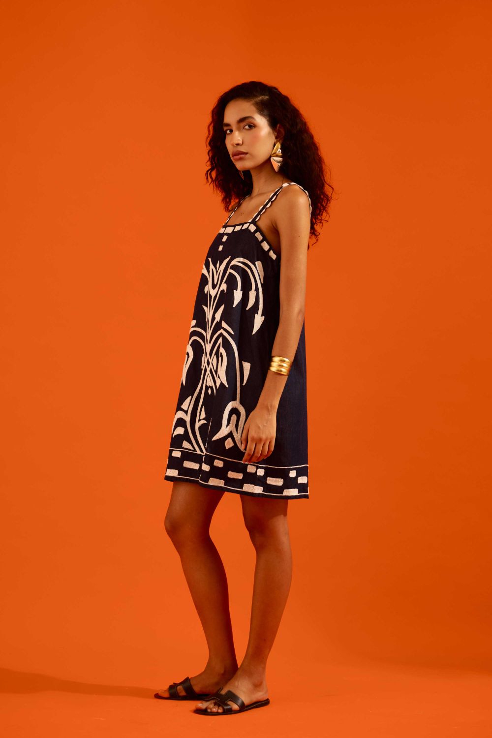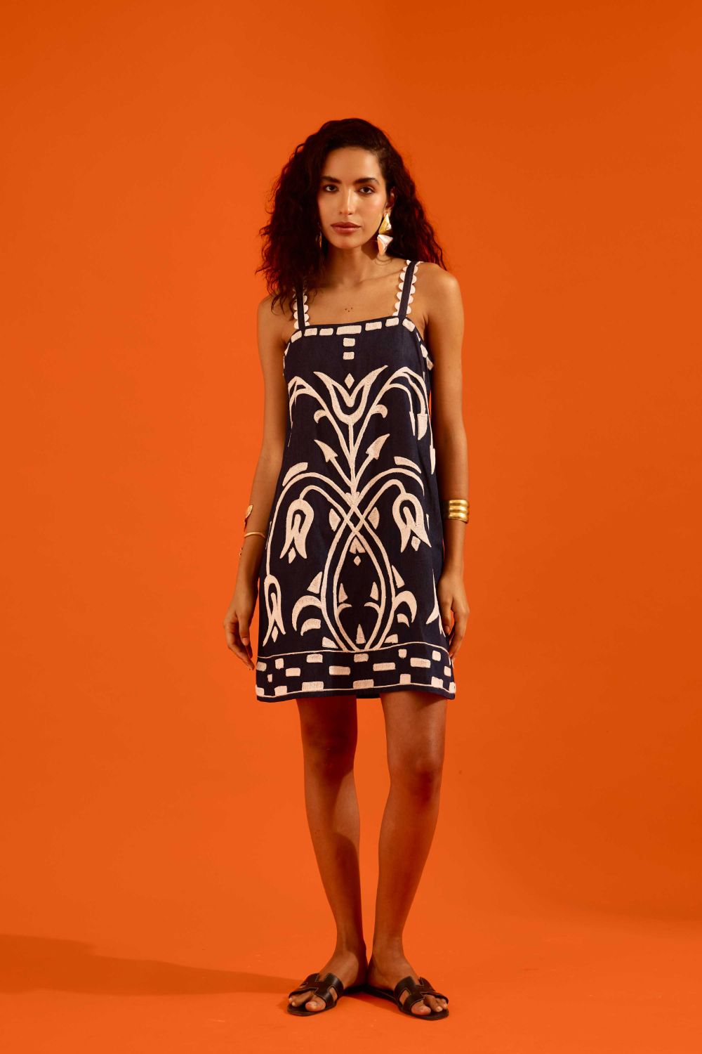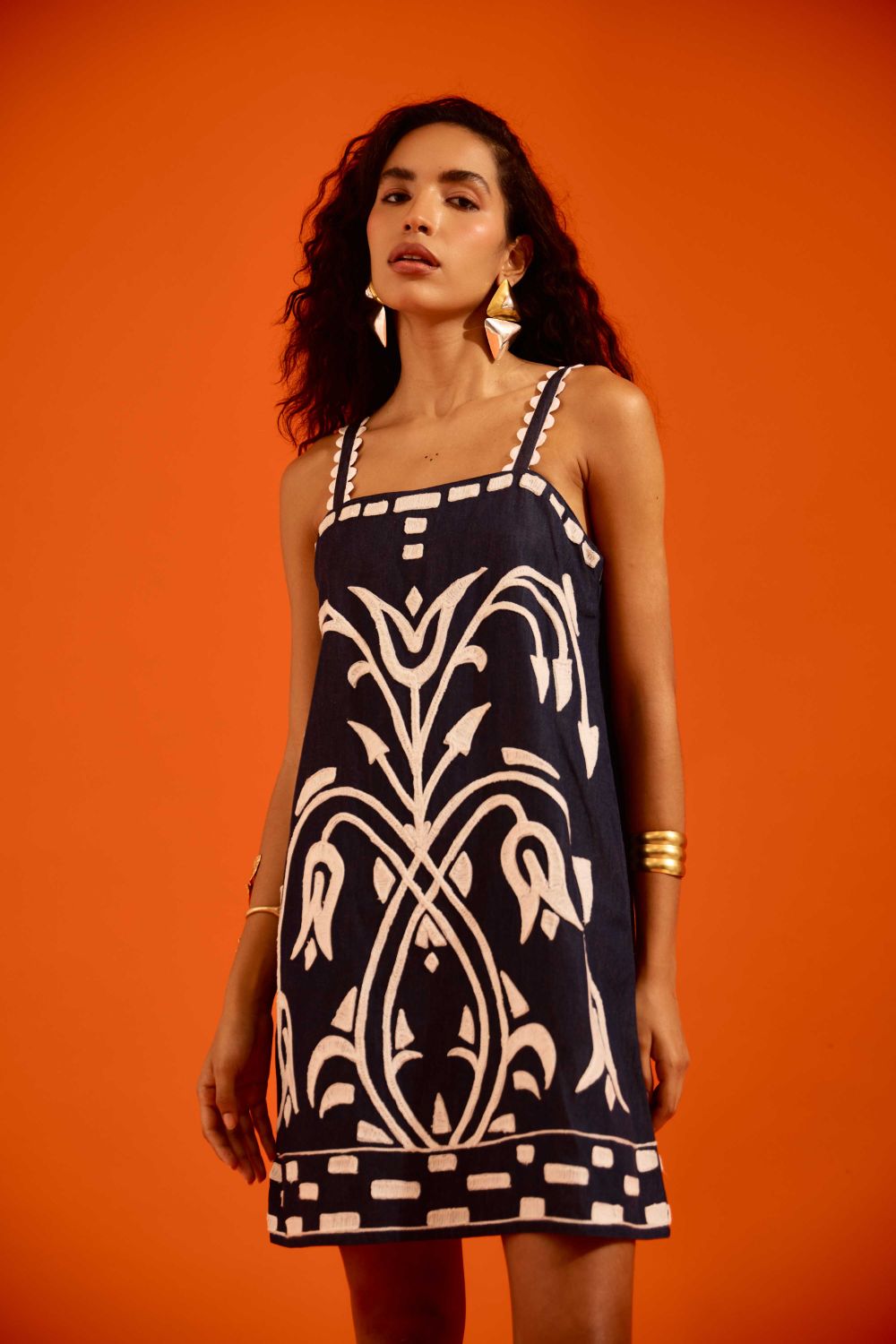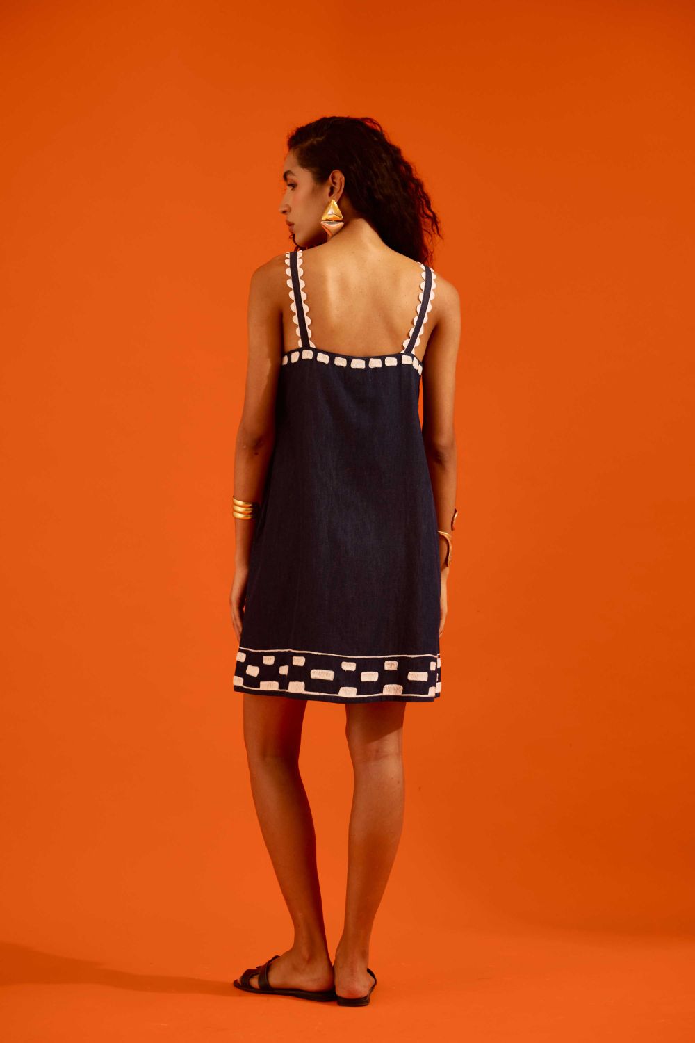 Midnight Blue Strappy Denim Shift Dress with Ivory Garden Thread Embroidery