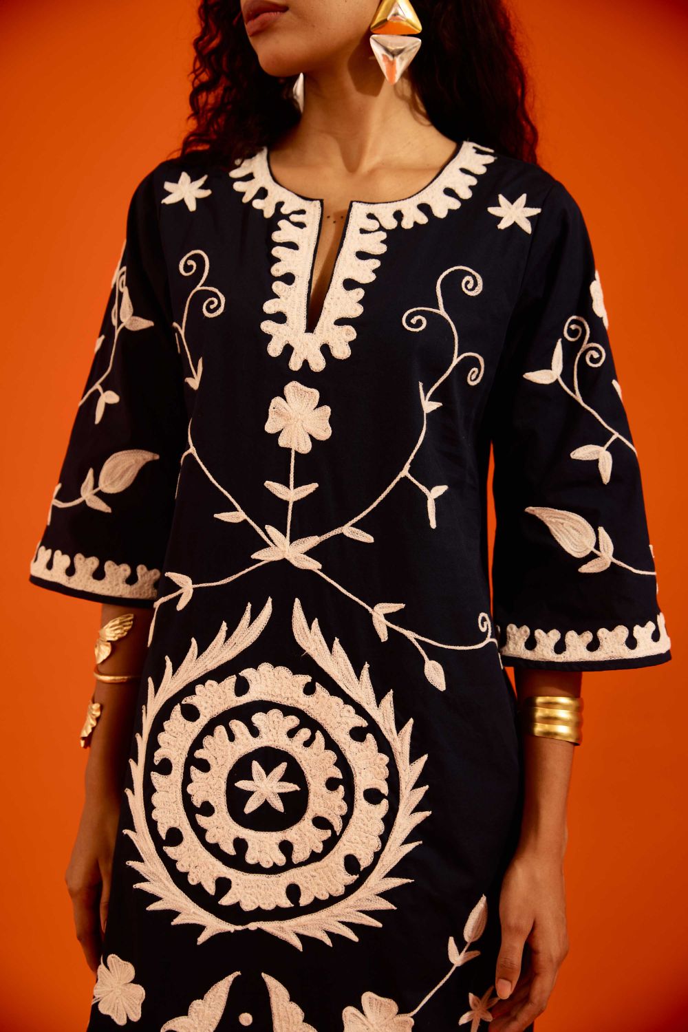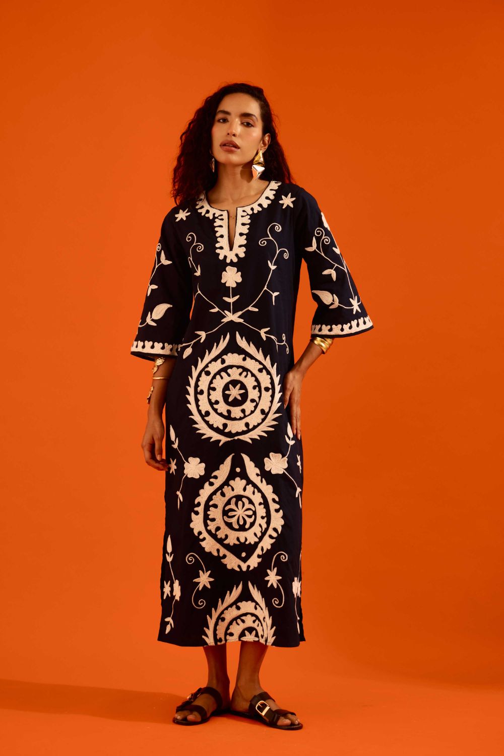 Midnight Cotton Maxi Dress with Ivory Wave Thread Embroidery