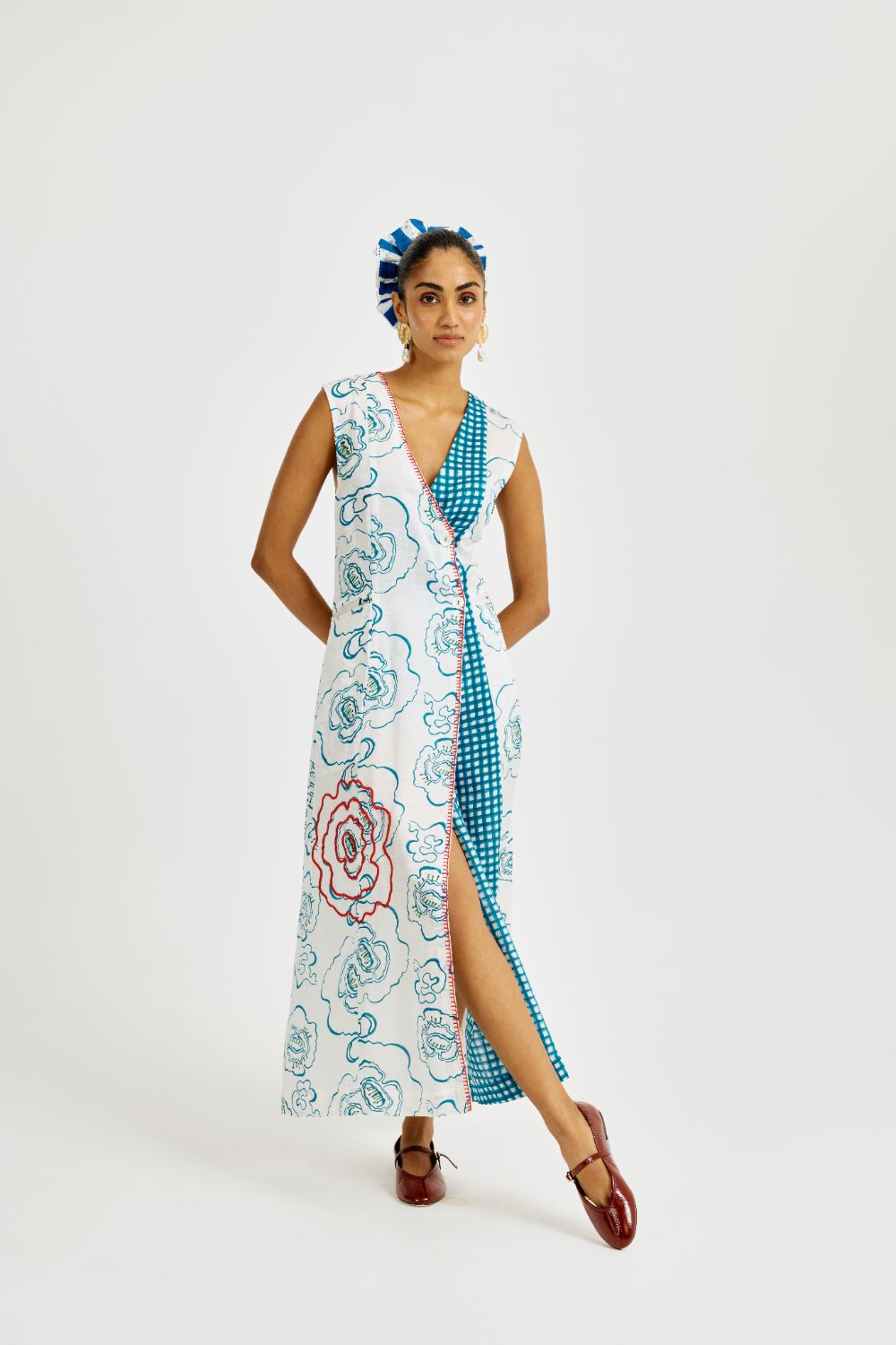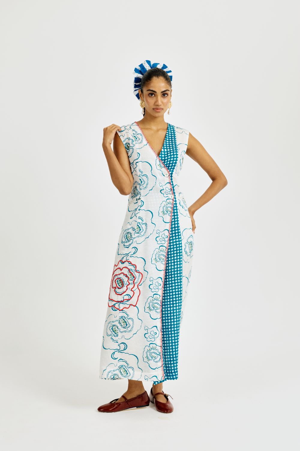 Our Amari dress is the perfect blend of bold pattern play and easy elegance. Crafted in linen satin fabric, this wrap-style midi dress features a delightful contrast of hand-block printed florals and checks — a JODI signature. We love how the red flower hand embroidery adds a playful pop.