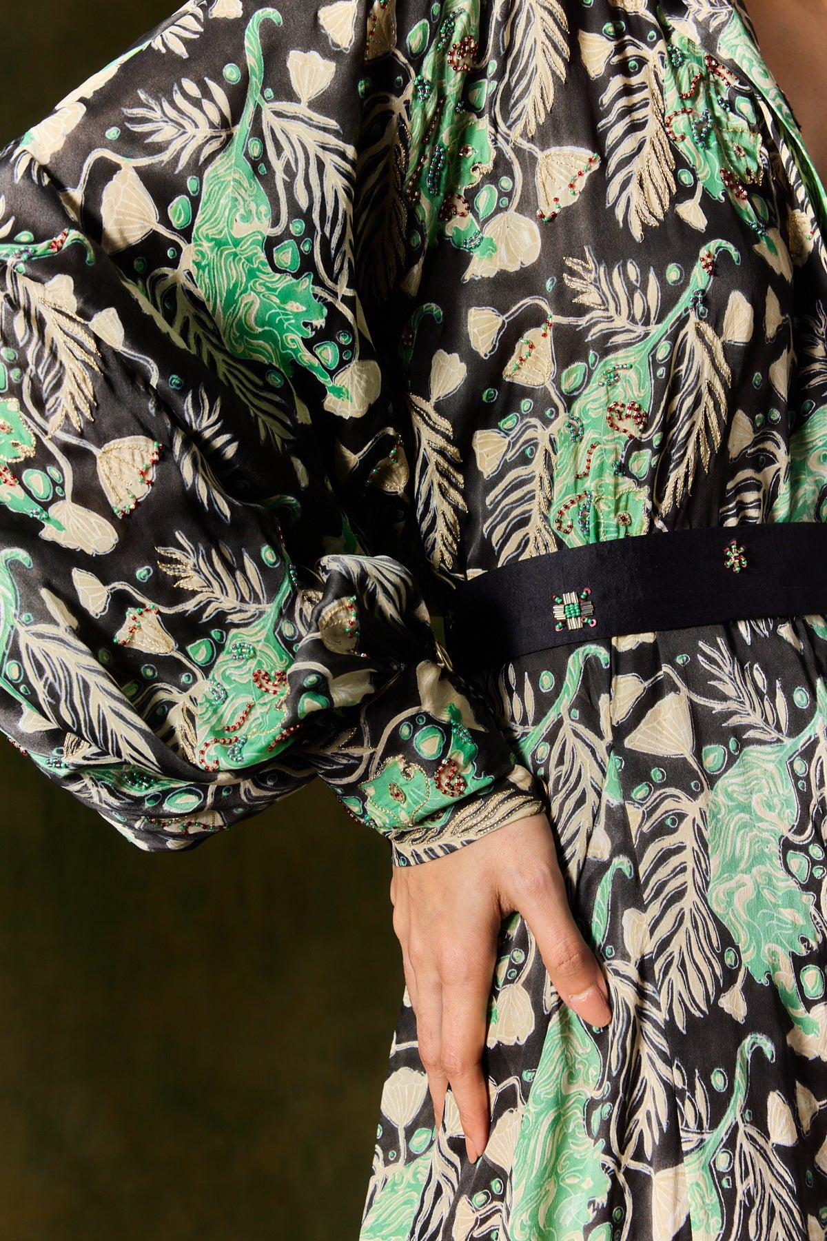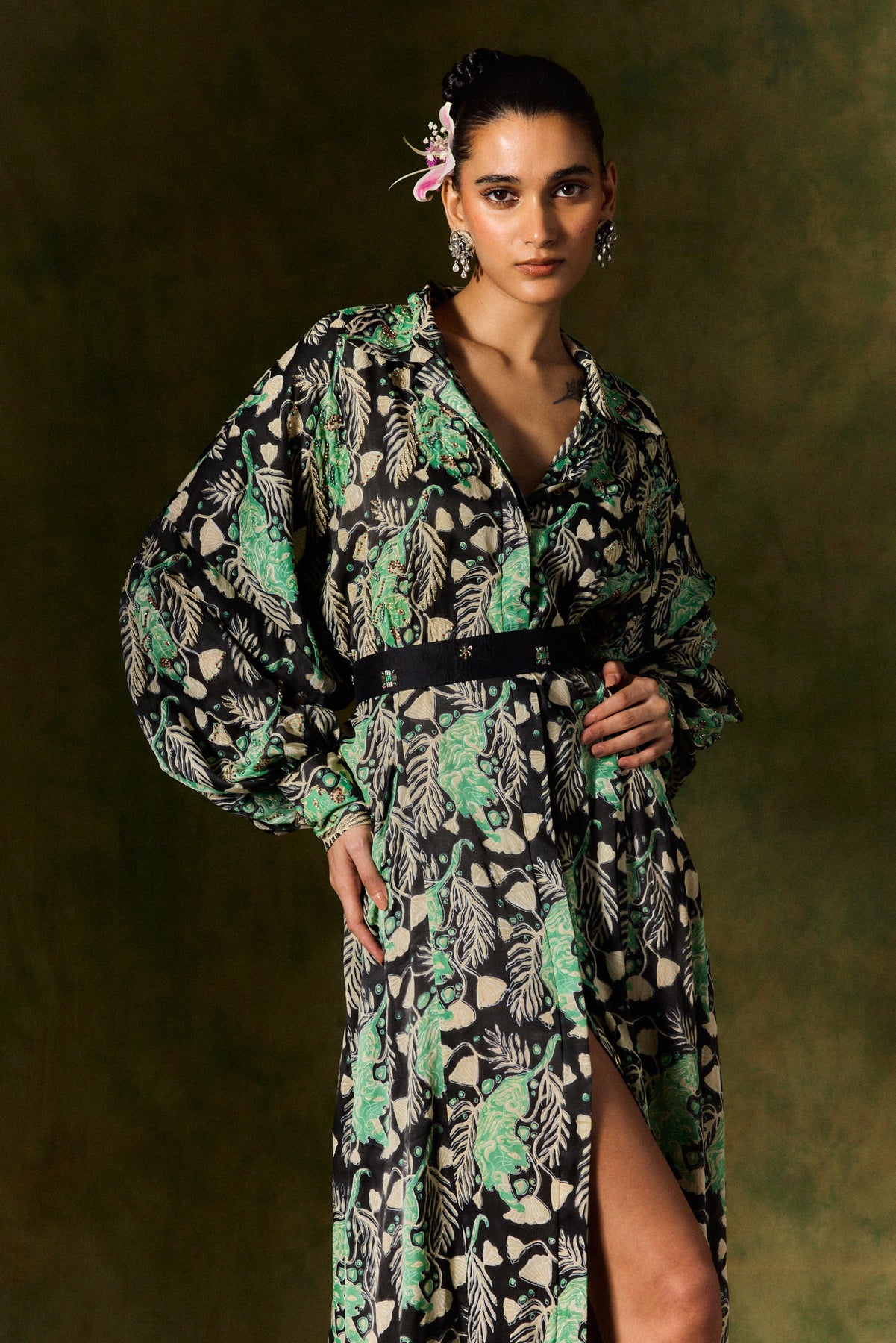 A killer cocktail shirt dress, hand block printed in our roaring tiger print! This long, loose-fit beauty comes together with an embroidered silk belt. The voluminous blouson sleeves and collar are finished with delicate hand embroidery.