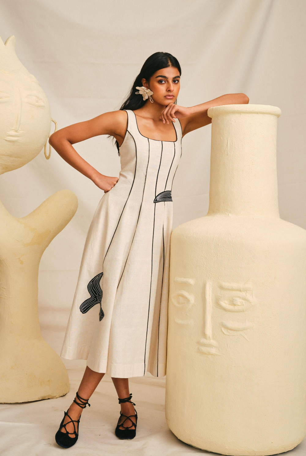 This dress is our fresh take on the most beloved Kokum dress. Crafted in handwoven cotton, it features a wide scoop neckline, and the panelled cuts give it the fit of your dreams. It is also contrasts with hand embroidered appliqué detailing at the right places.