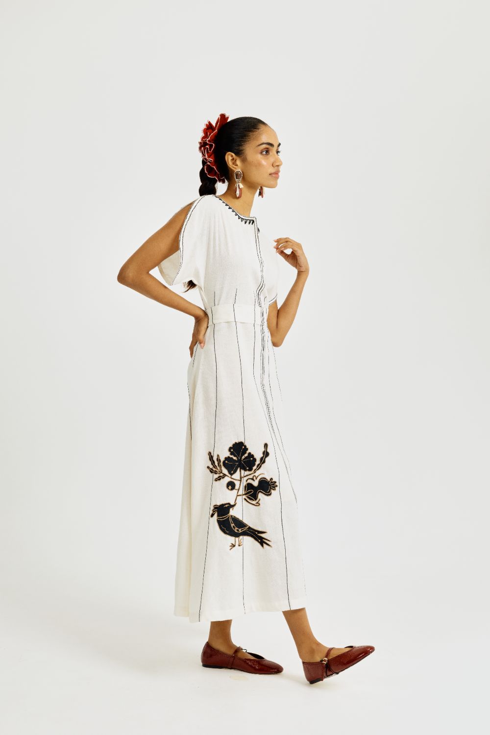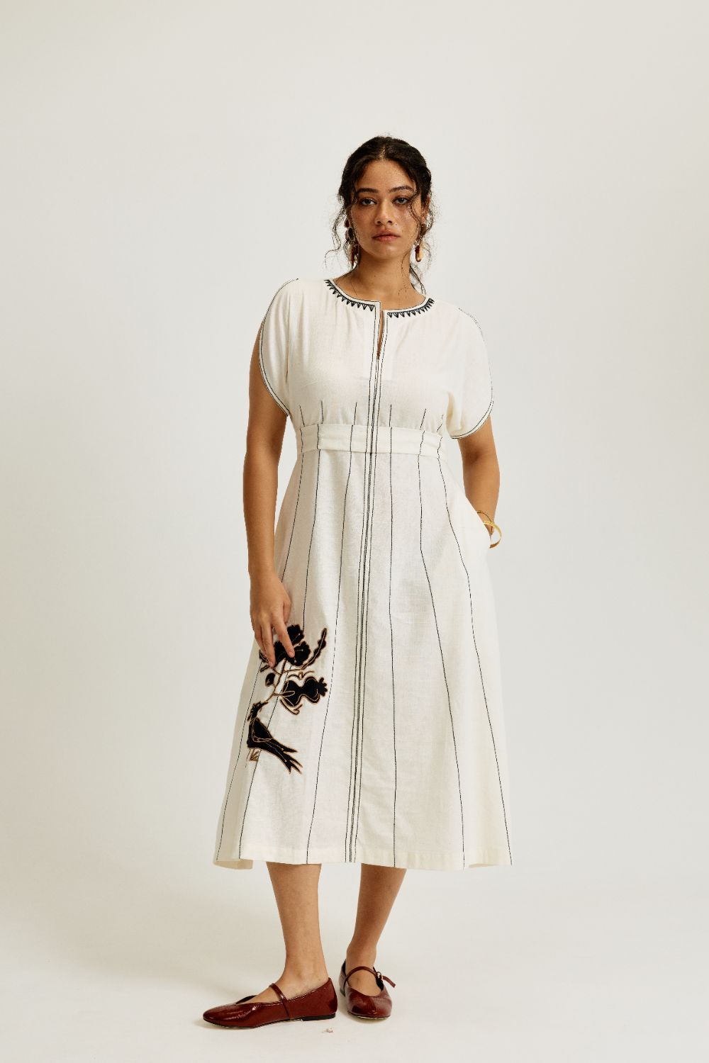 Elevated but easy -this one’s for all your "don’t-know-what-to-wear" days. The dress is cut in handwoven Kala Cotton with contrast threadwork running down the length to elongate your silhouette. Featuring our signature appliqué bird motif, this dress balances earthy craft with flattering tailoring. The structured waist panel cinches you in just right, while skirt panels add just the right amount of drama to the dress. Our product is crafted in Pune, India, using techniques of traditional embroidery. Subtle variations in patterns are natural to this process. We believe this makes each creation unique and charming. Some call it je ne sais quoi. We call it JODI. If you wish to have the length of the garment altered, please mention your request in the special instructions section at checkout, with your desired length, customisation charges may apply.