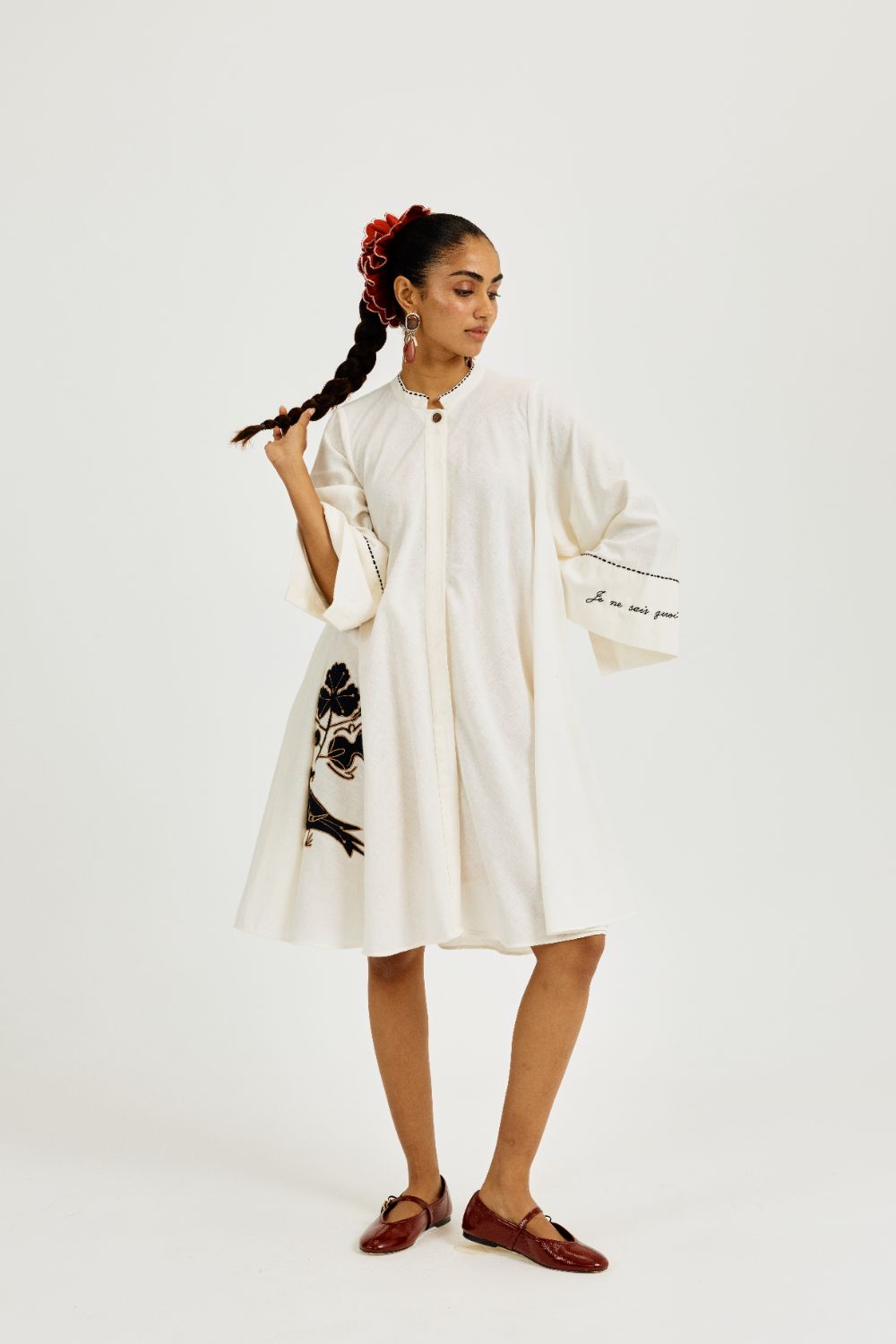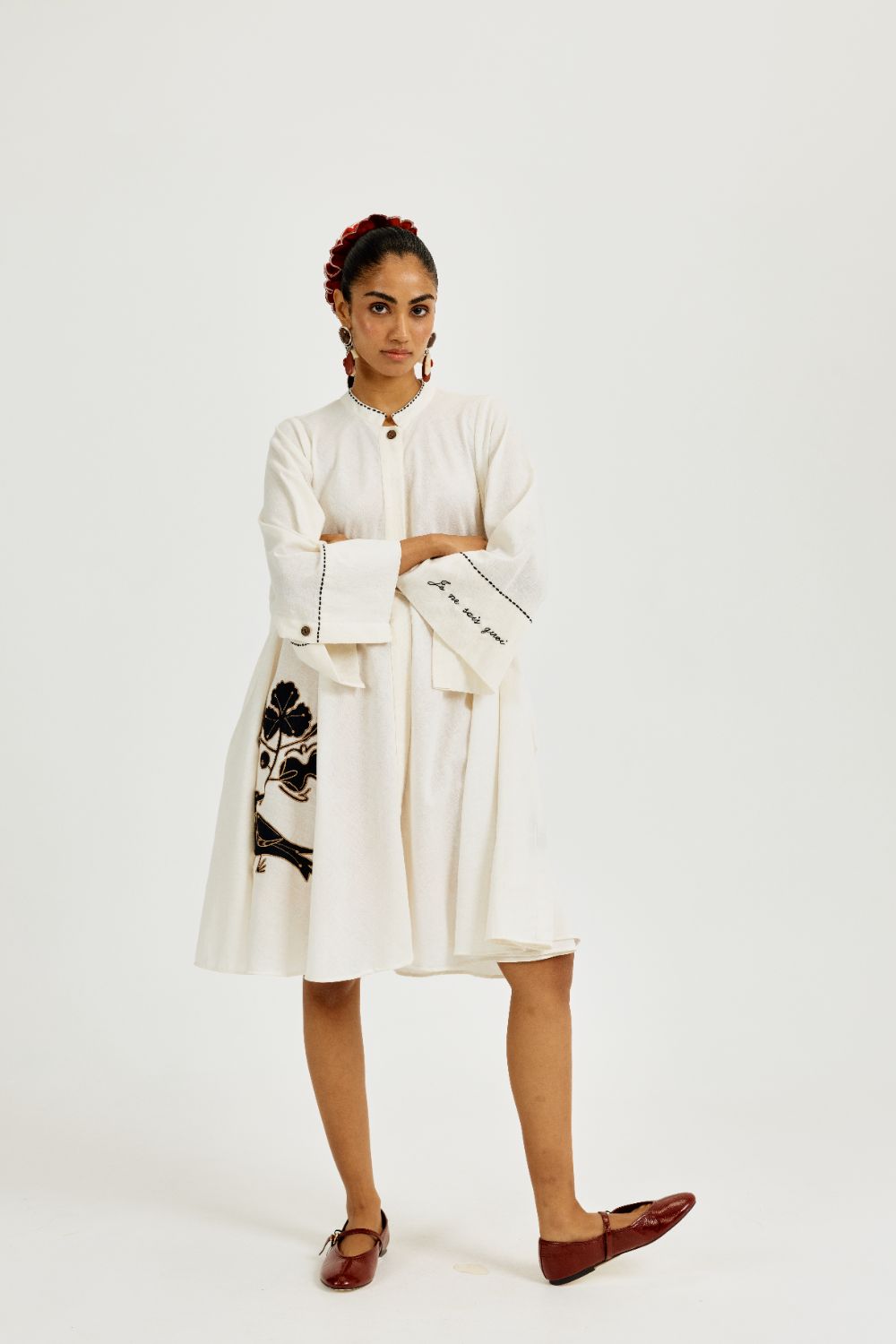 A dress made for movement- meet our Maati Swing Dress. Cut from handwoven Kala Cotton, it’s tailored with a relaxed fit and extra flare, making it ultra breathable and twirl-friendly. The beauty lies in the contrast — a delicate bird appliqué perched along one side and signature hand-embroidered detailing at the sleeves.