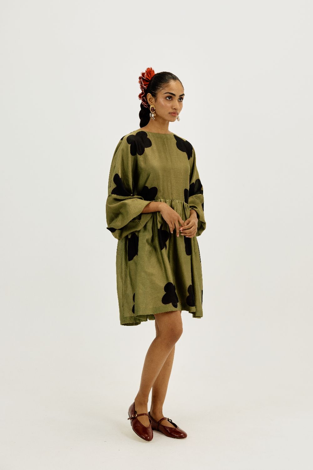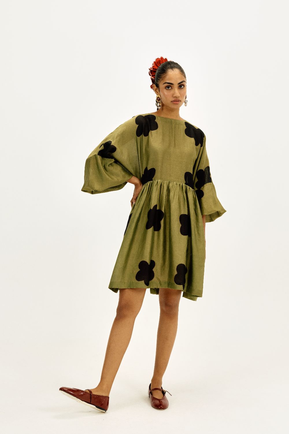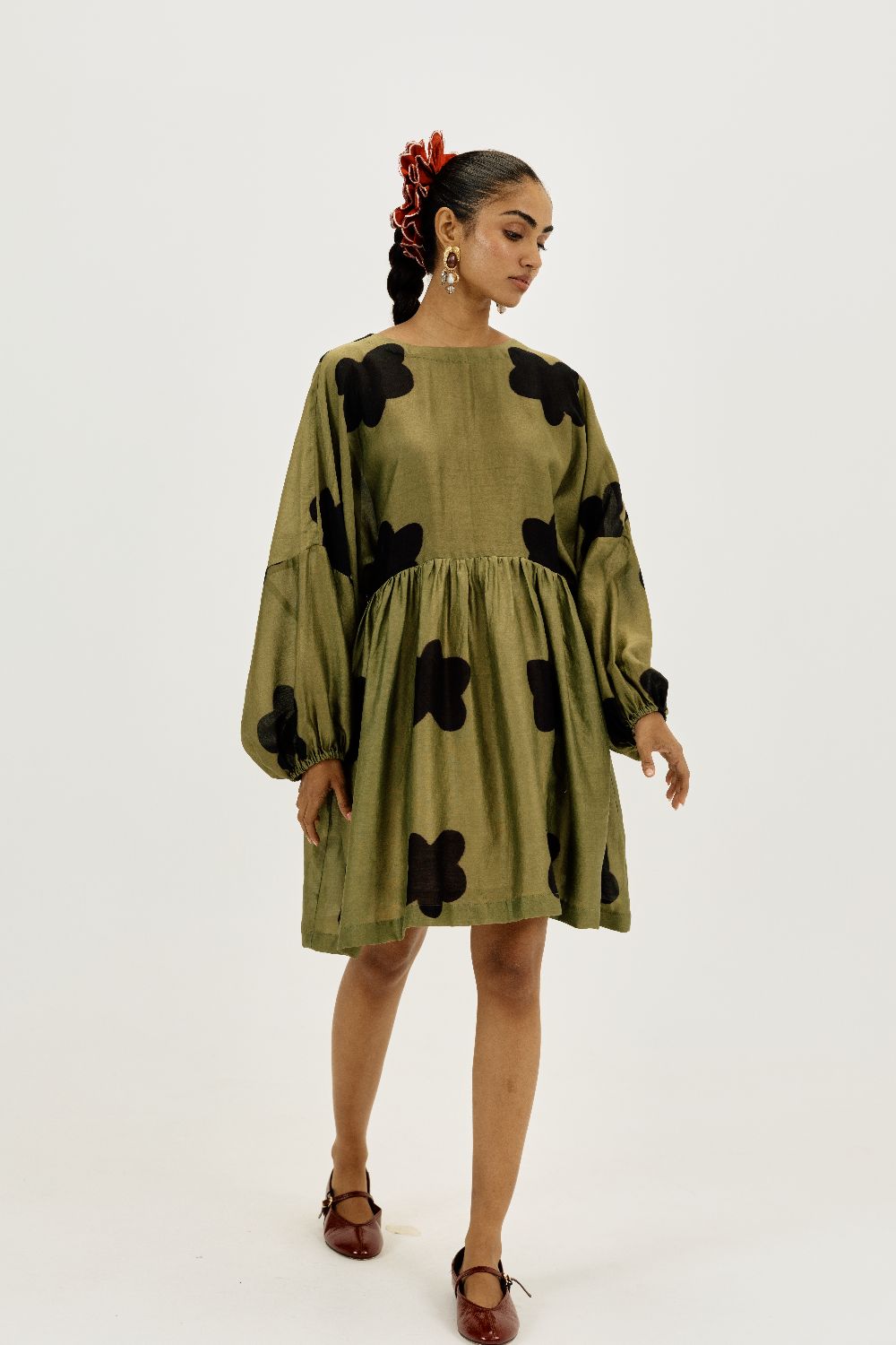 The easy clamp dye dress is spliced with a centre back opening. The gathered skirt and billowy sleeves create beautiful movement and volume. This piece comes with a separate skirt slip.