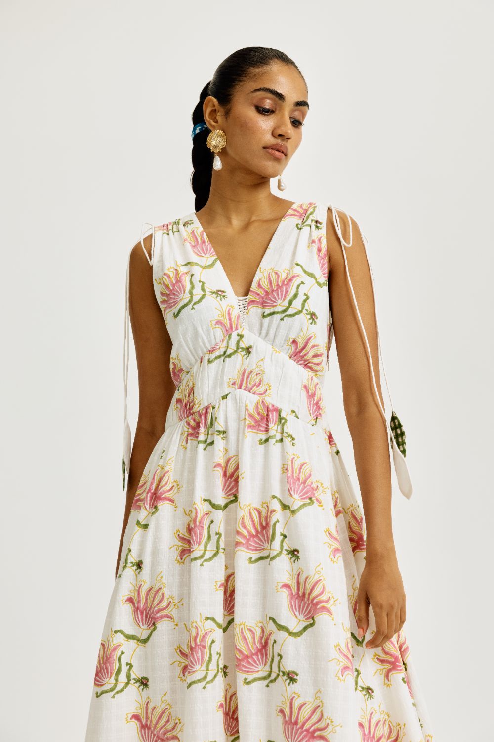 Breezy, playful, and made for sunlit days. This dress showcases our block-printed pink floral motifs, on handwoven cotton. This sleeveless silhouette is detailed with delicate shoulder ties that you can adjust for the perfect fit. The softly gathered empire waist flatters the body, flowing into a full, ankle-grazing skirt.