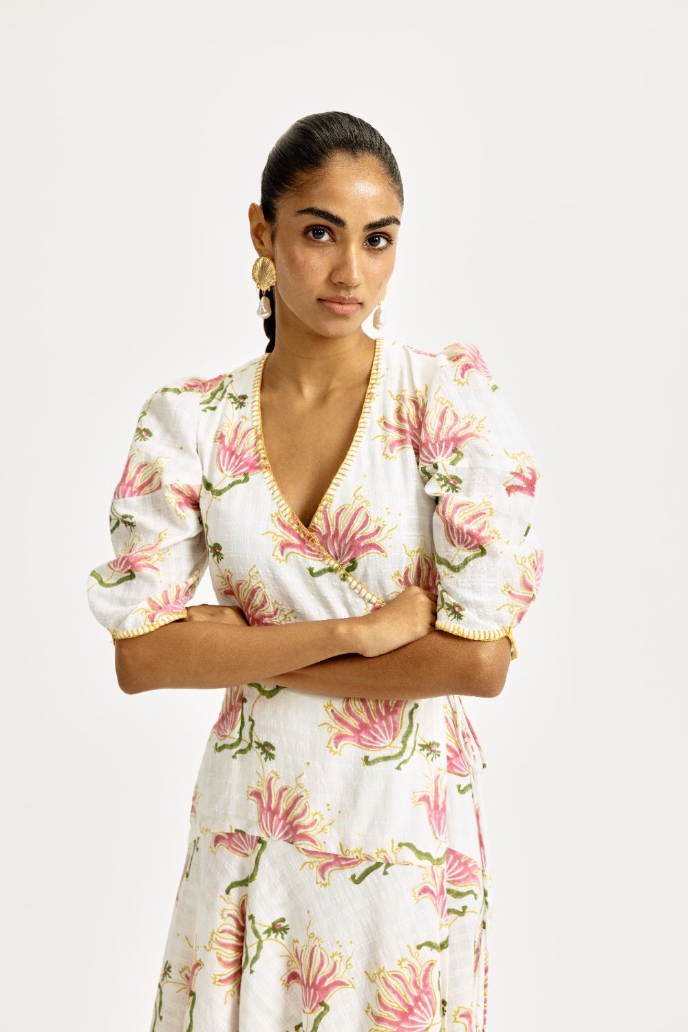 Say hello to effortless elegance. Our Moor Wrap Dress features block-printed florals in vibrant pink and green on handwoven cotton. The wrap silhouette flatters all body types with a tie-up detail that cinches at the waist. Puff sleeves with delicate hand embroidery add a playful, feminine touch. Our product is hand-block printed in Jaipur, India, using techniques of traditional handblock printing. Subtle variations in patterns are natural to this process. We believe this makes each creation unique and charming. Some call it je ne sais quoi. We call it JODI. If you wish to have the length of the garment altered, please mention your request in the special instructions section at checkout, with your desired length, customisation charges may apply.
