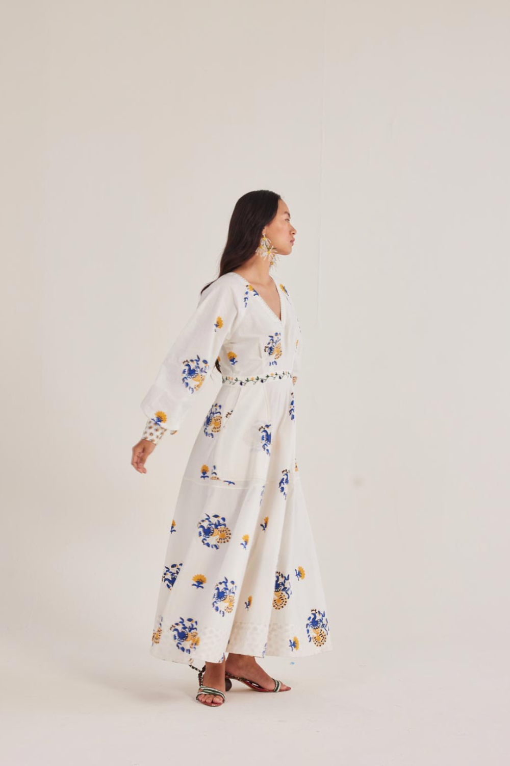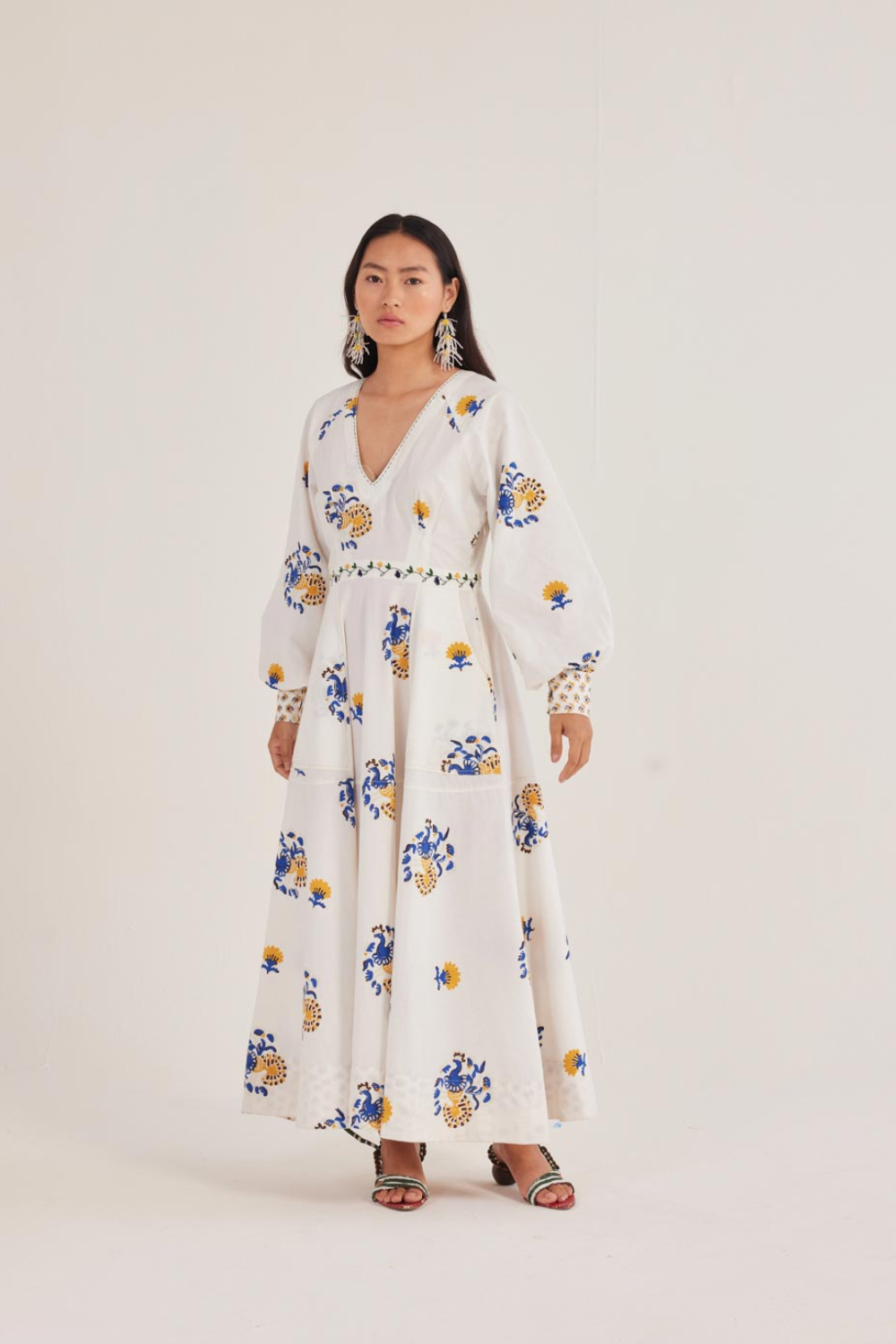 This dress is made for summer! The perfect fit and flare dress is hand block printed in cotton with an embroidered waistline and hand embroidery on the neck.