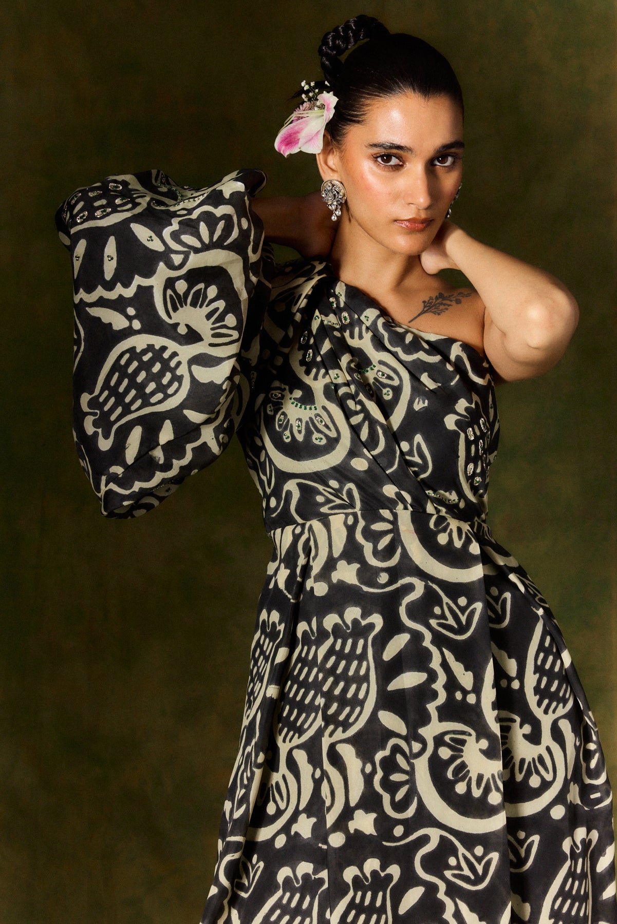 This one-shoulder dress is a stunner! With a bold floral hand-block print, a playful balloon sleeve and a box pleat flare that gives just the right amount of swish, this dress is all about the fun! And those hand-embroidered details on the bodice and the sleeves? Chef's kiss!