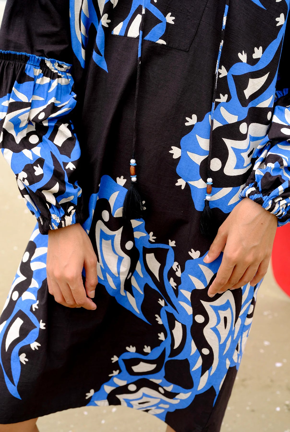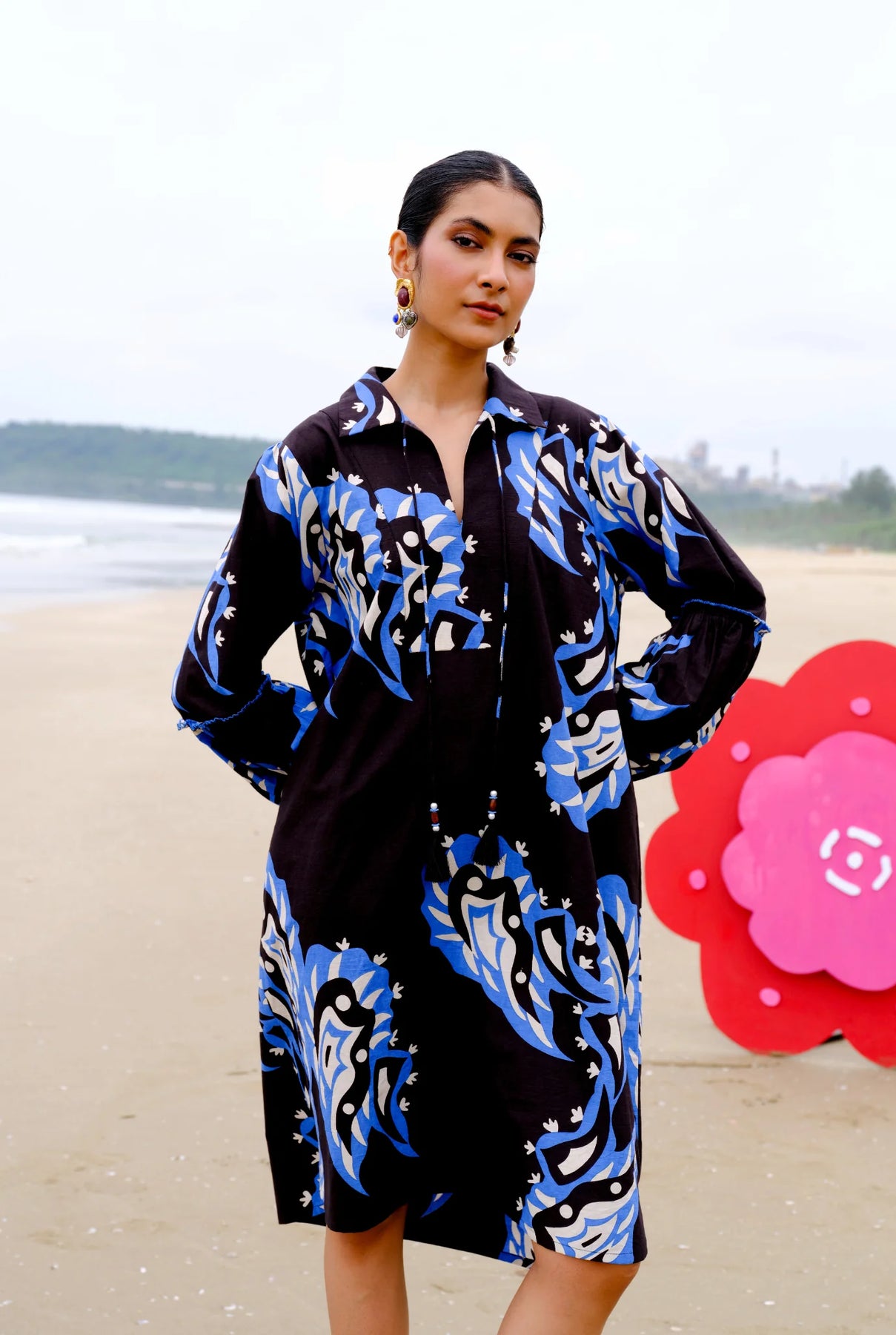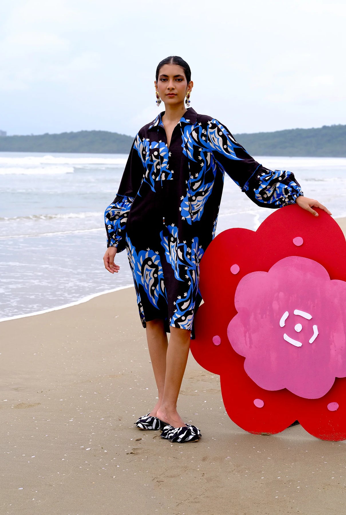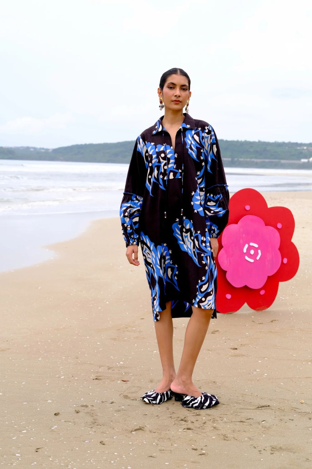 This shift dress features a high-low hem and a classic collar. It’s made from soft cotton with a screen-printed design, with neck strings and a bead detail at the tie-up. Ideal for casual outings, this roomy dress is full of playfulness! We believe customers have a right to know how their product was made. 3.25 metres of Cotton poplin fabric sourced from Jaipur has been used for this piece. Hand-printed by our artisans in Jaipur, manufactured and hand-embroidered in our workshop at Pune India. This product is hand-printed in Jaipur, India, using traditional techniques. Subtle variations in patterns are natural to this process. We believe this makes each creation unique and charming. Some call it je ne sais quoi. We call it JODI. If you wish to have the length of the garment altered, please mention your request in the special instructions section at checkout, with your desired length.