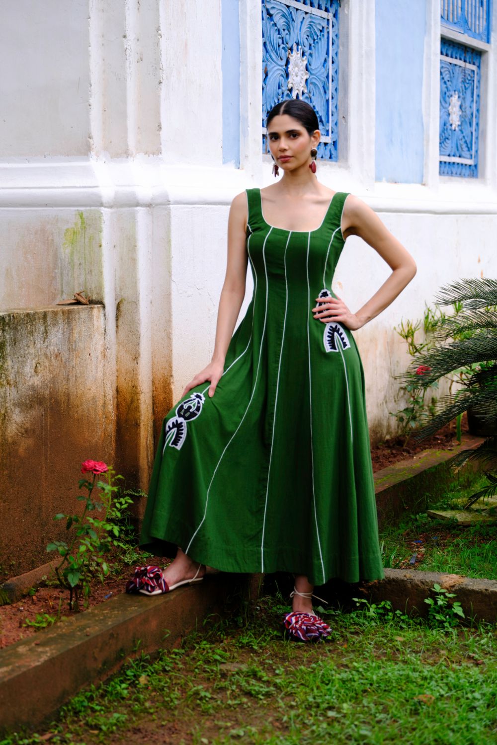 We’re back with another version of our forever favourite Kokum dress! Crafted in handwoven kala cotton, it features a wide scoop neckline, and the panelled cuts give it the fit of your dreams. It is also contrasted with embroidered appliqué detailing at the right places.