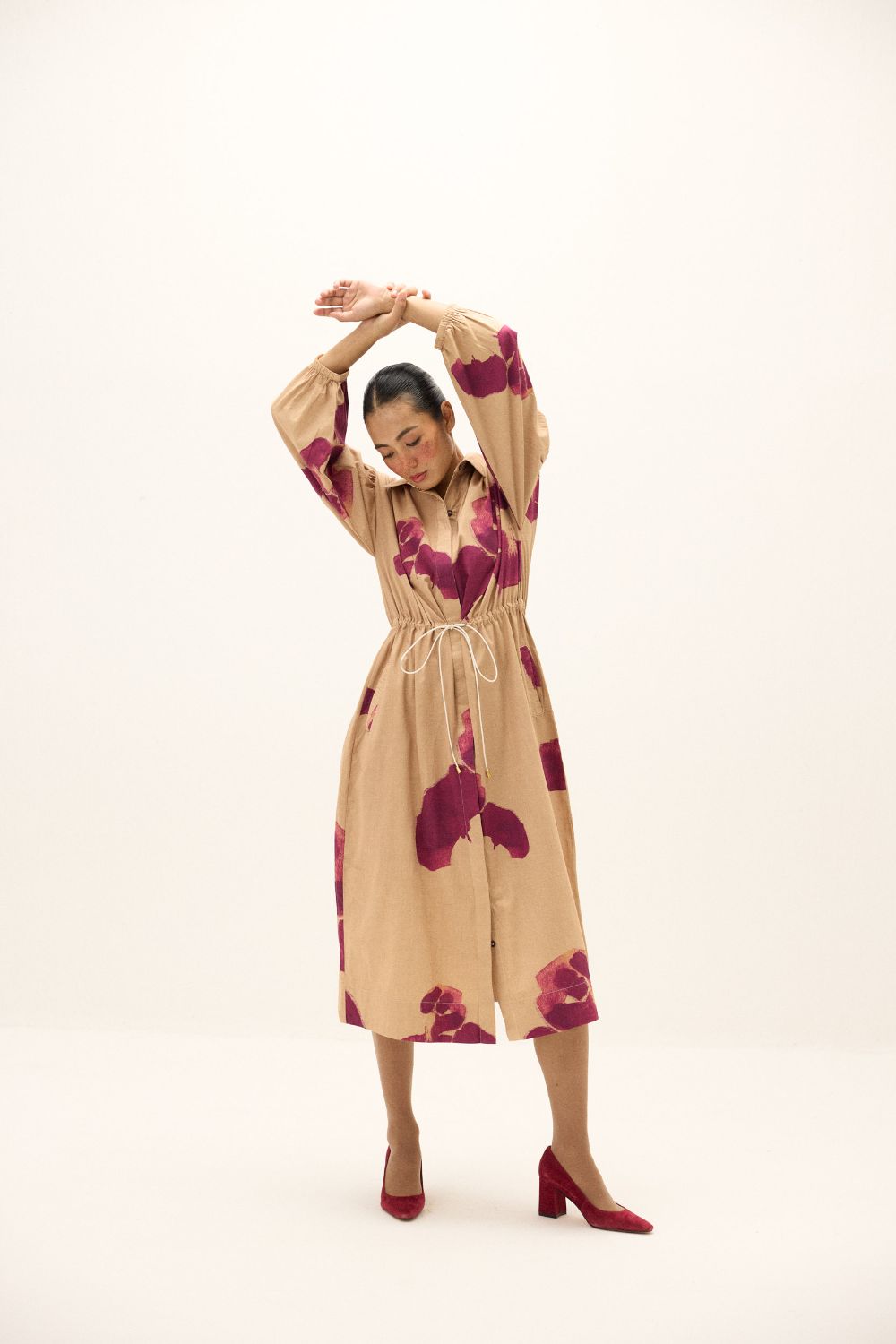 A button-down midi dress in soft cotton, featuring bold hand-painted style prints in deep berry tones. Designed with a drawstring waist for adjustable fit, gathered sleeves with cuff detailing, and side pockets for ease. A versatile day-to-evening silhouette with a relaxed yet refined charm.