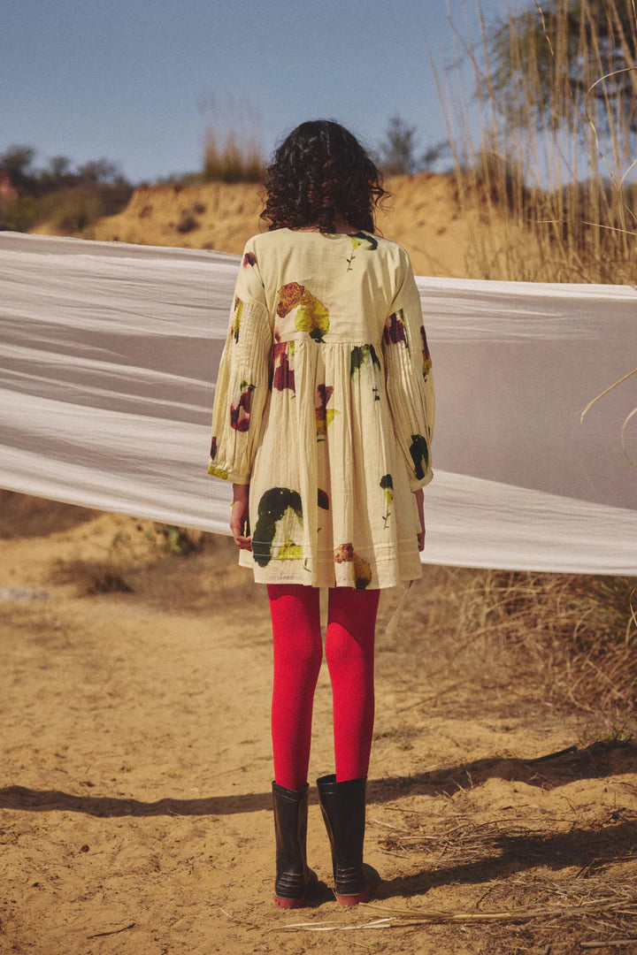 A free-flowing dress with soft pleats and billowy sleeves, finished with delicate tie-up details. Crafted in cotton mul with an abstract floral print, its perfect for a whimsical yet sophisticated look.