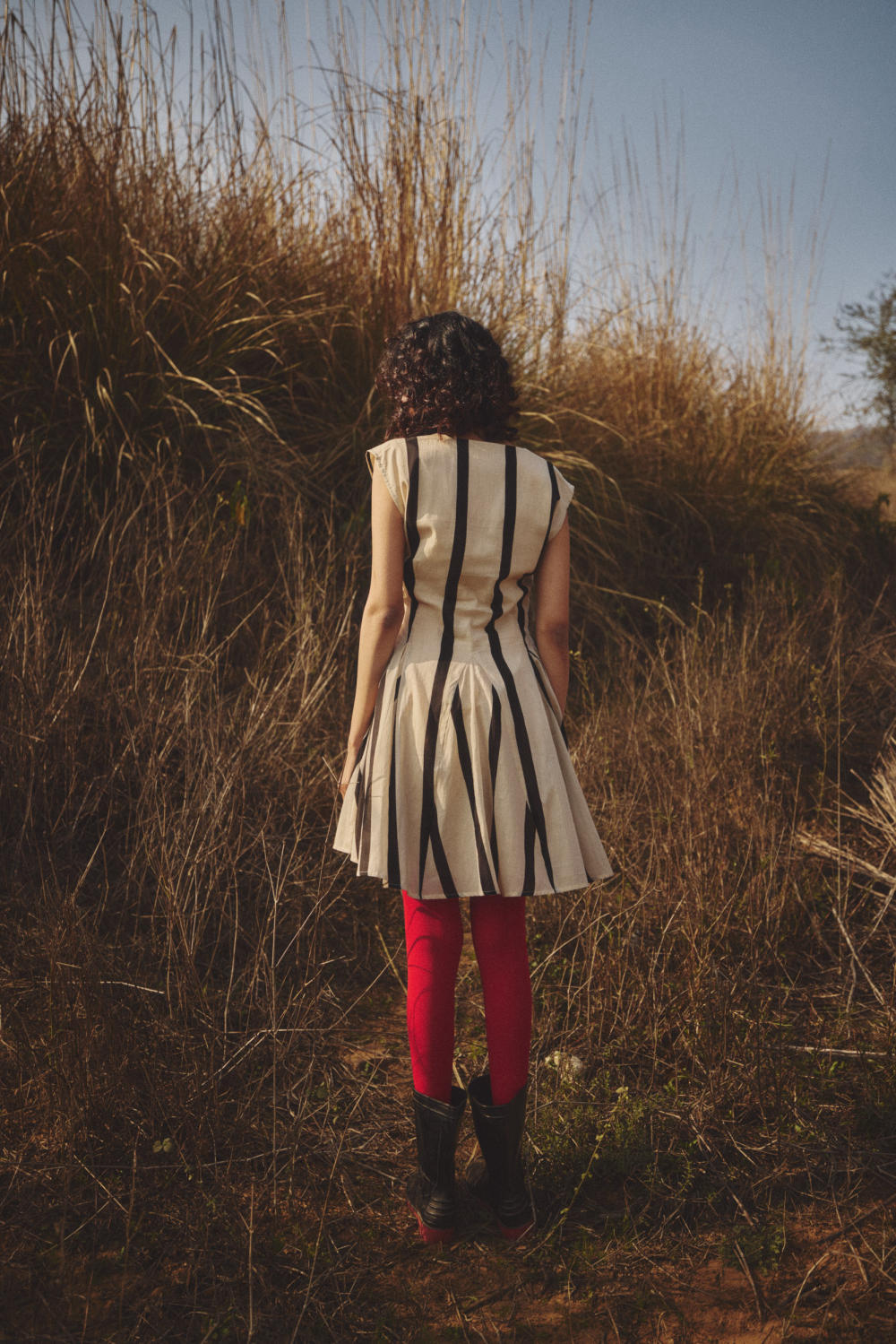 A structured yet playful silhouette featuring bold vertical stripes and sharp pleats. crafted in cotton mul. Its cap sleeves and flared hem add movement, making it a statement piece with a modern edge.