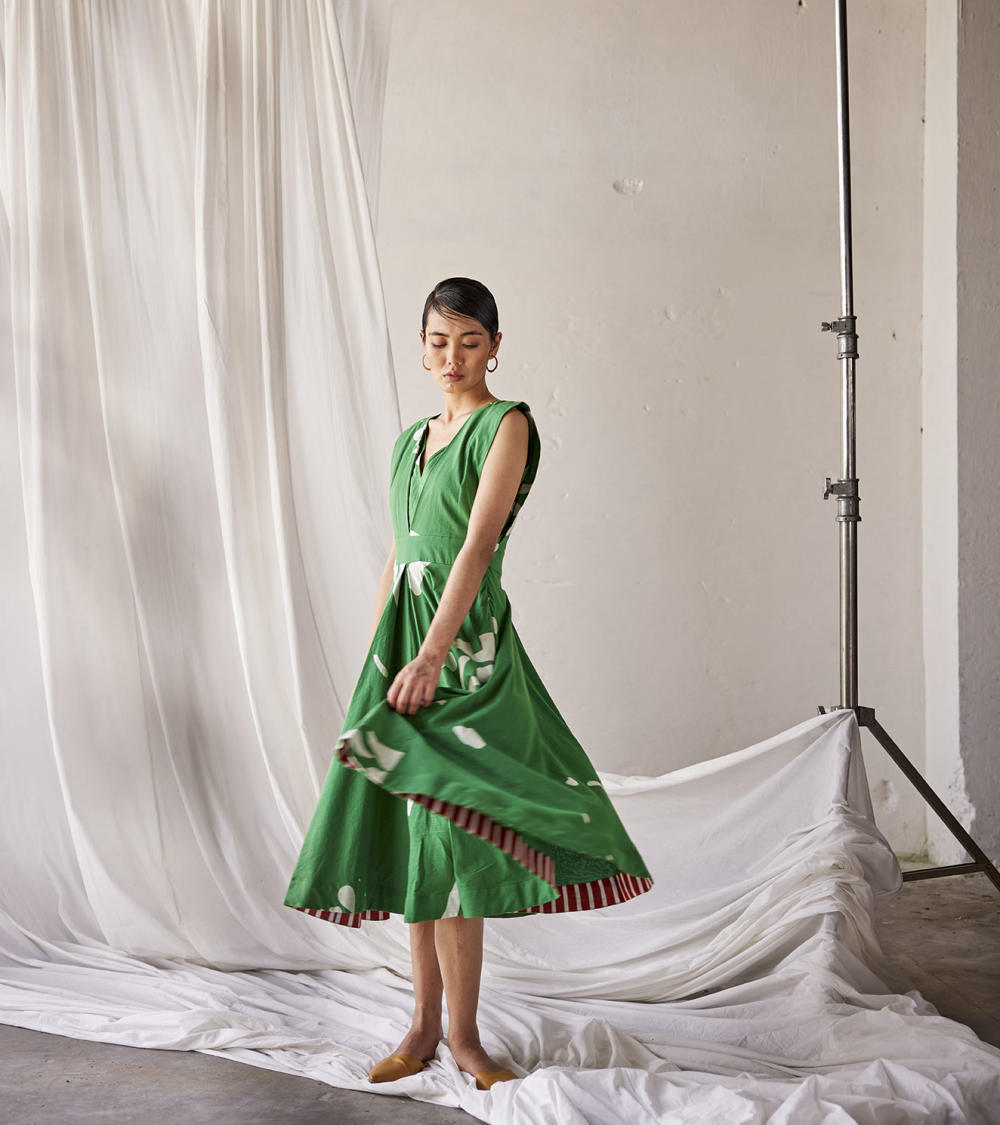 A forest green terracota print mul dress with a V neckline, side zip and inverted pleat detailing at the front and back. Comes with a red and white striped facing at the inner hemline.