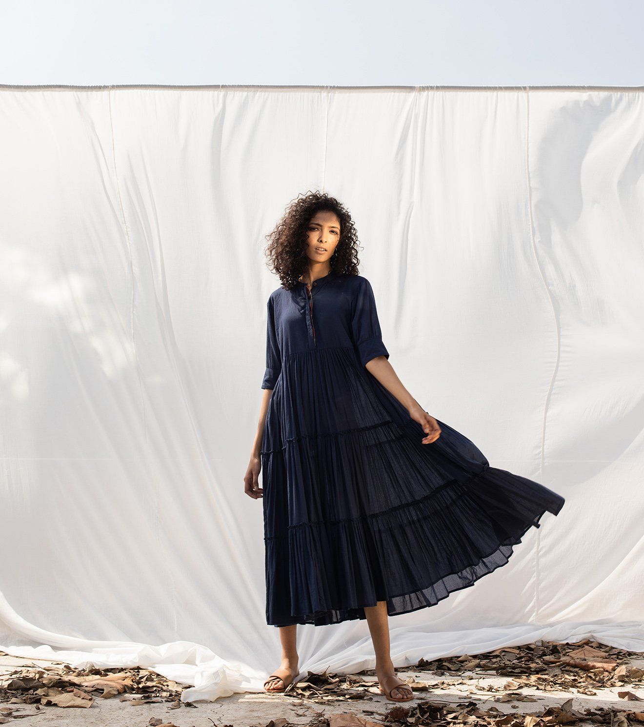 Navy mulmul tiered midi with a mandarin collar, invisible placket and three-fourth sleeves.