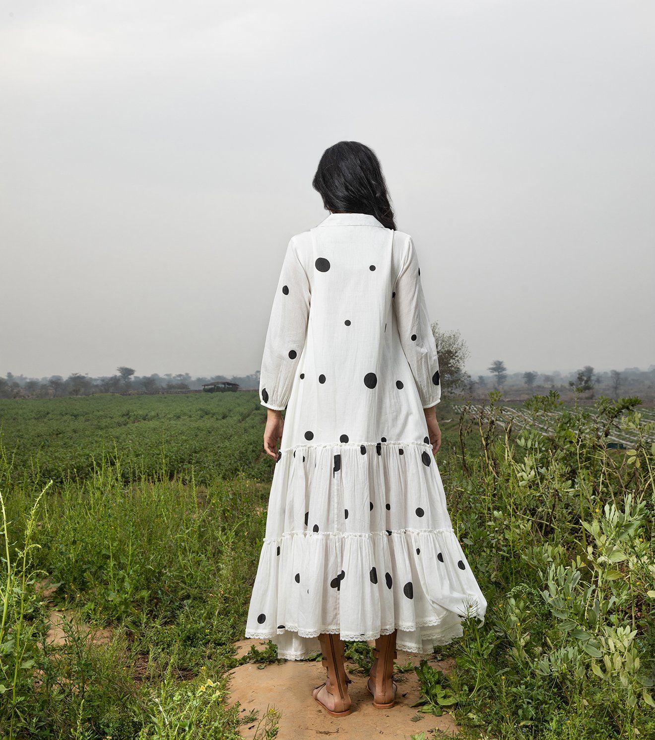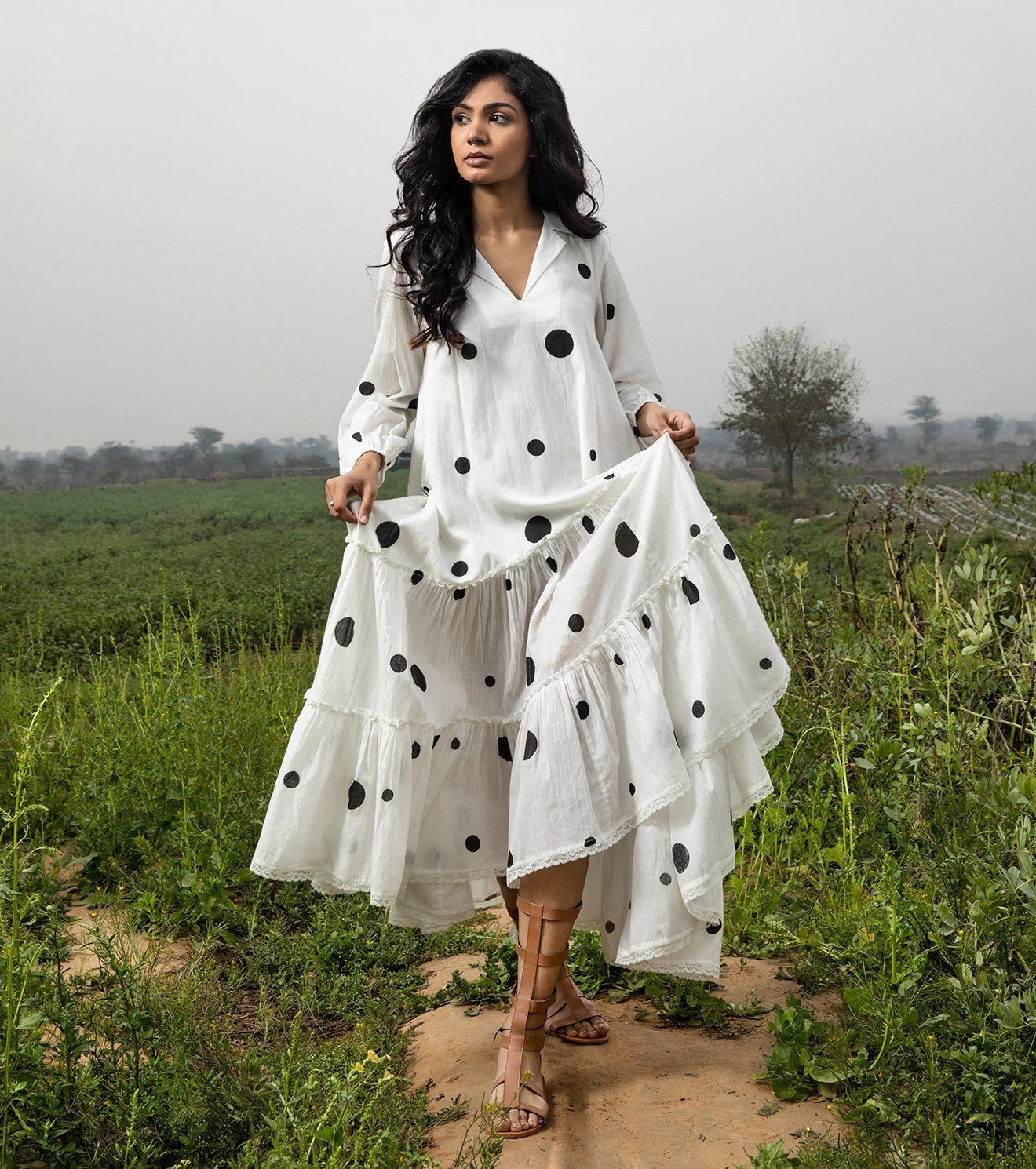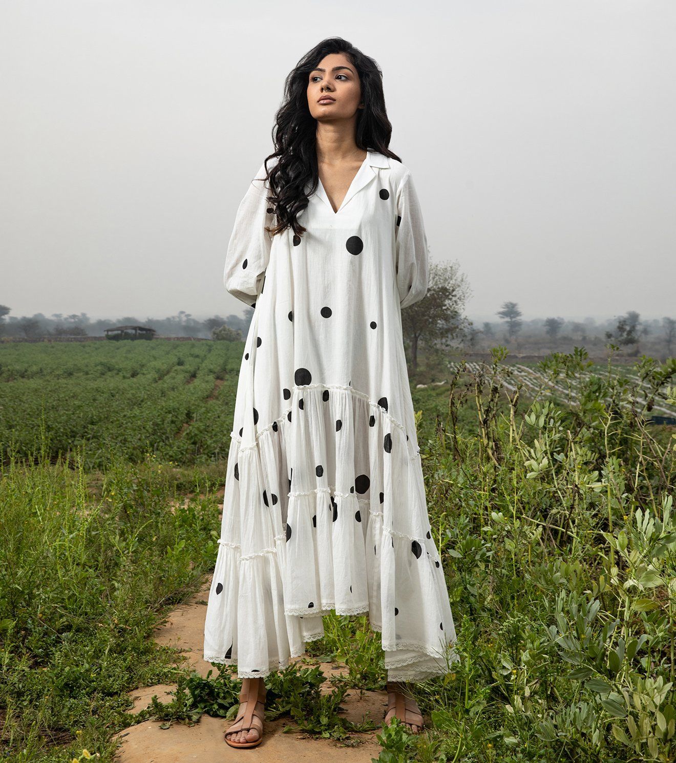 Ivory maxi dress, V - neck, bishop sleeves, frilled and tiered bottom, flouncy hemline, and black block printed polka.