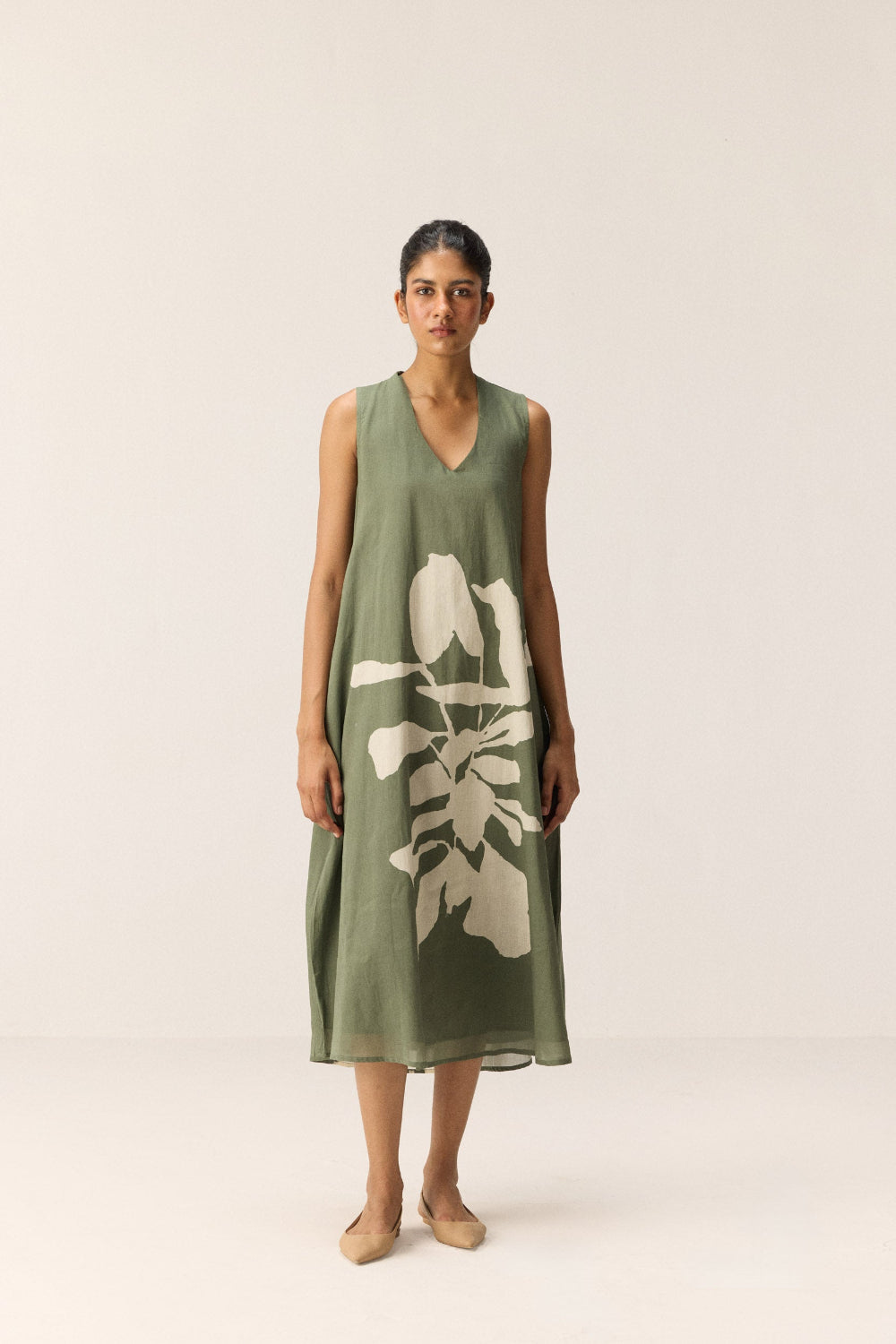 A sleeveless sage green dress crafted in soft cotton mul, featuring a curved V neckline and an abstract white floral print on the front. Finished with side seam pockets, this piece balances subtle elegance with everyday comfort.