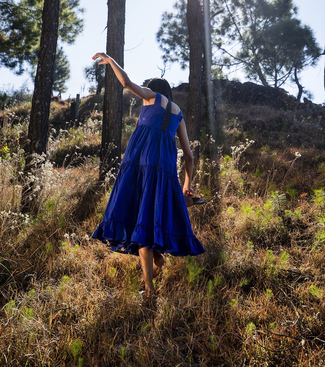"As light as the air. Heavy as a falling sky. A sleeveless tiered fit and flare midi dress with a square neckline and empire yoke.