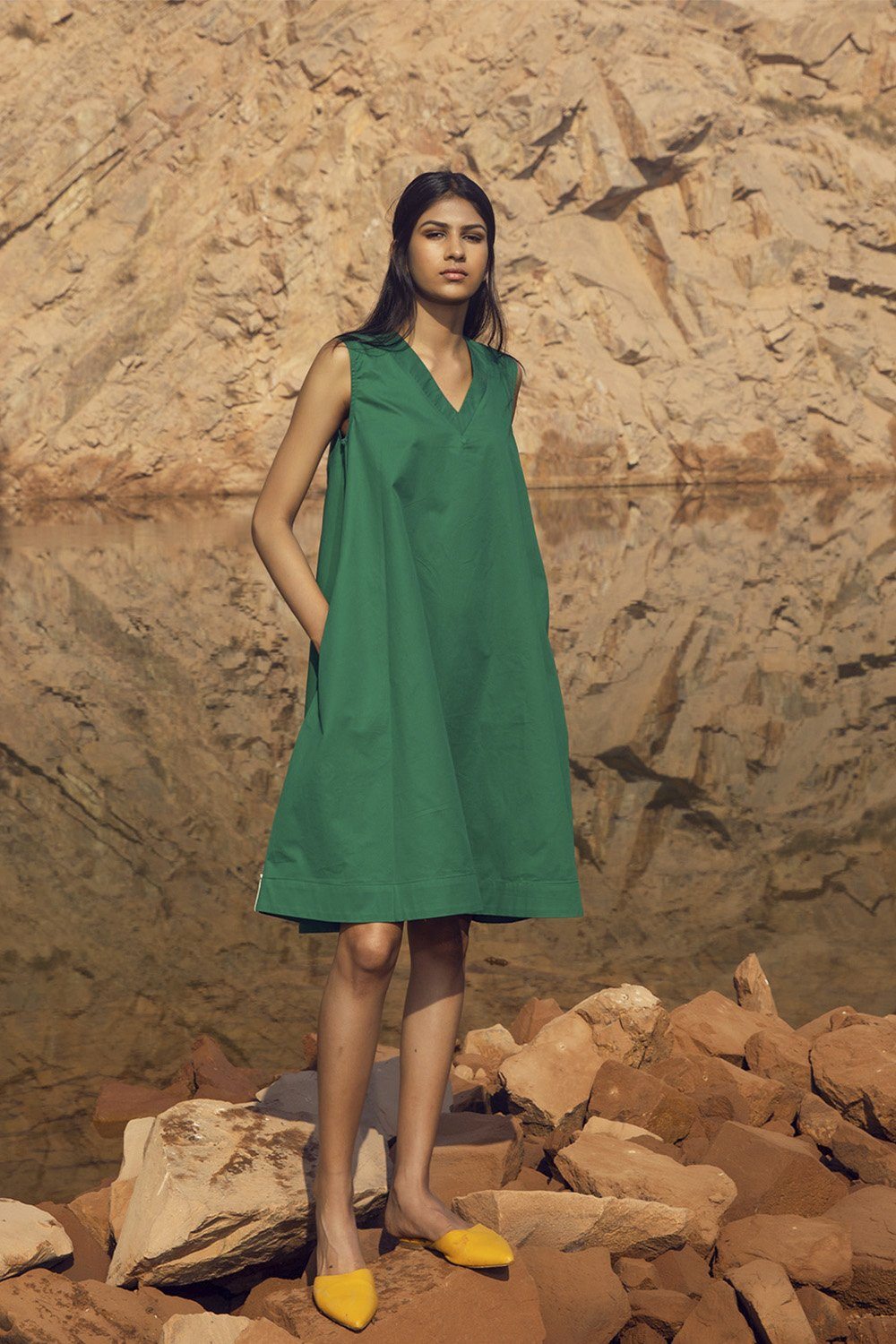 Harmony touches the soul, but you can't sing it alone. A sleeveless shift dress in emerald green made with Poplin. Features a V-neckline and knee-length hemline.