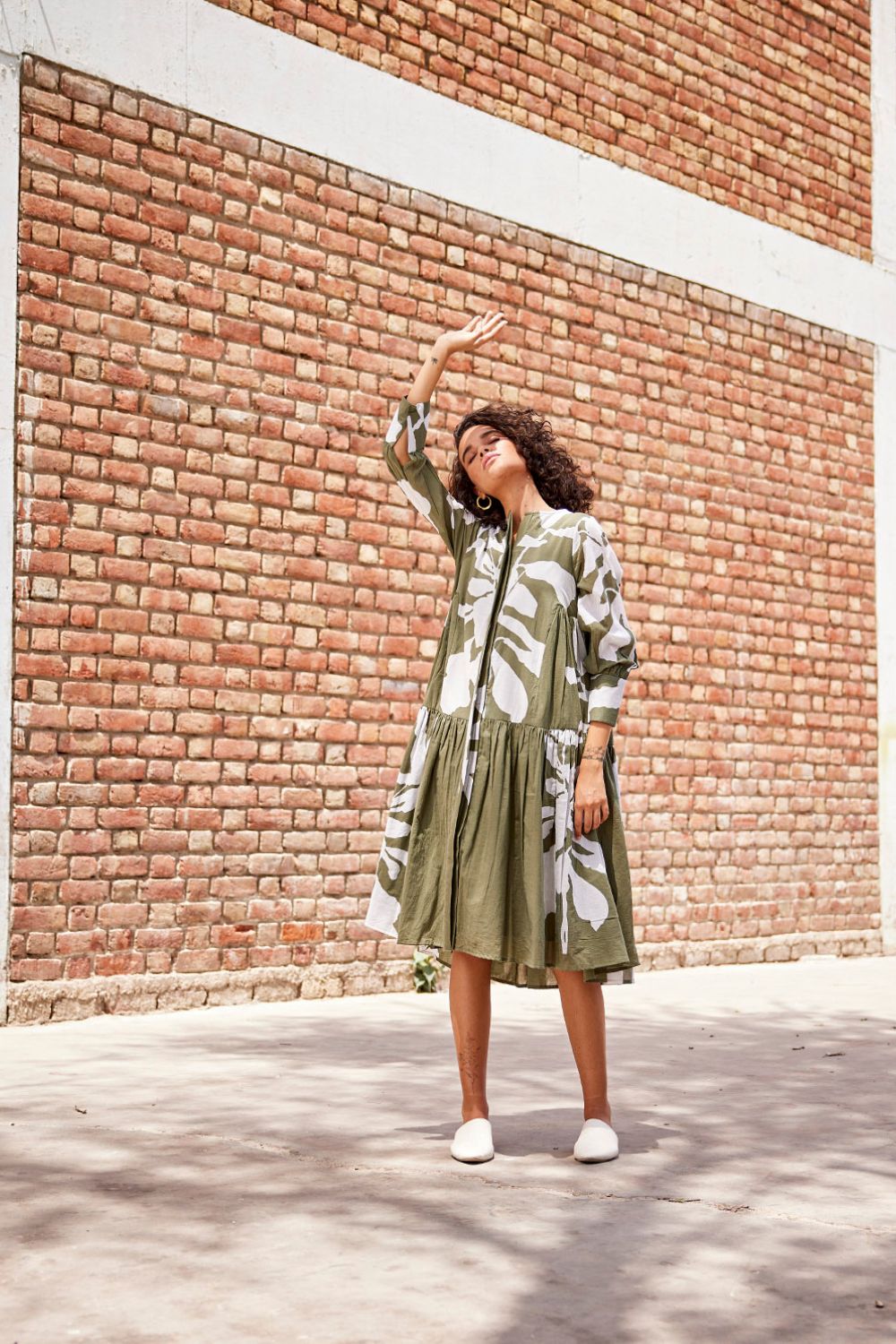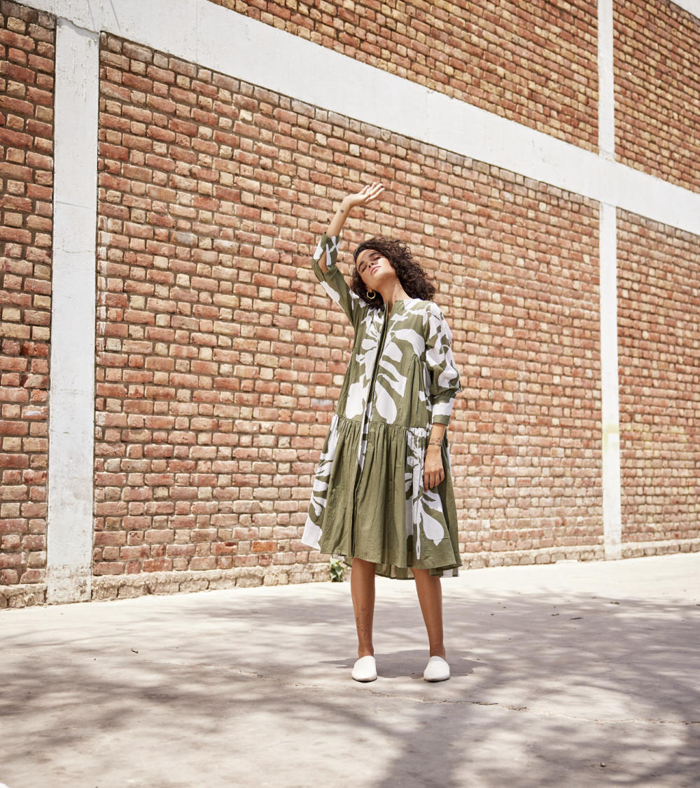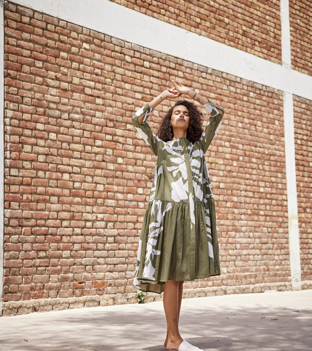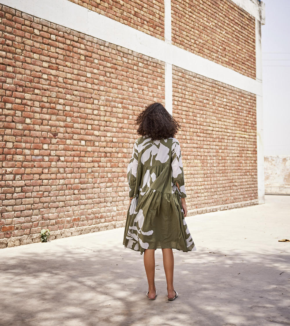 An olive green lino print mul drop waist tent dress with an invisible placket, flounced bottom tier and full sleeves.