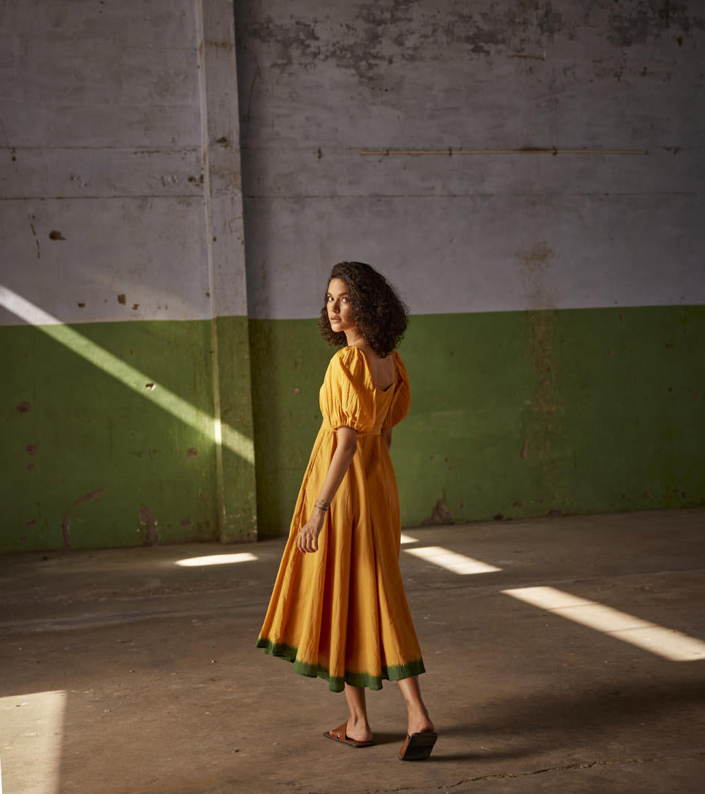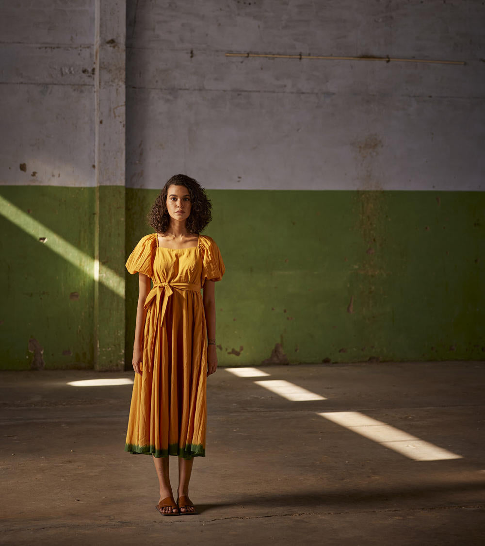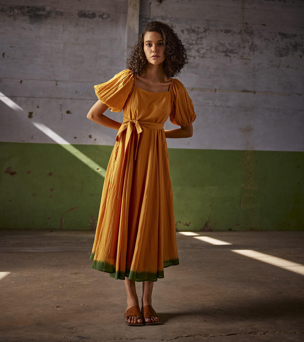 An orange midi mul dress with puff elasticated sleeves, side zip and dip dyed in dark green. Comes with a fabric belt to cinch the waist.