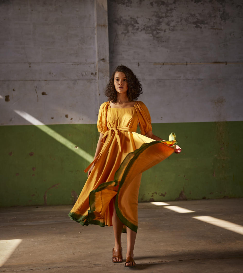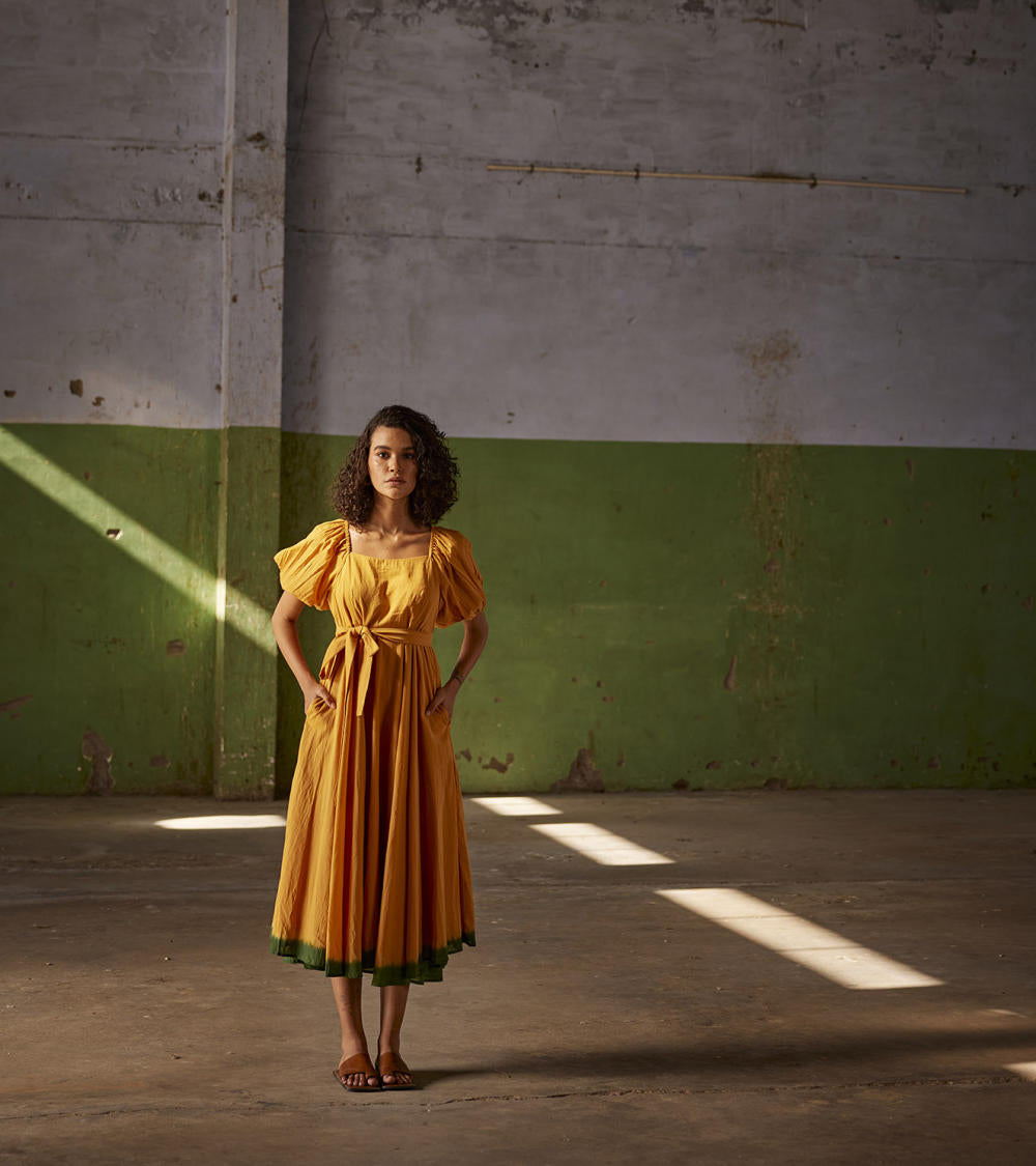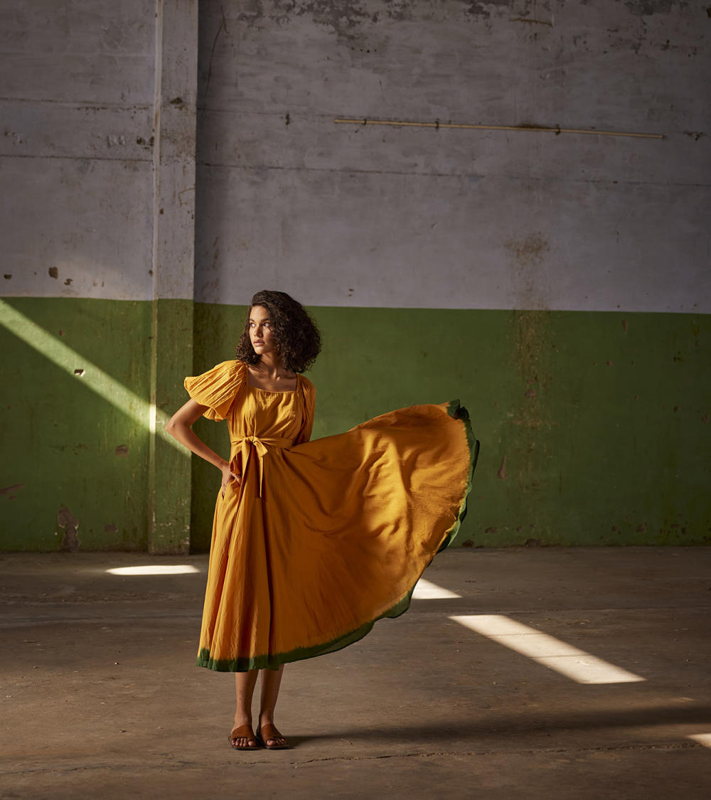 An orange midi mul dress with puff elasticated sleeves, side zip and dip dyed in dark green. Comes with a fabric belt to cinch the waist.