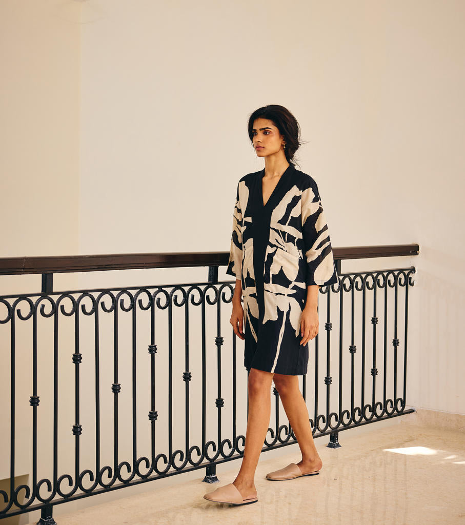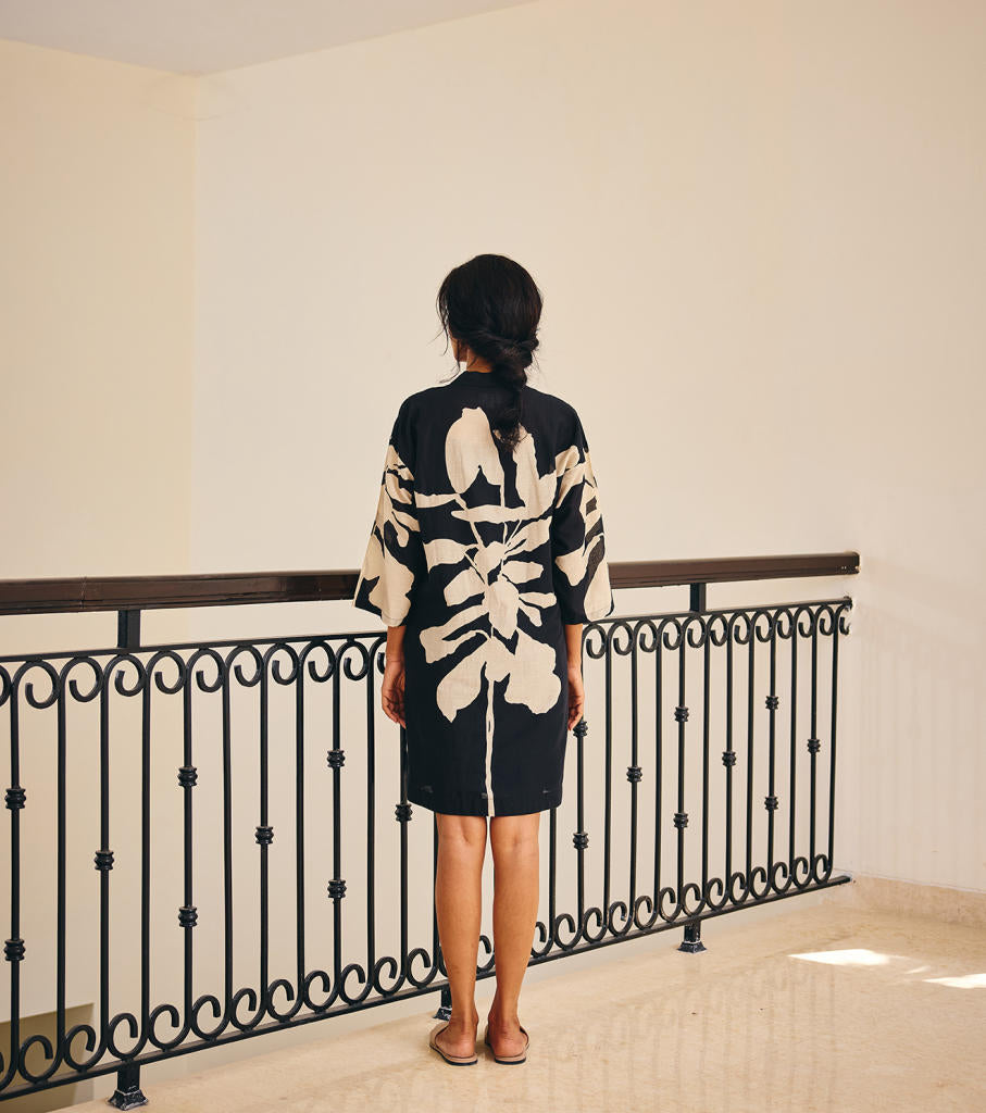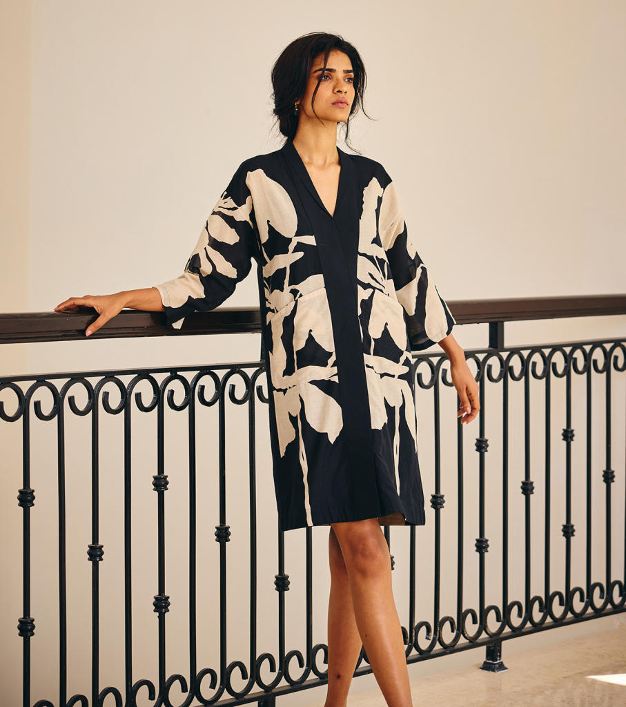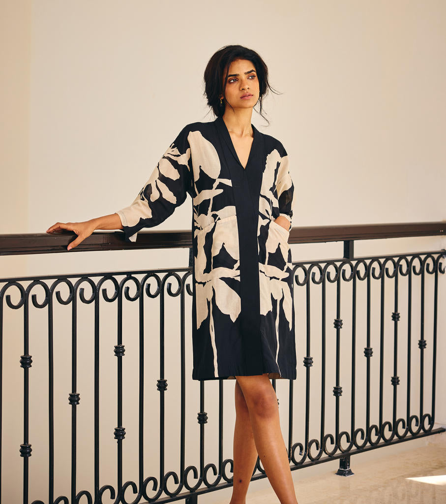 A black and white floral printed dress featuring a v neckline crafted in soft cotton mul , comes with an inner slip.