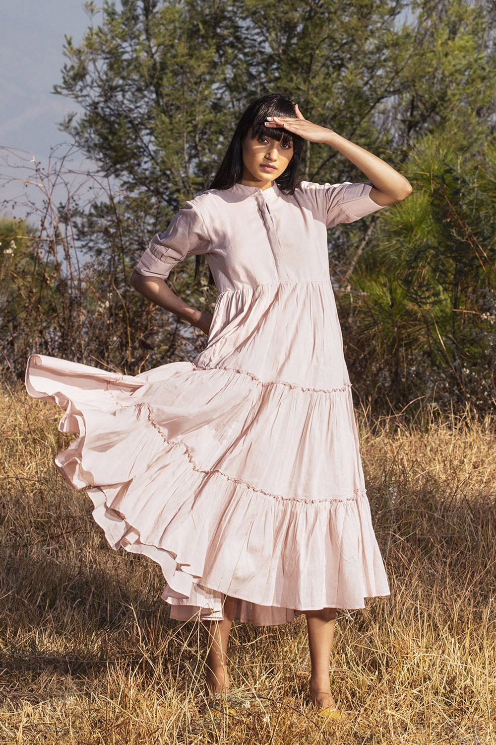 "From little acorns mighty oaks grow. Mulmul tiered midi with a mandarin collar, invisible placket and half sleeves.