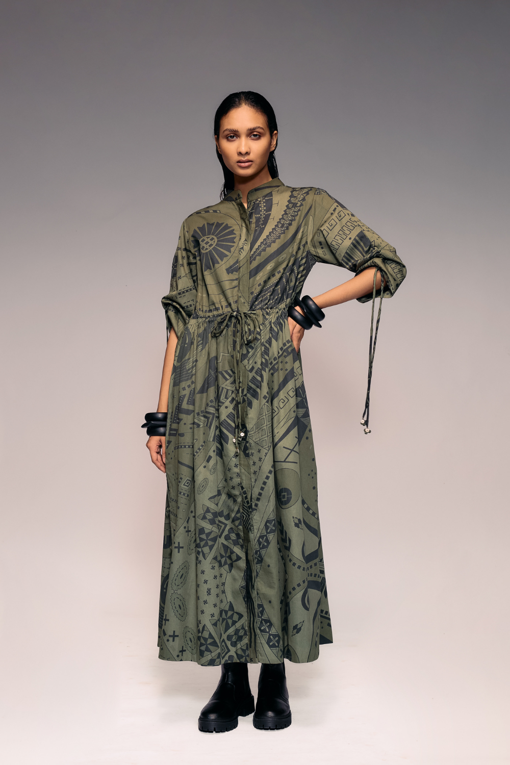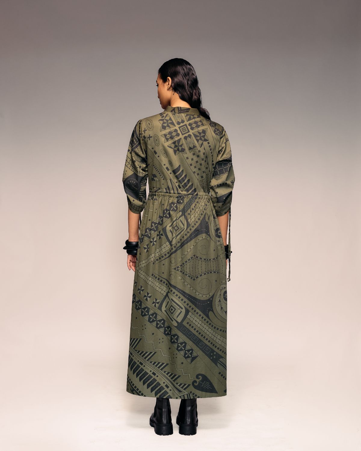 Rendered in tones of black and olive, the dress features tribal-modern aesthetic,