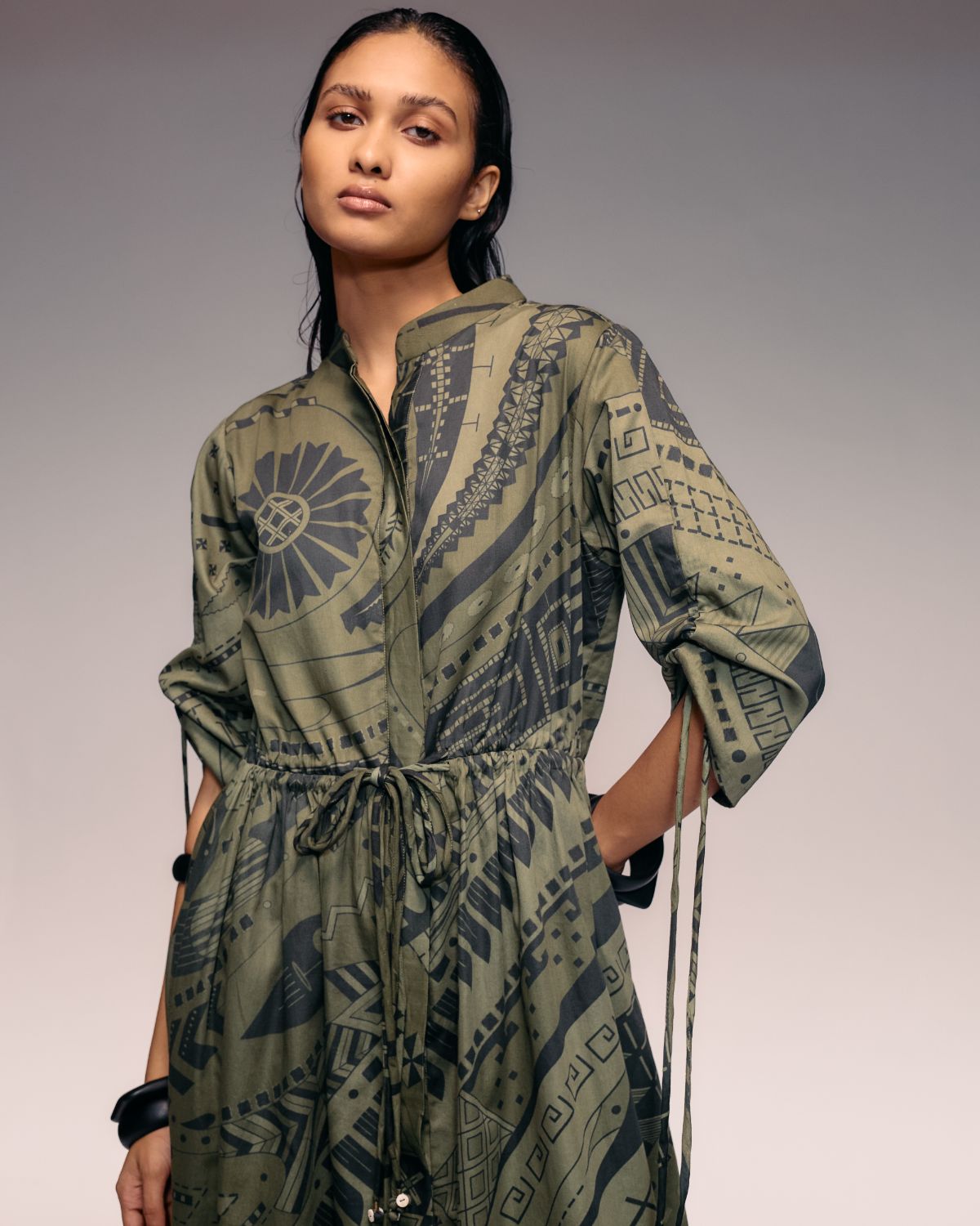 Olive Print Drawstring Dress is a perfect blend of craft and modern minimalism.