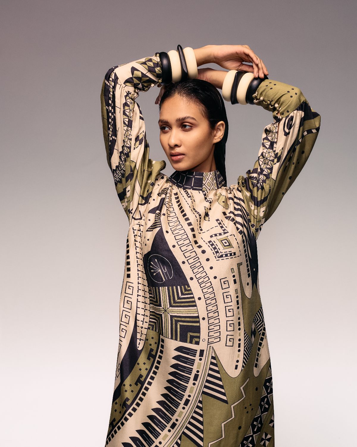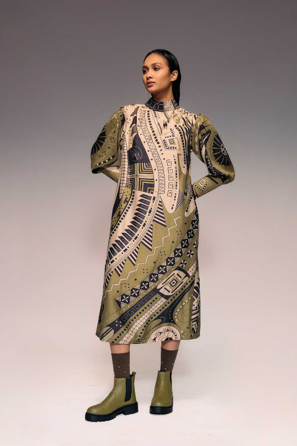 This Olive Print Silk Midi captures modern femininity with a hint of couture simplicity. The midi length offers graceful movement, while the silhouette gently skims the body flattering without clinging. Crafted in pure silk, the fabric embodies a natural sheen that enhances the essence of earthen artistry inspired print. Pair this midi dress with black heels or mules and minimal gold jewelry. Perfect for festive soirées, destination dinners, or cocktail events.