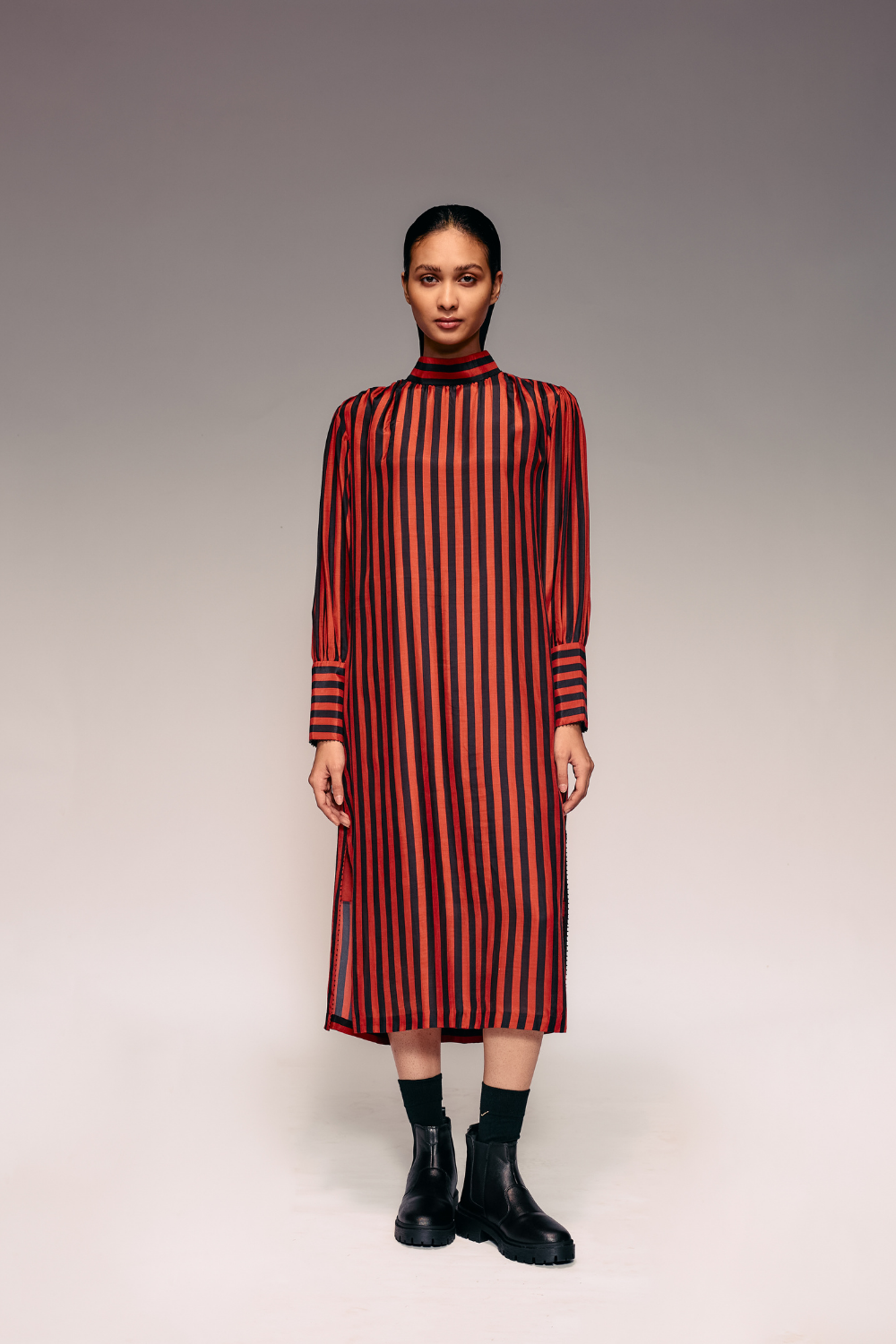 A refined midi silhouette crafted in soft silk, the Rust Black Stripe Midi