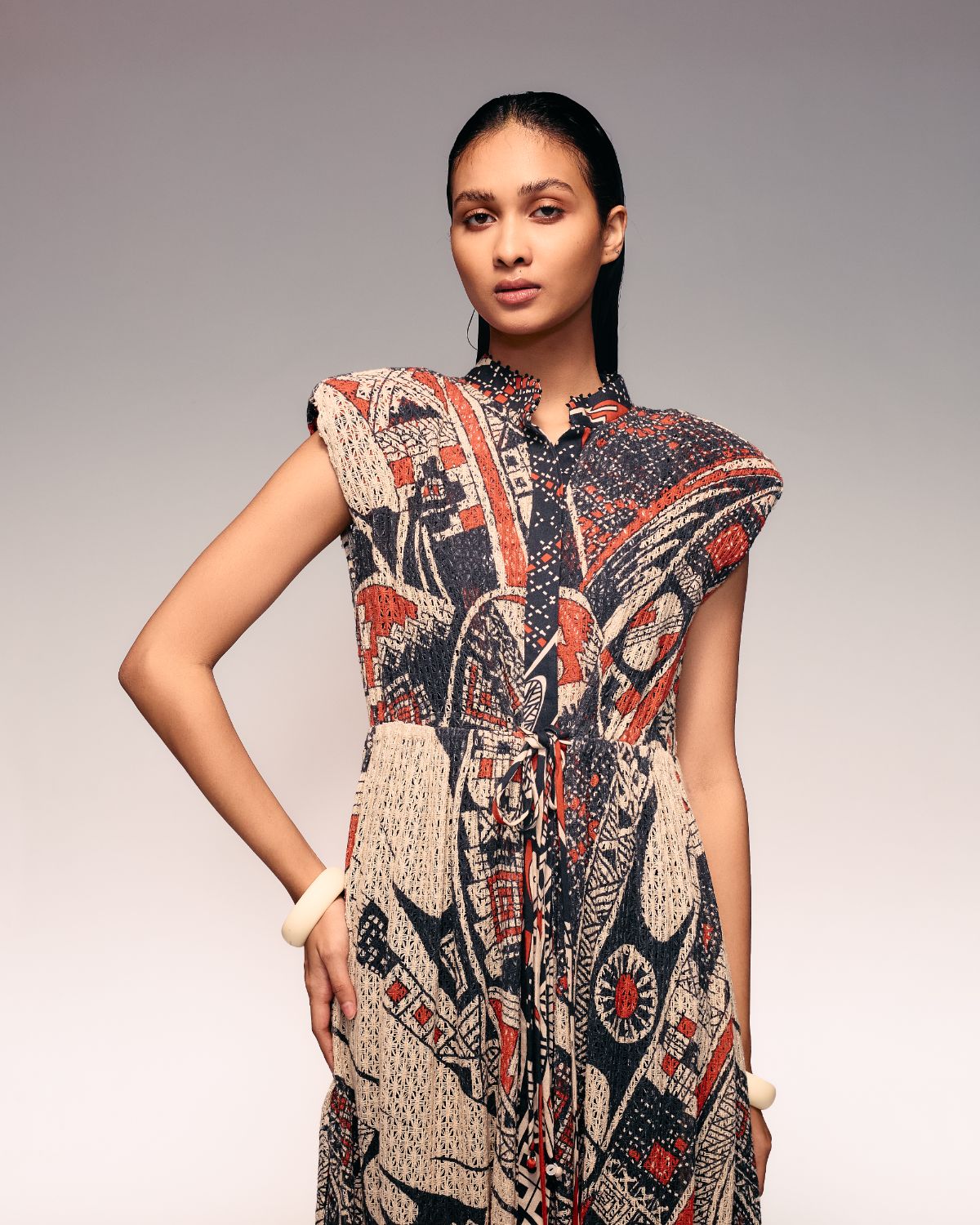 Inspired by Mata Ortiz pottery, this sleeveless cotton-net dress combines