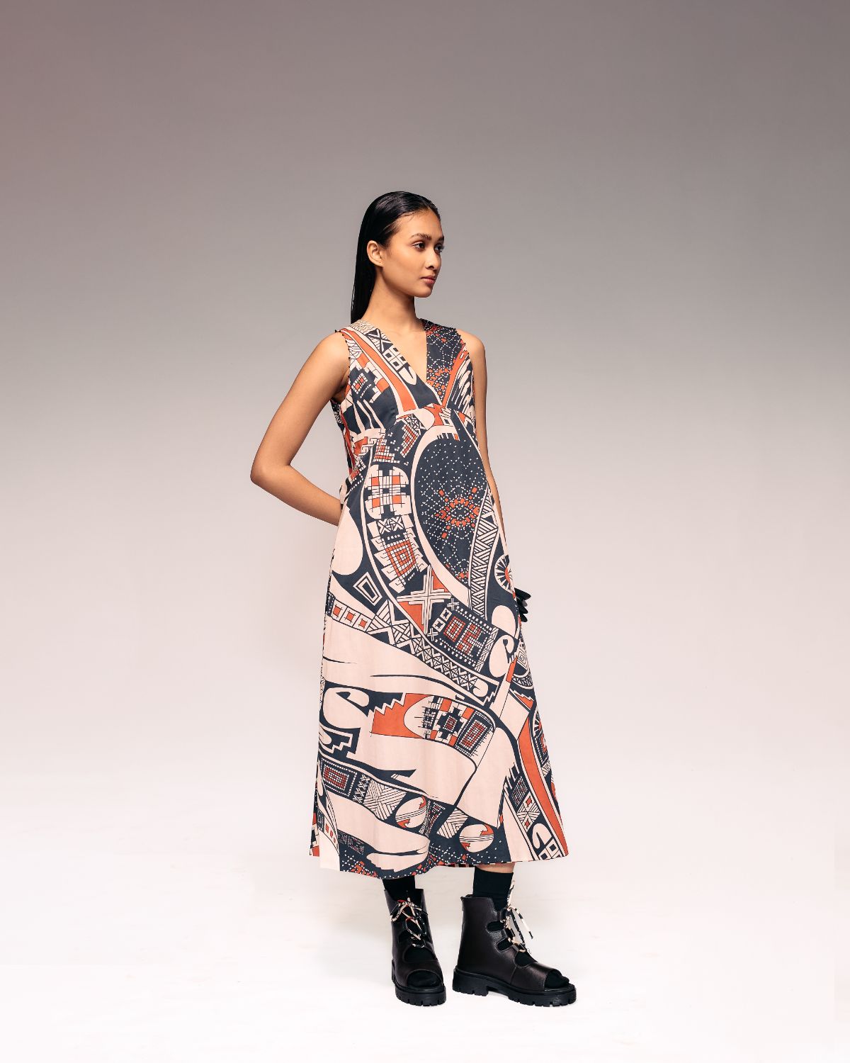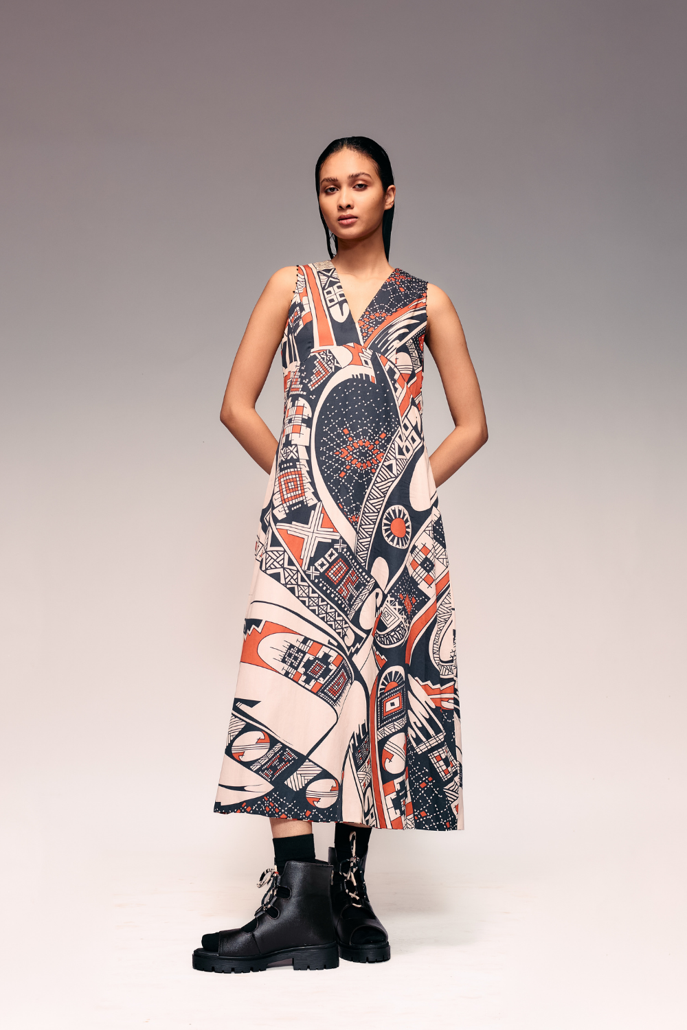 A versatile silhouette blending ease and artistry, this reversible dress features dual prints in rust and black tones inspired by earthy pottery motifs. The V- neckline adds a modern edge, while its soft, breathable fabric ensures graceful movement. Each seam is neatly finished with double stitching, highlighting high-quality craftsmanship. Style it as a day dress or reverse it for an evening- ready look. Ideal for vacations, brunches, and sophisticated gatherings in spring or autumn.