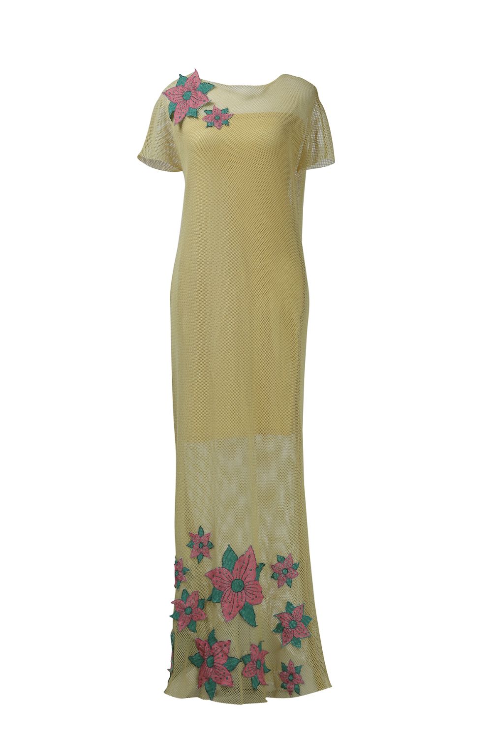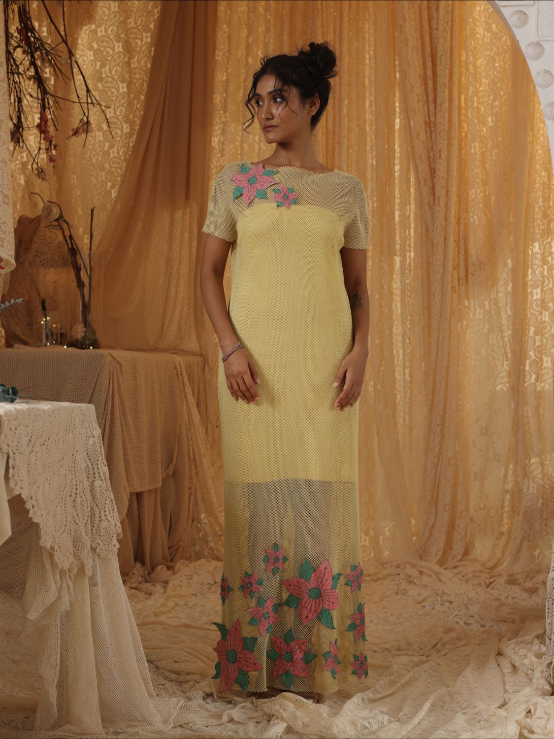 Delicate yet daring, this dress layers sheer yellow cotton net mesh with artistic pink flower appliqués for a standout statement. A soft jersey tube dress underneath adds structure and coverage while keeping things light and breathable. Dreamy, textured, and effortlessly romantic, it’s designed for tropical soirées, artful getaways, or fashion-forward resort moments.