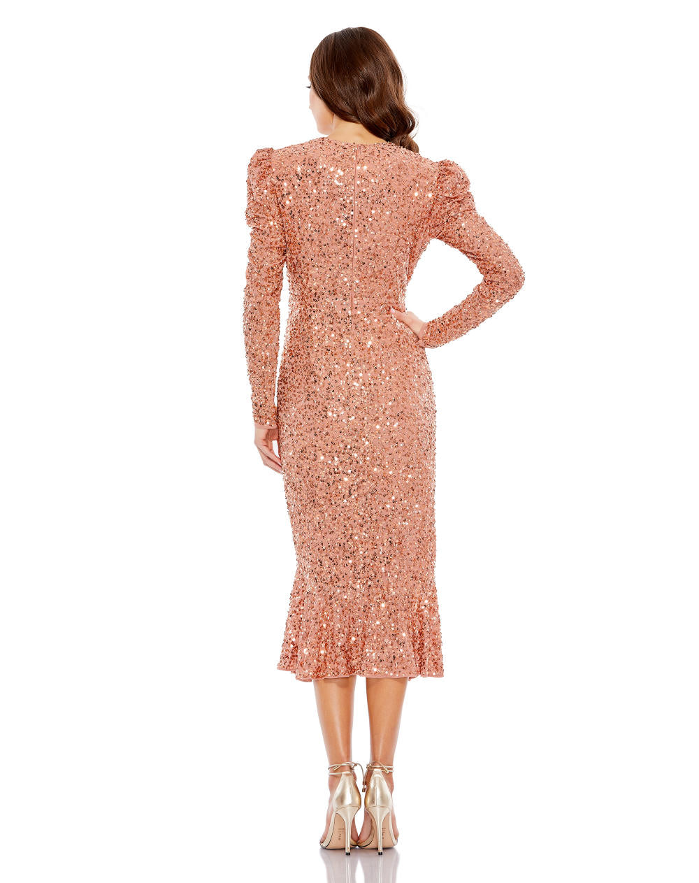 SEQUINED LONG SLEEVE HIGH NECK TRUMPET DRESS