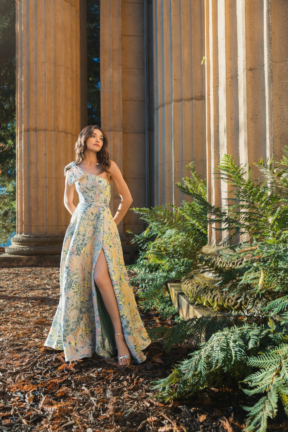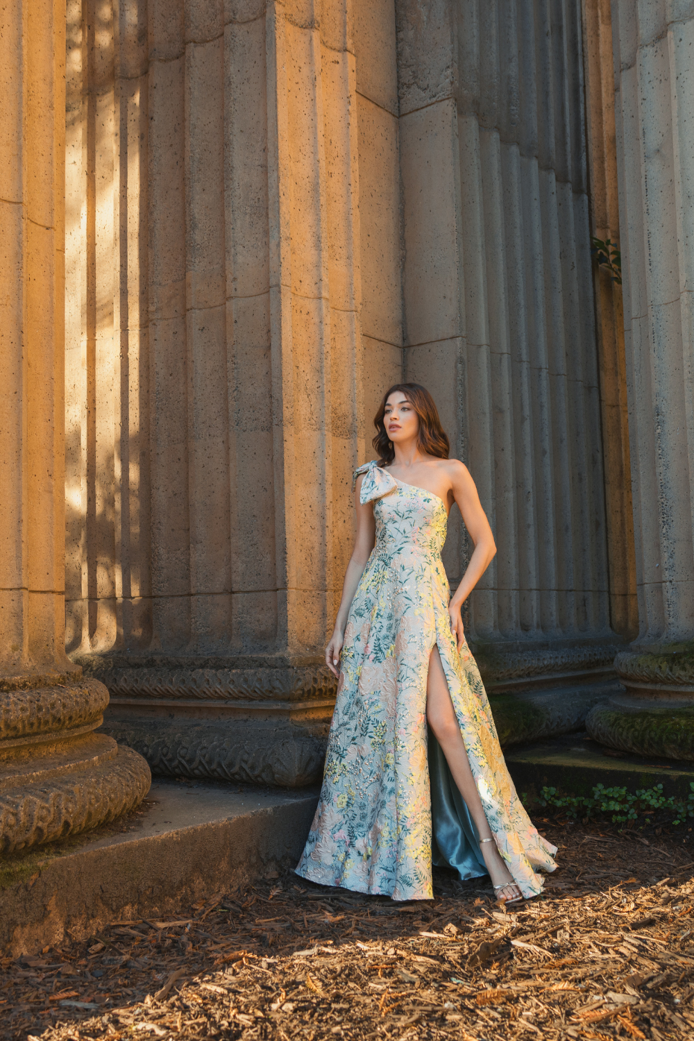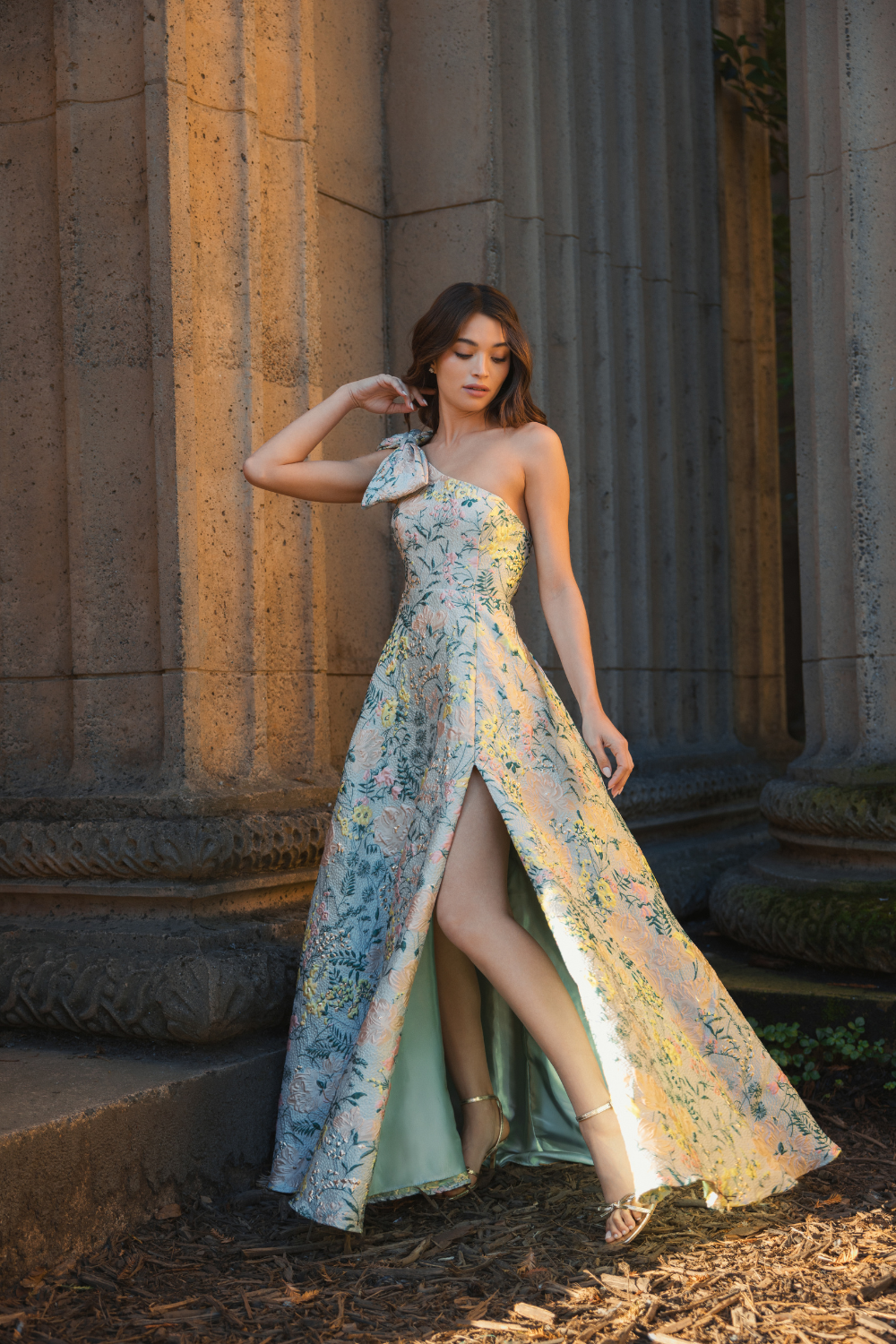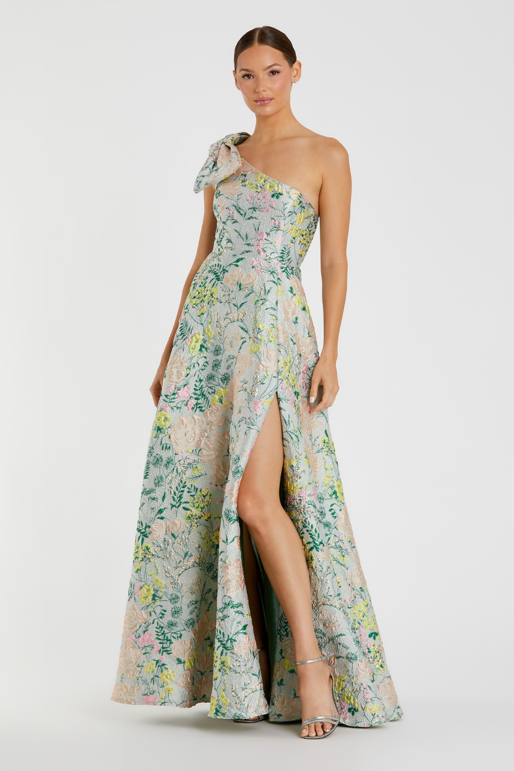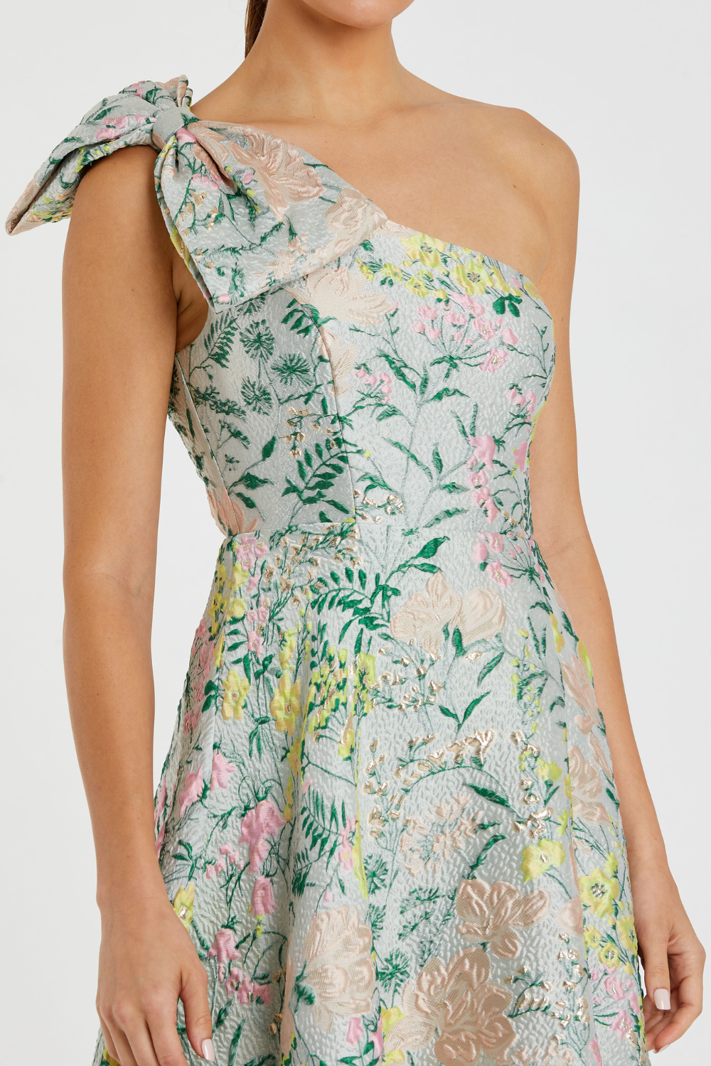 Multicolor One Shoulder Brocade Floral Dress With Bow