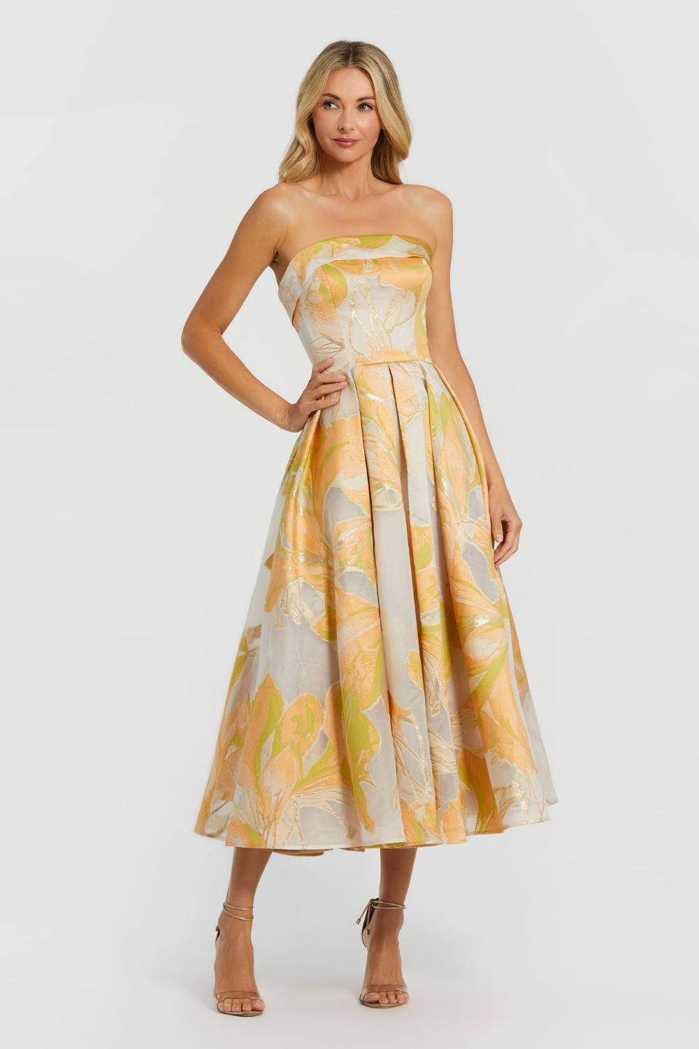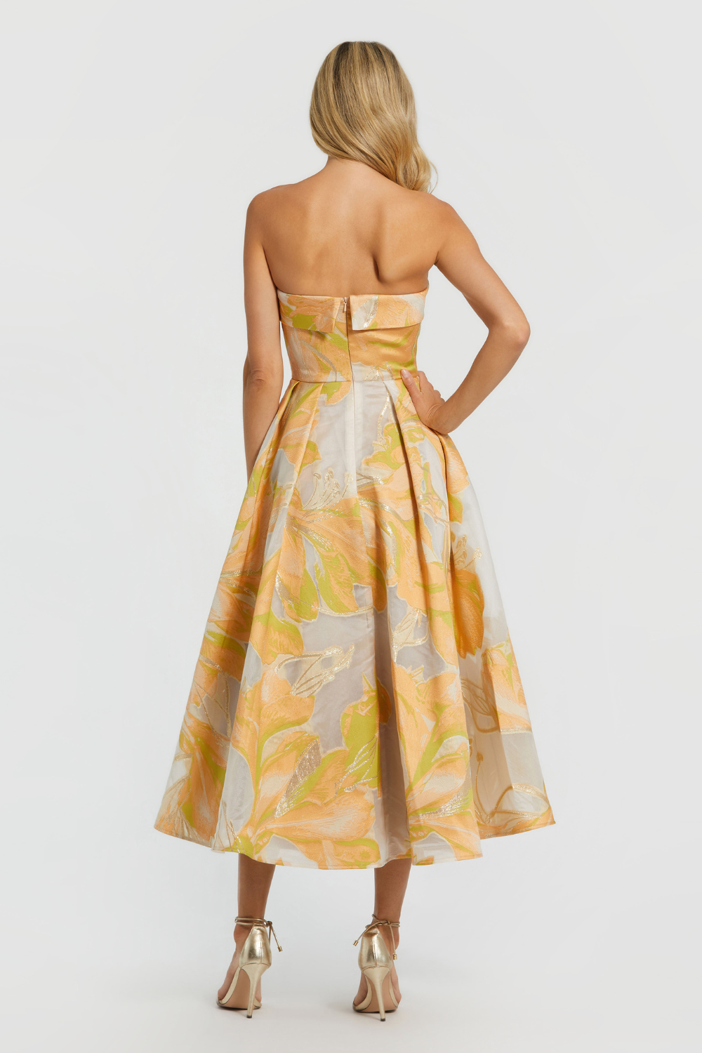 Beige and Orange Strapless Brocade Midi Dress with Pockets