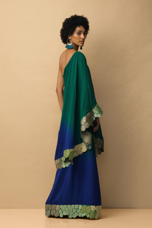 This is an emerald and royal blue shaded dress with an applique embroidered border made of handwoven Banarasi floral design motifs. This dress is inspired by the traditional Greek toga dress.
