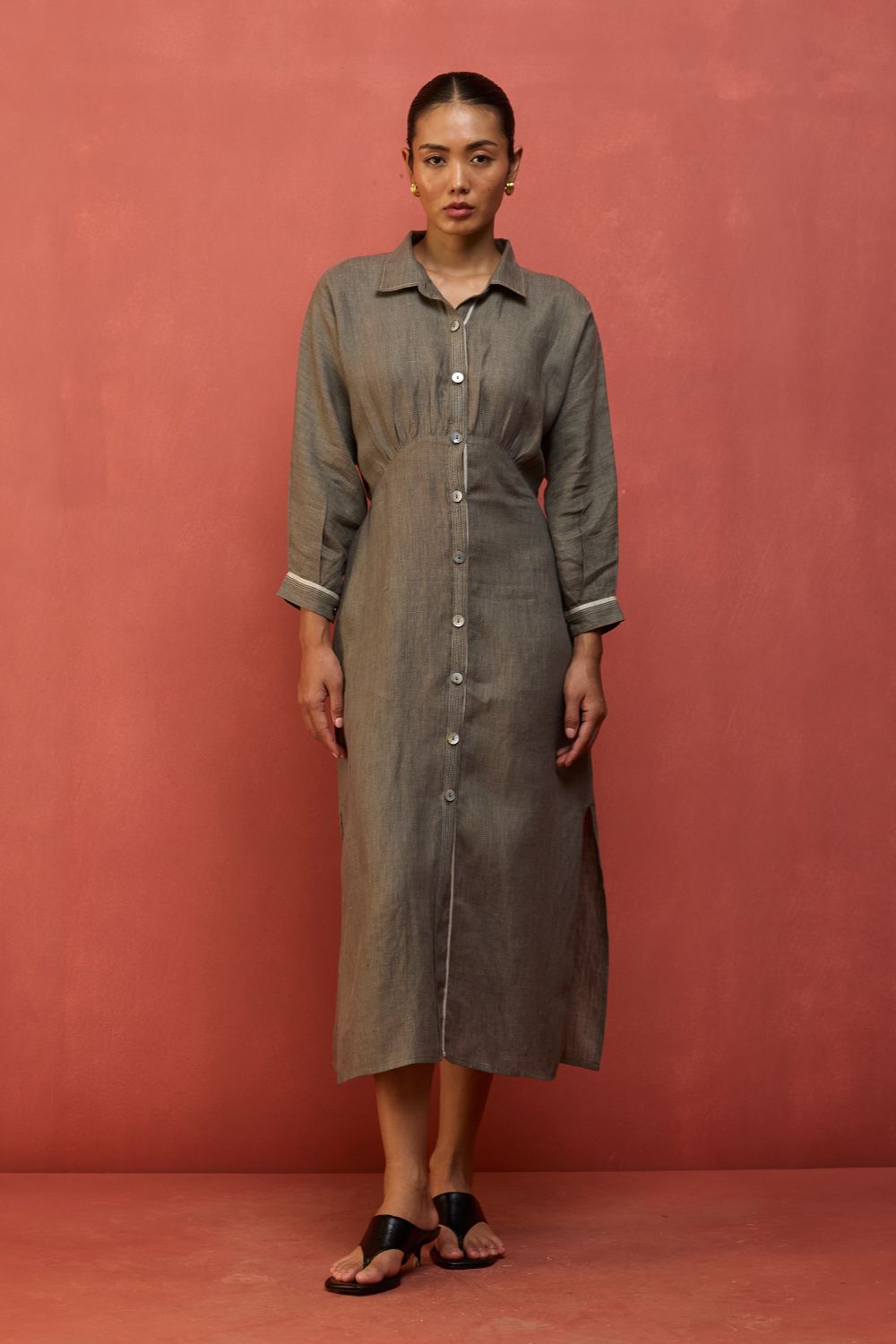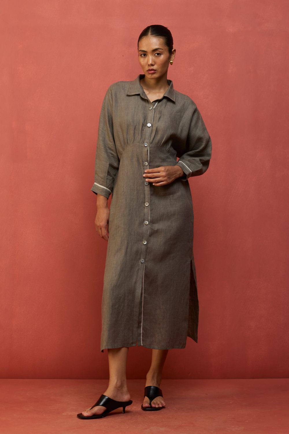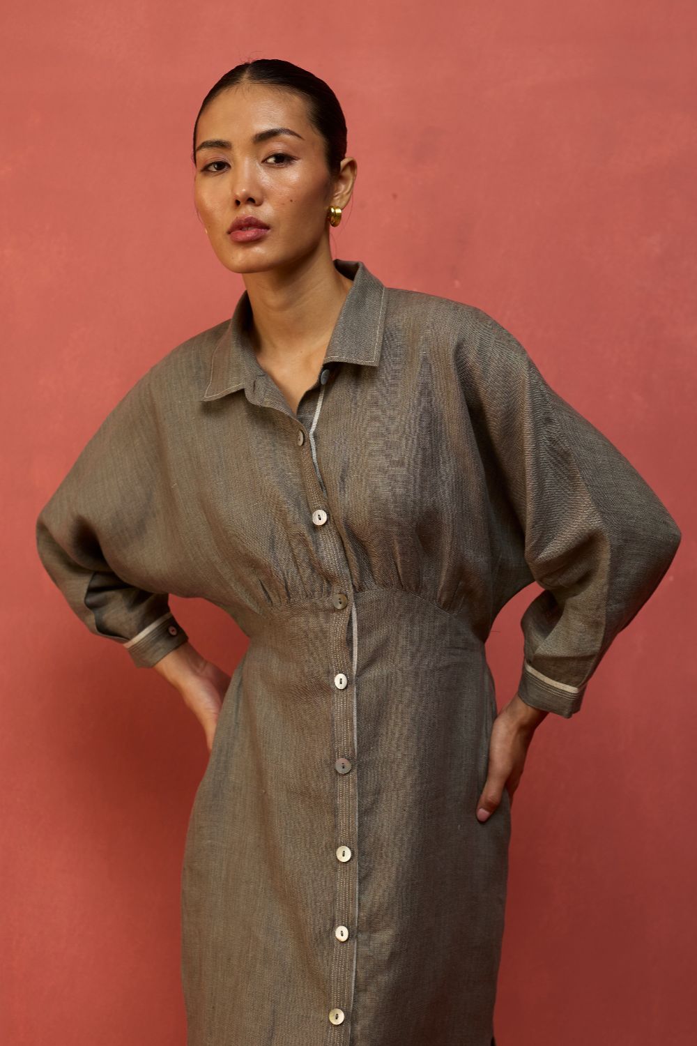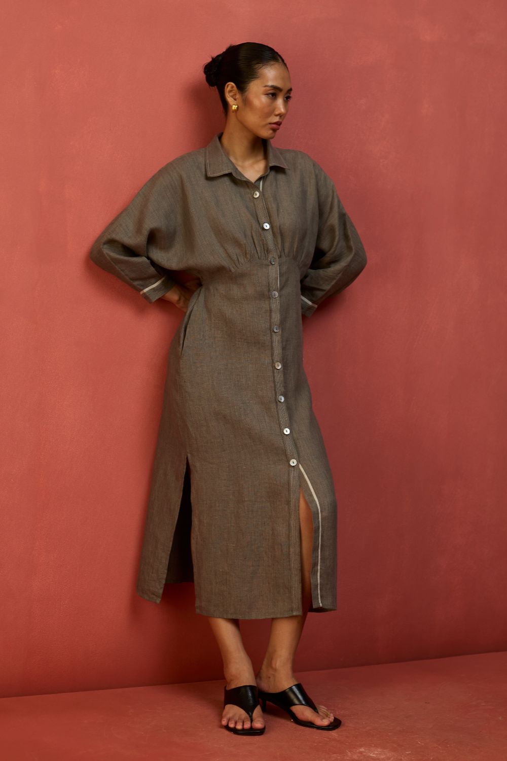This buttoned flared dolman sleeve dress is thoughtfully designed in our signature yarn-dyed linen. It features a drawstring at the waist for a flattering, shaped silhouette along with contrast woven selvedge and top-stitch detailing along the sleeve cuffs and placket. The Masaru is elevated with oversized mother-of-pearl buttons and thoughtfully finished with pockets and side slits for ease of movement. Pair it with statement hoops or cuffs for a timeless look.
