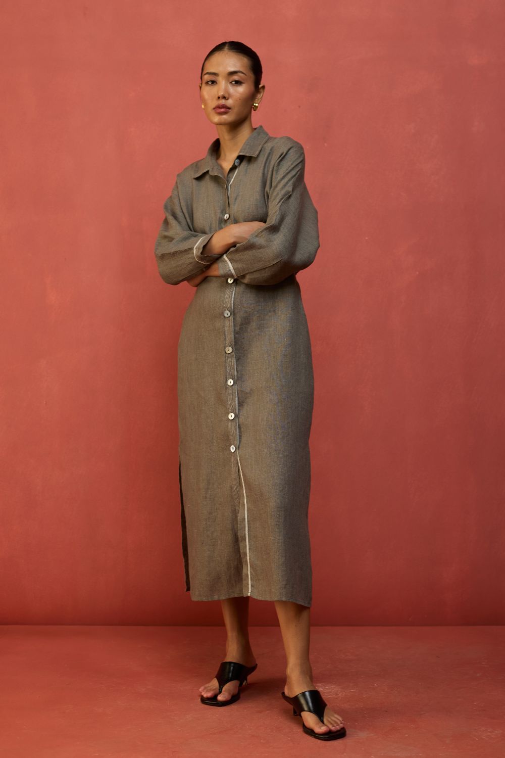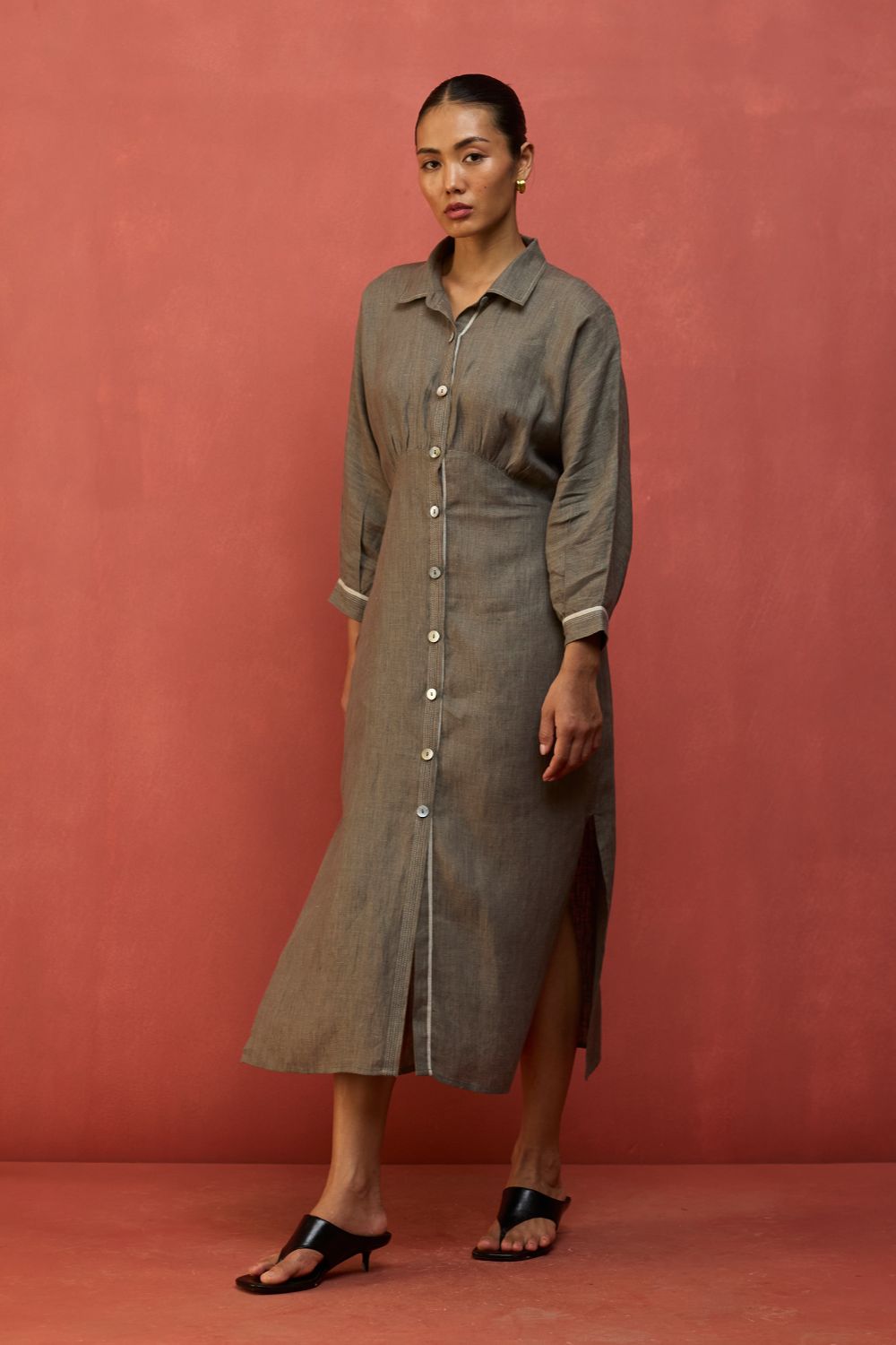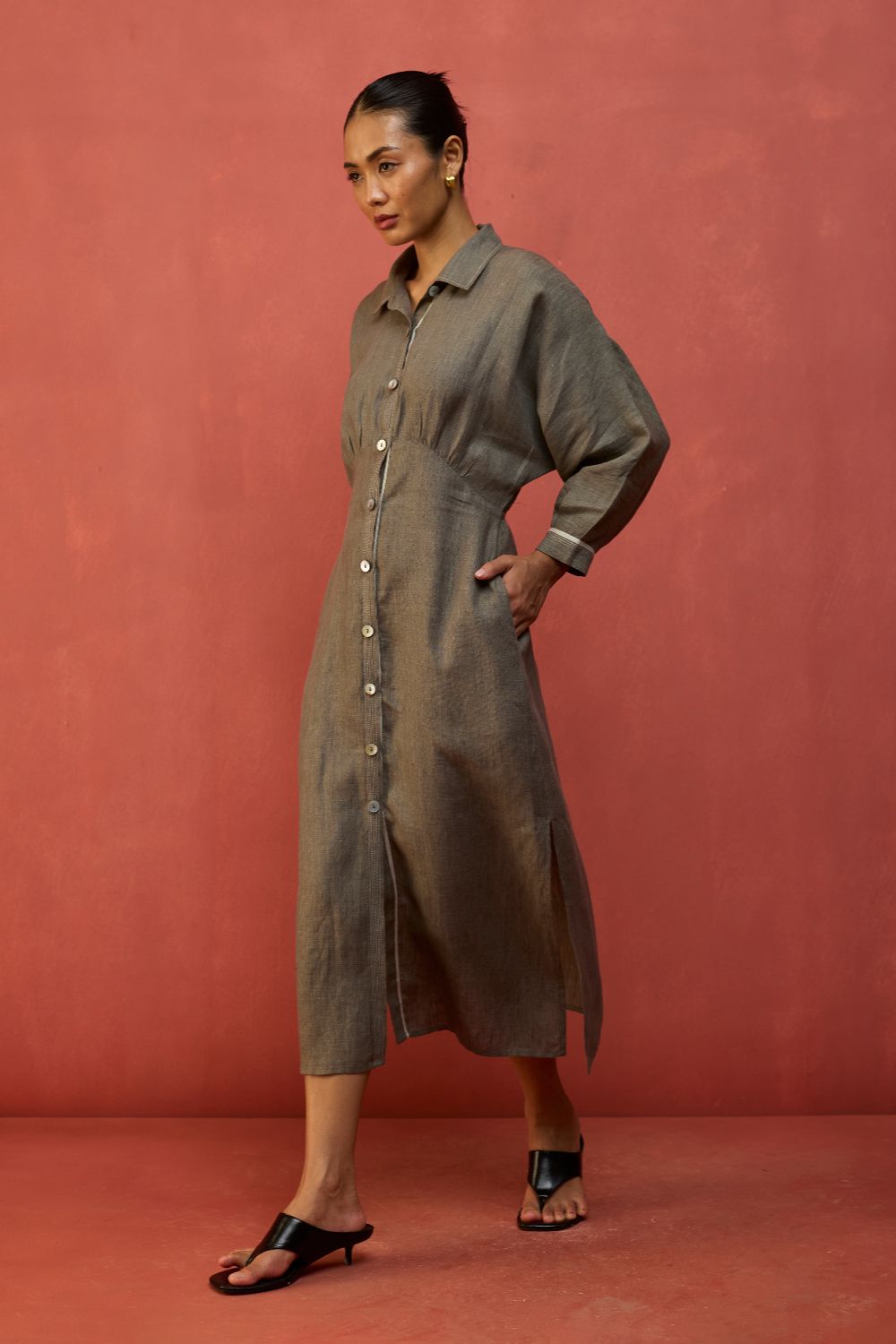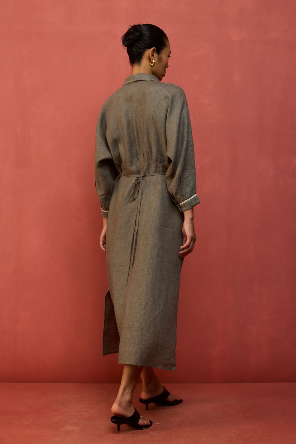 This buttoned flared dolman sleeve dress is thoughtfully designed in our signature yarn-dyed linen. It features a drawstring at the waist for a flattering, shaped silhouette along with contrast woven selvedge and top-stitch detailing along the sleeve cuffs and placket. The Masaru is elevated with oversized mother-of-pearl buttons and thoughtfully finished with pockets and side slits for ease of movement. Pair it with statement hoops or cuffs for a timeless look.