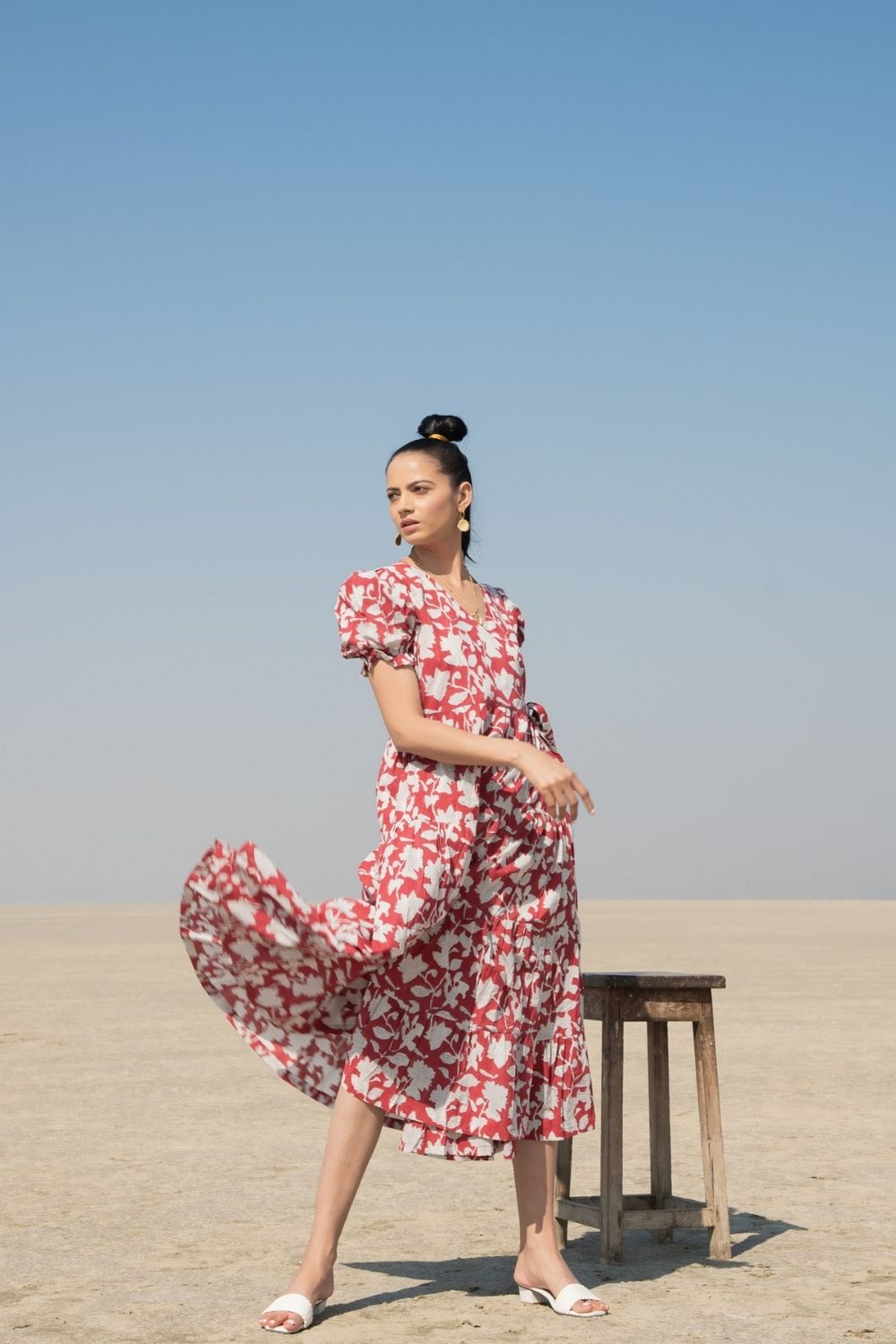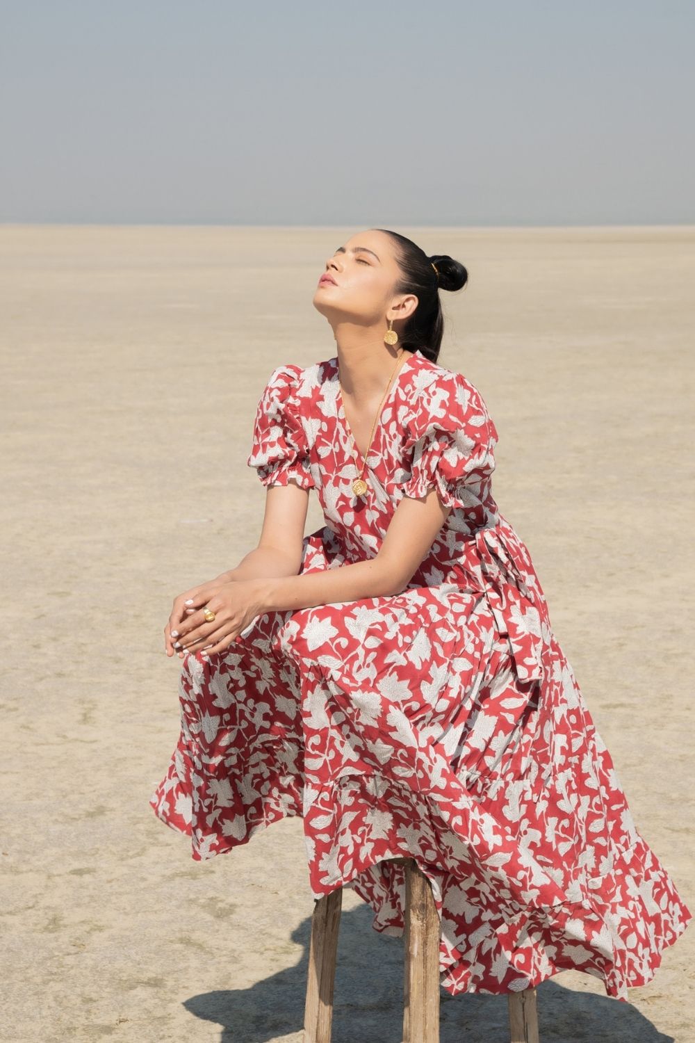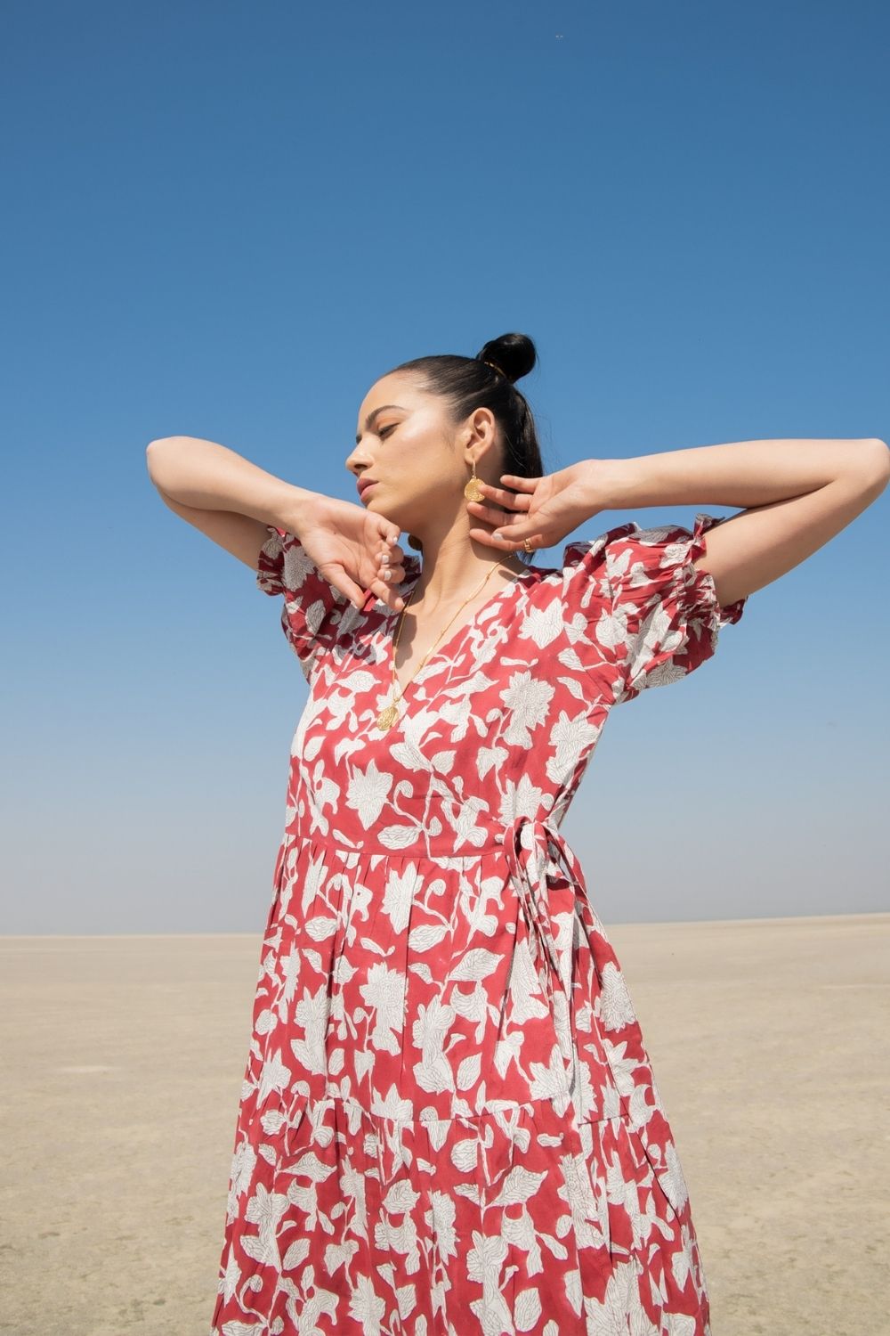 Wrap dresses are versatile and can be tied in multiple ways. This one is handblock printed with a soft lily print and has loads of volume and flounce. The puffed sleeves complete the look and tie it all together! Dress is down for a sunday brunch, or dress is up for an intimate dinner with friends.