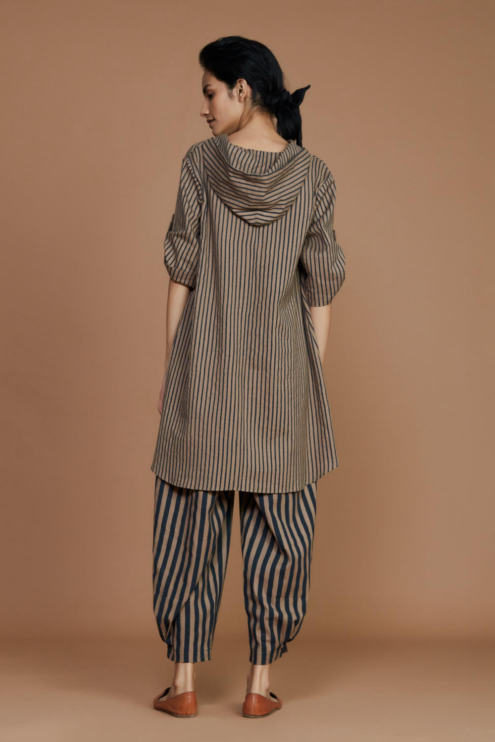 Handwoven Cotton With AZZO Free Dye - Brown with Charcoal hand block printed stripes