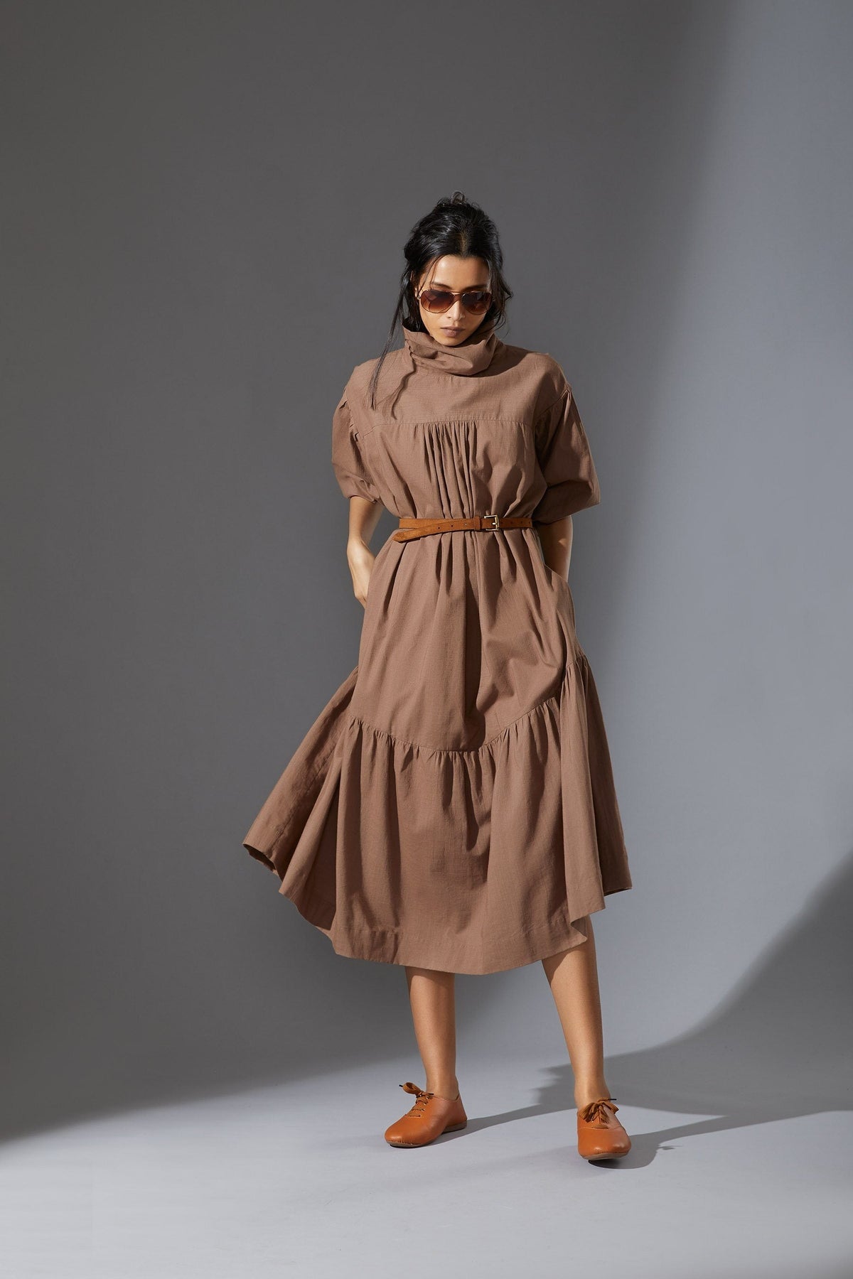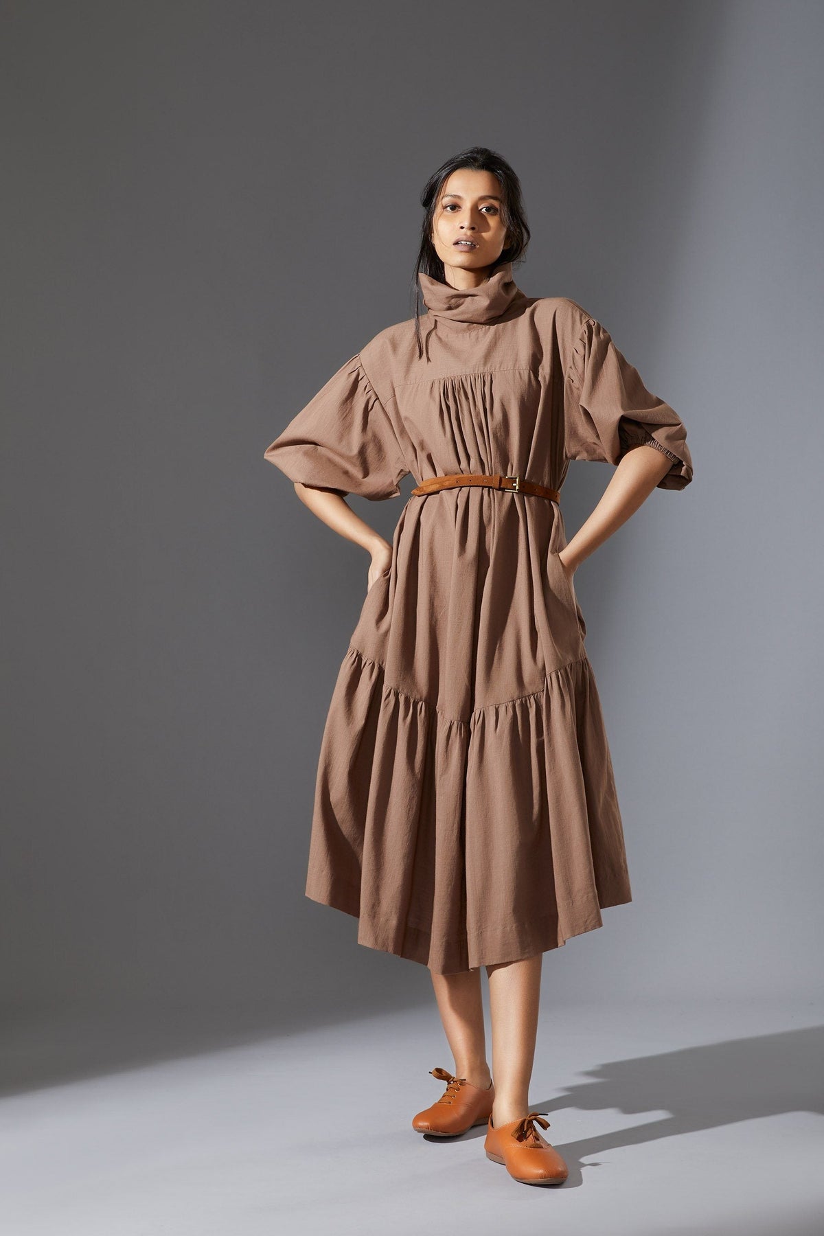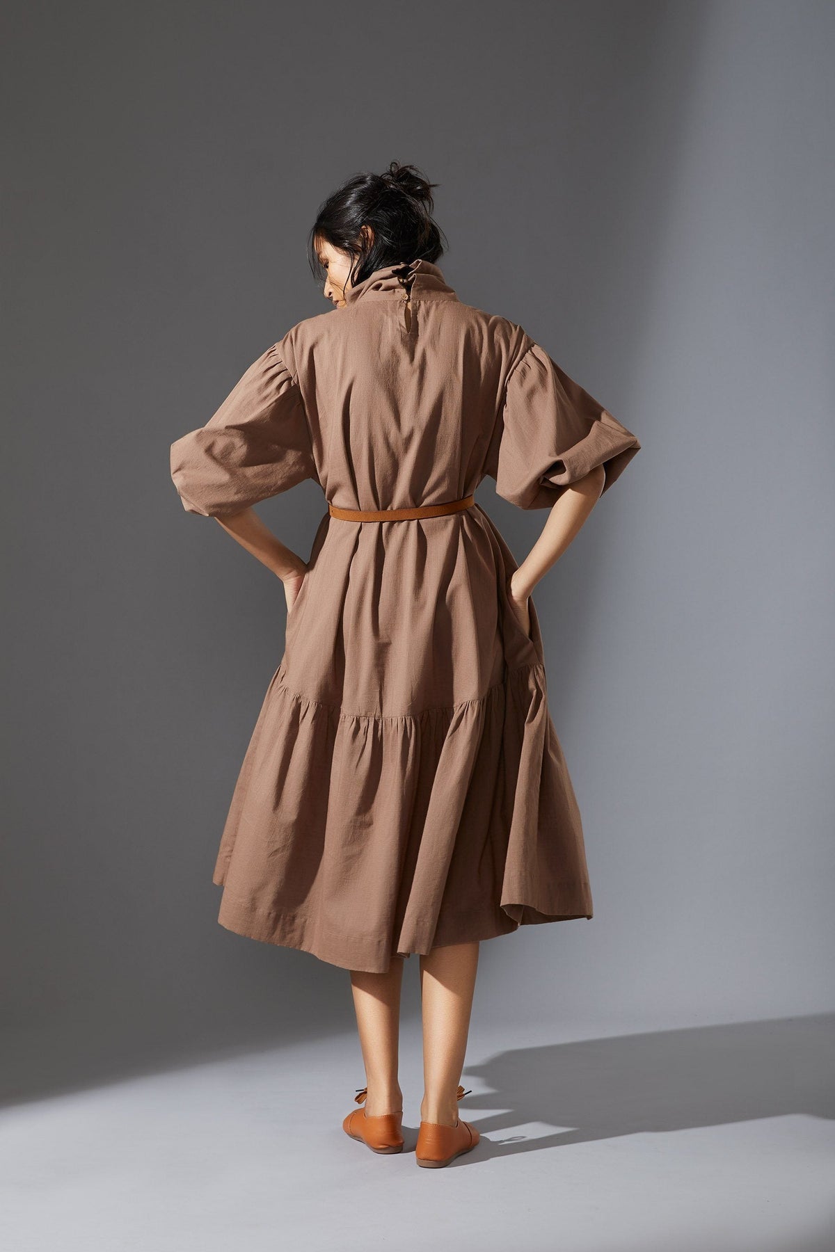 This fun and stylish dress is made with a luxurious handwoven cotton slub fabric. It has pretty blouson sleeves, high collar and an adjustable belt to define the loose shape. Style yours with lace-up sandals and a tote.